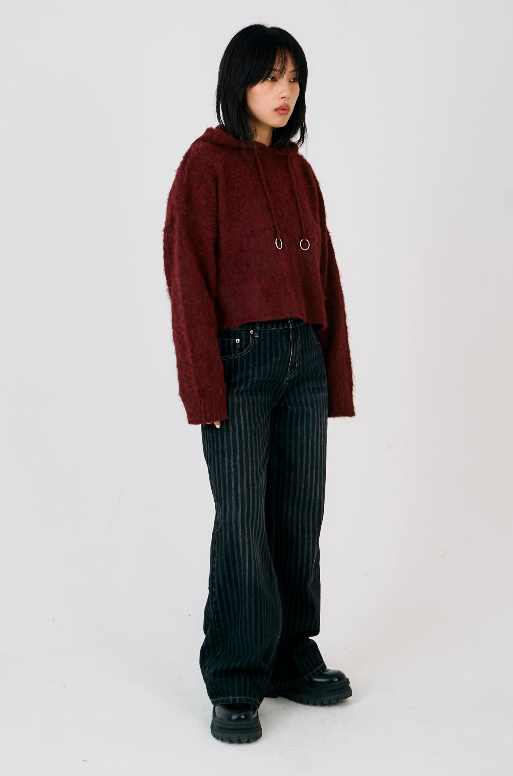 Burgundy fluffy, brushed knit hoodie with silver O ring hardware detail.