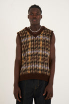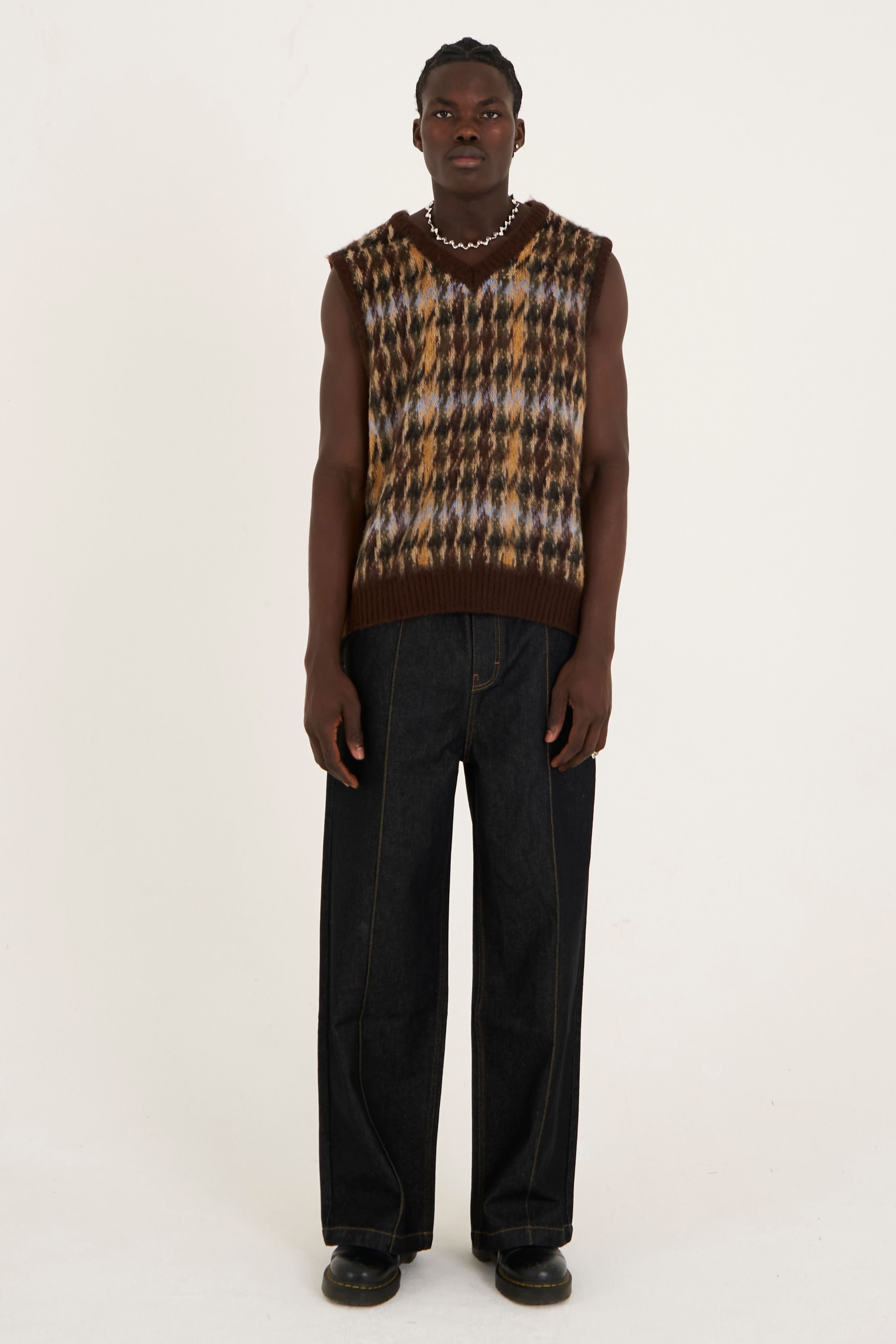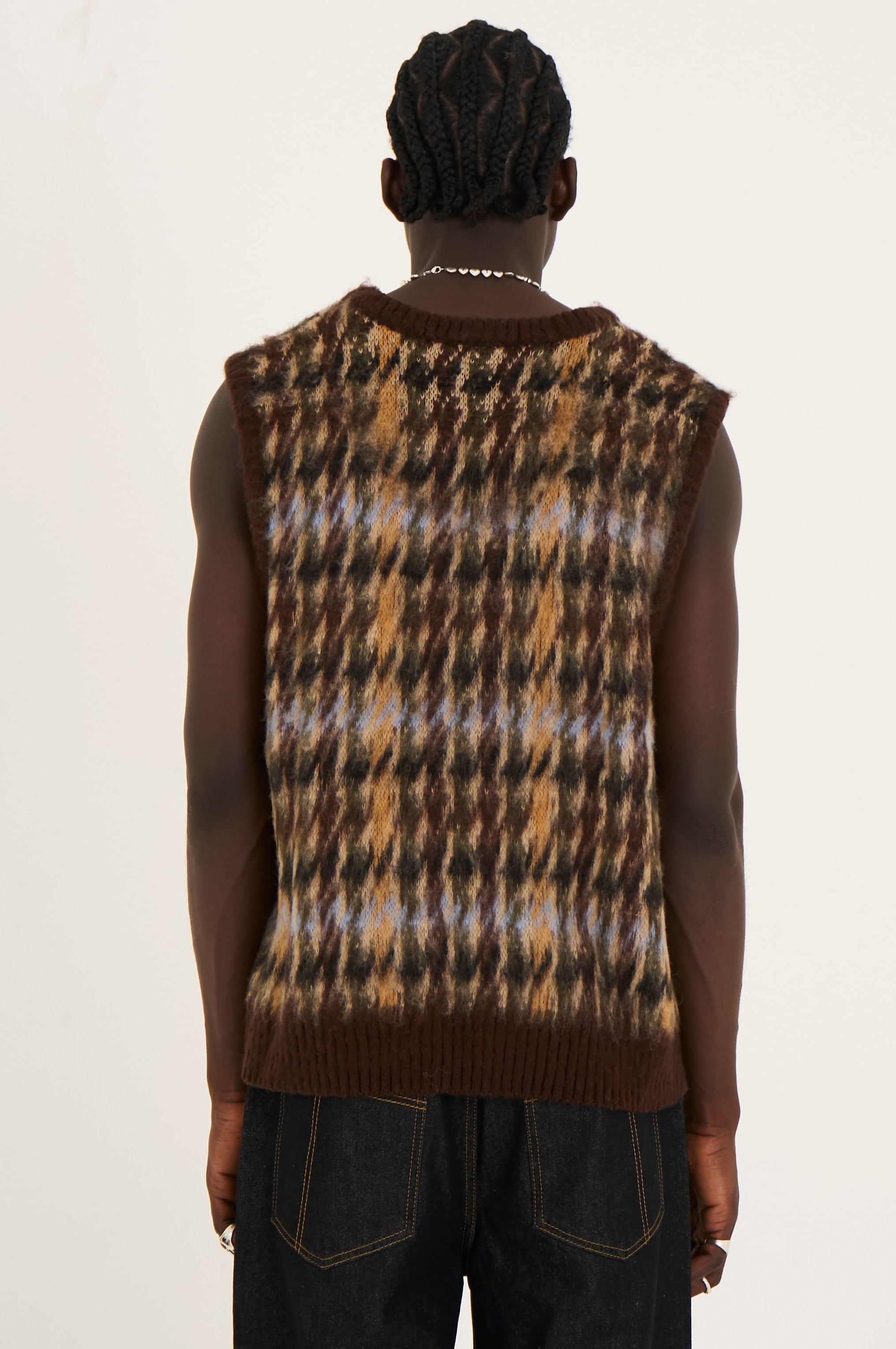 Houndstooth check oversized knit vest with yellow and blue contrast.