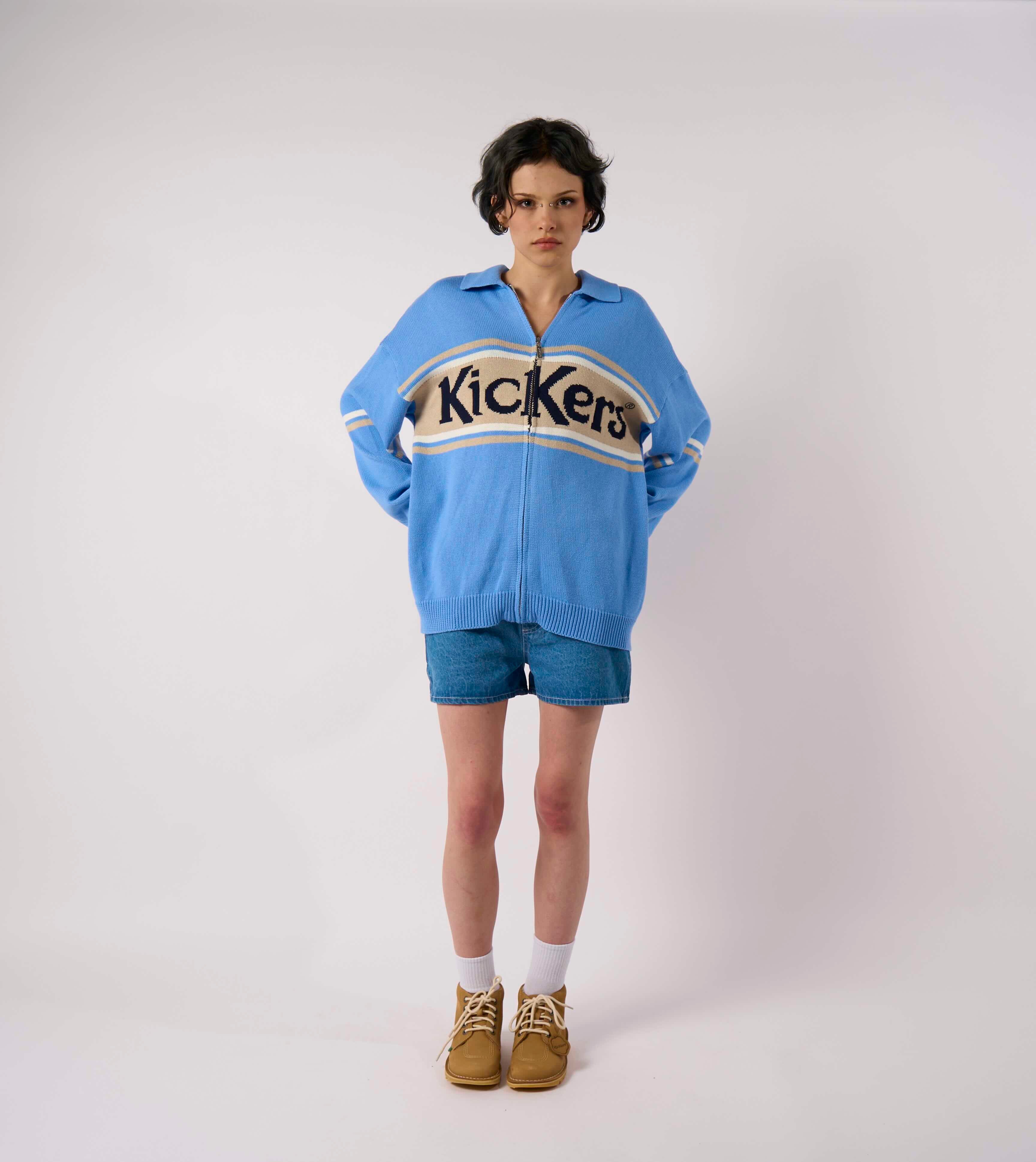90's inspired lightweight oversized zip-through knit with contrast stripe and Kickers logo panel.