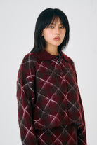 Burgundy argyle check knitted cardigan featuring a ribbed collar, in a supersoft textured fabrication. Match with our Estate Skirt to make a statement.