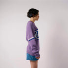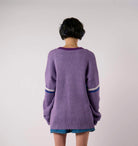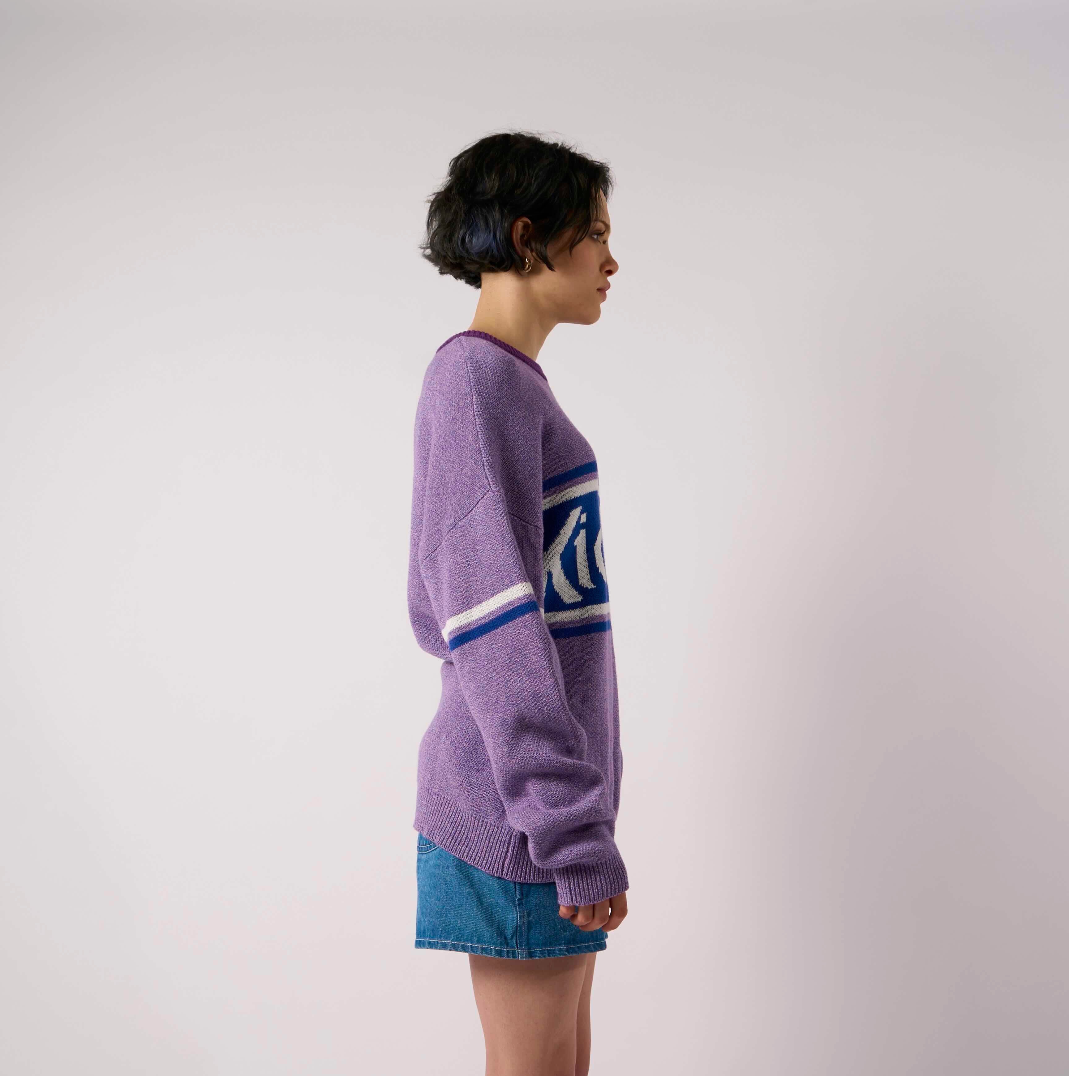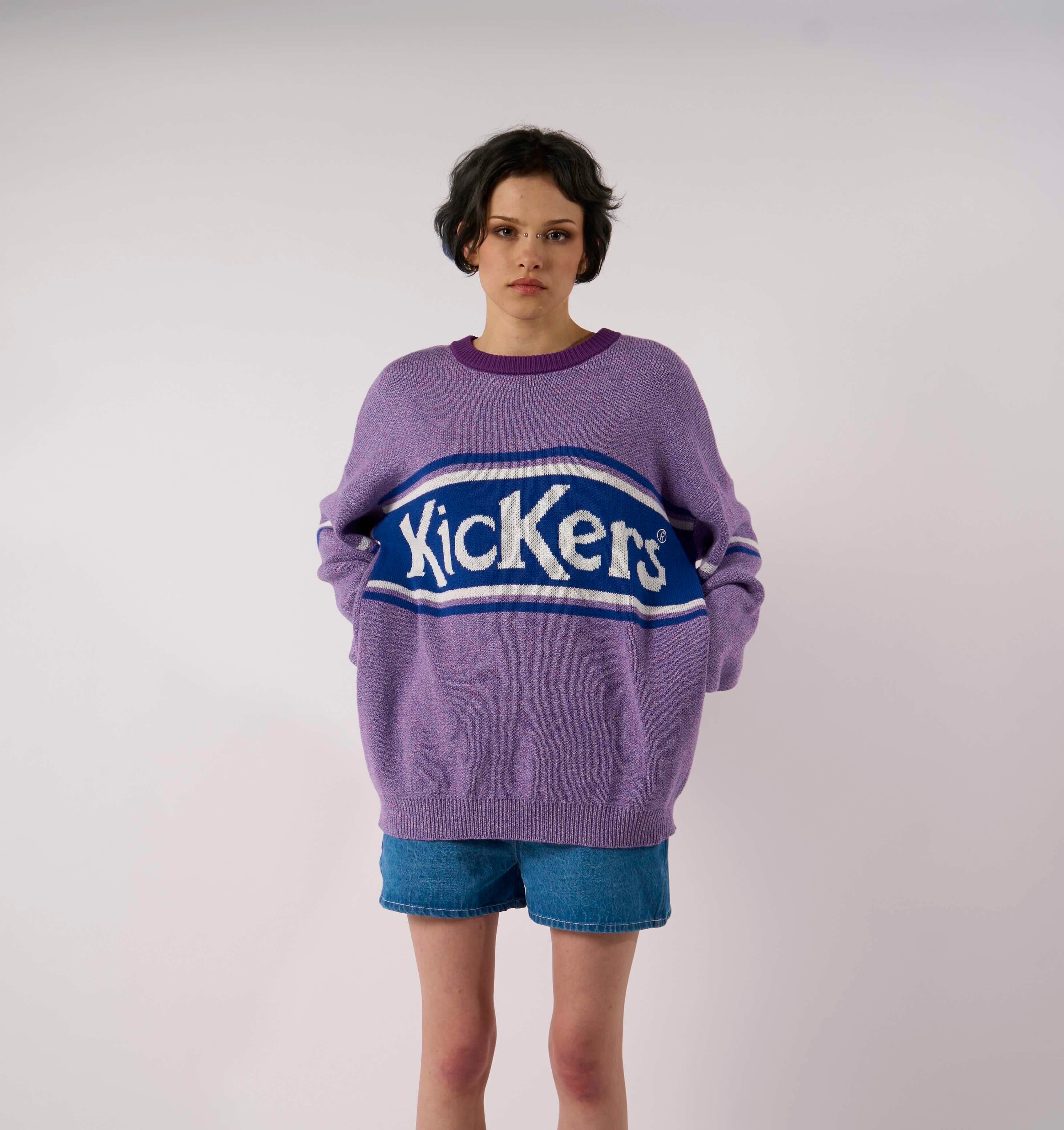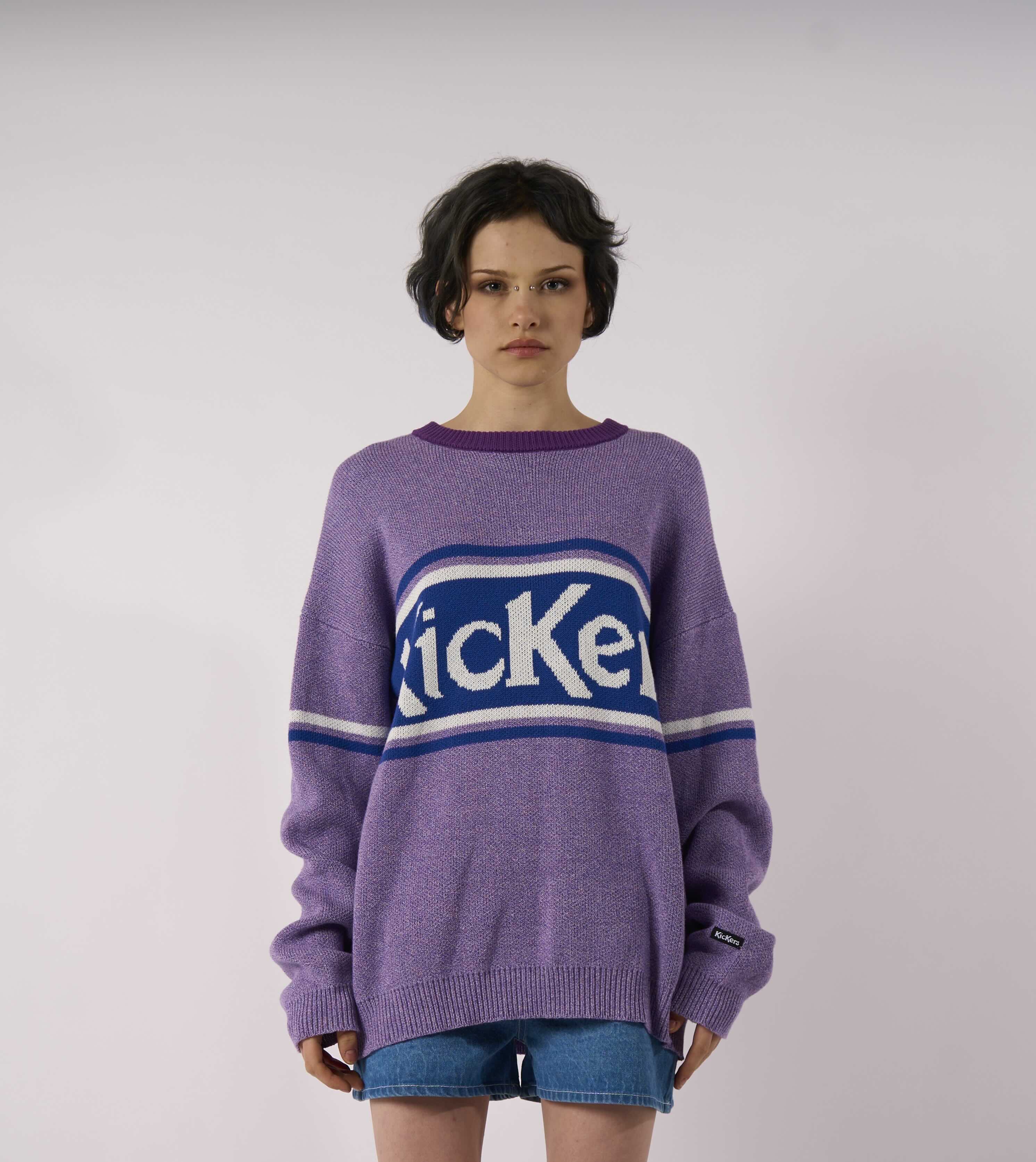 90's inspired oversized purple knit with contrast stripes and Kickers logo panel.