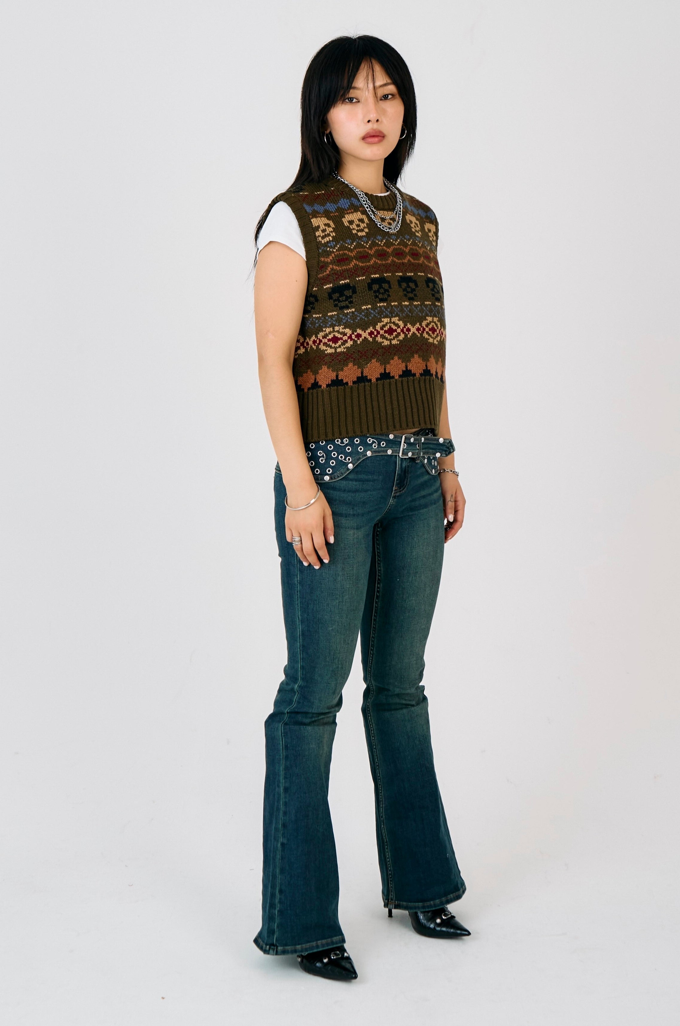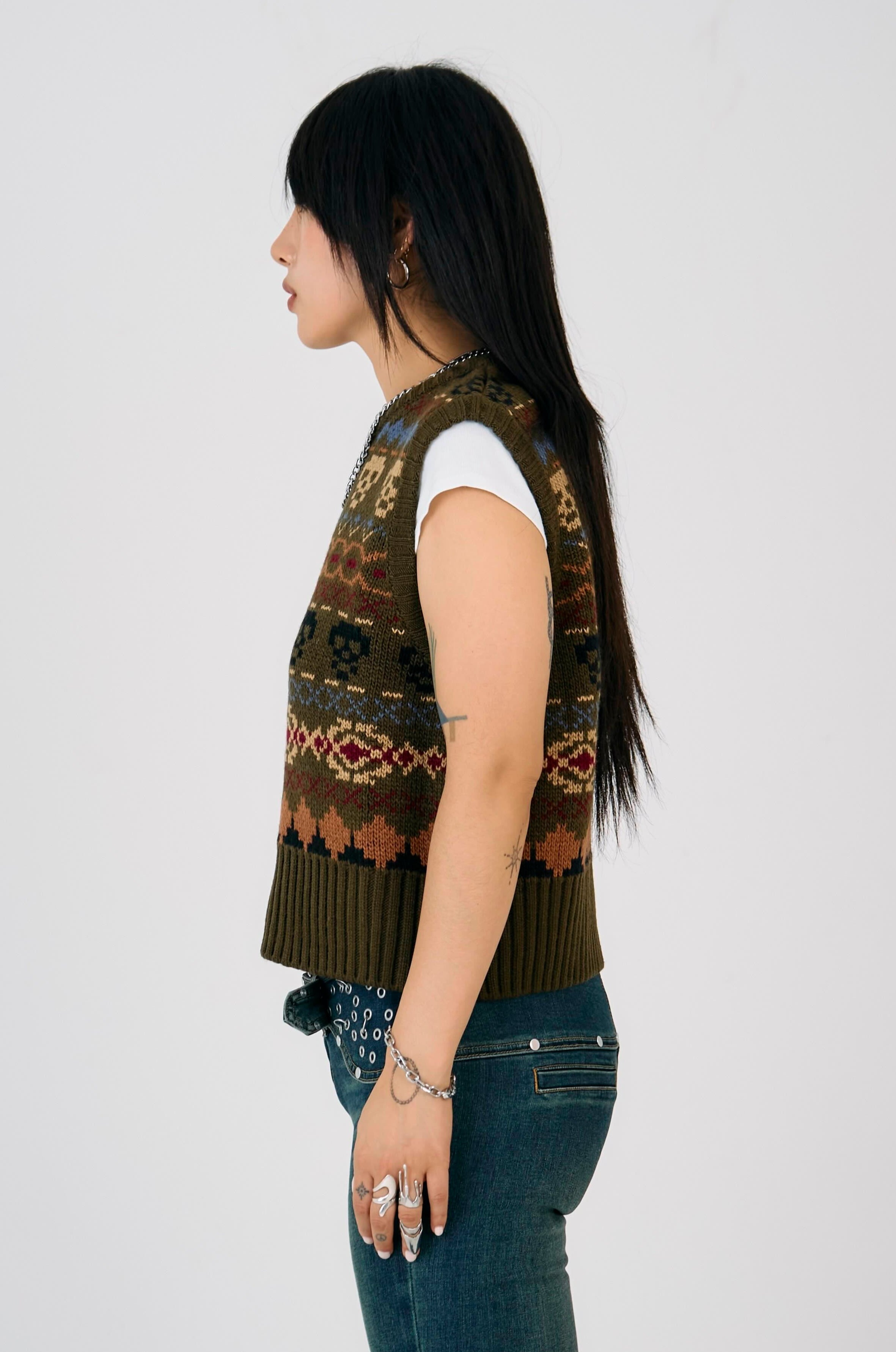 Shrunken knit vest with our grunge take on a classic fair isle, featuring skull pattern.