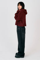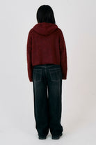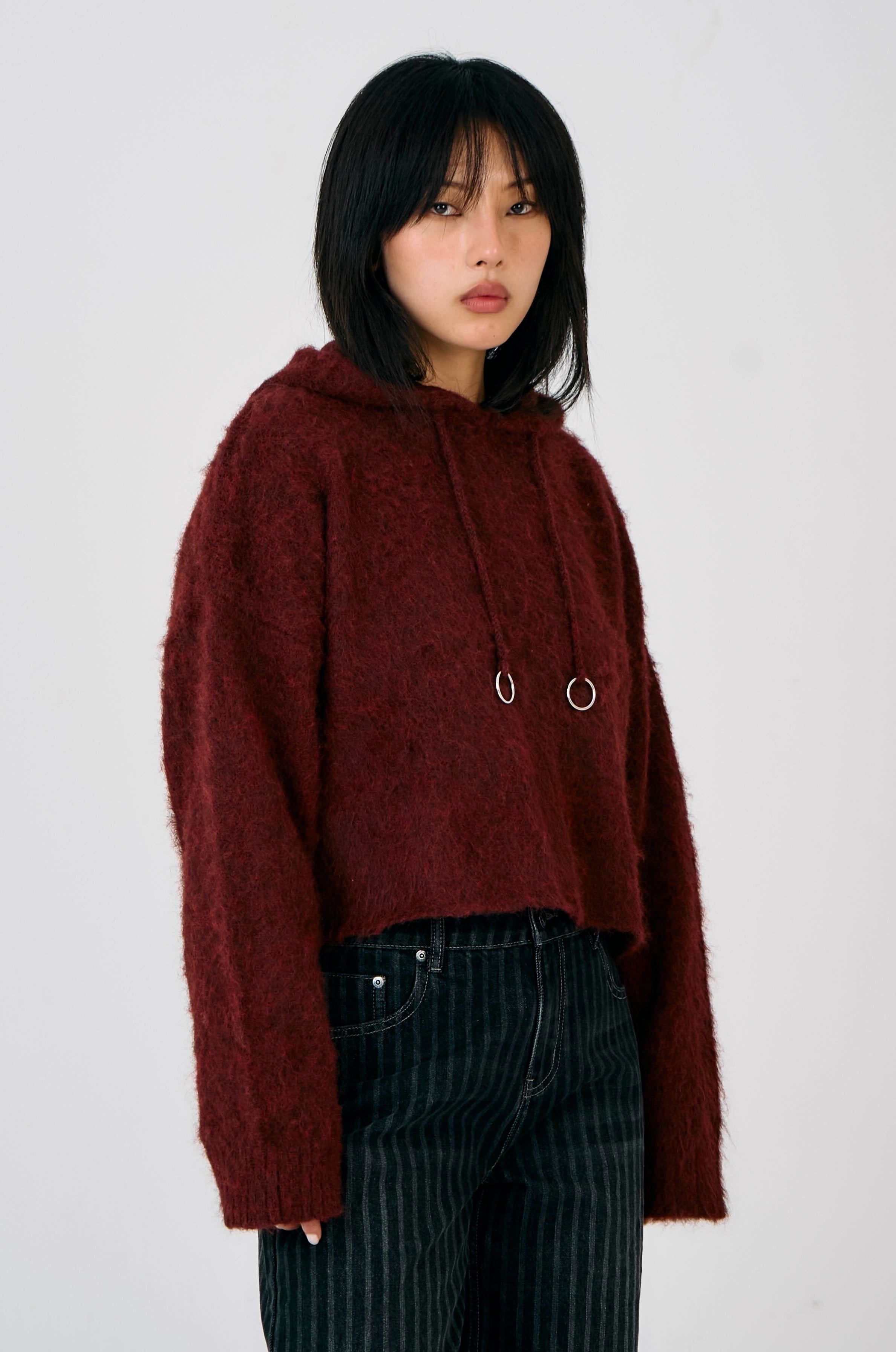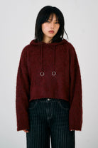 Burgundy fluffy, brushed knit hoodie with silver O ring hardware detail.