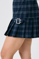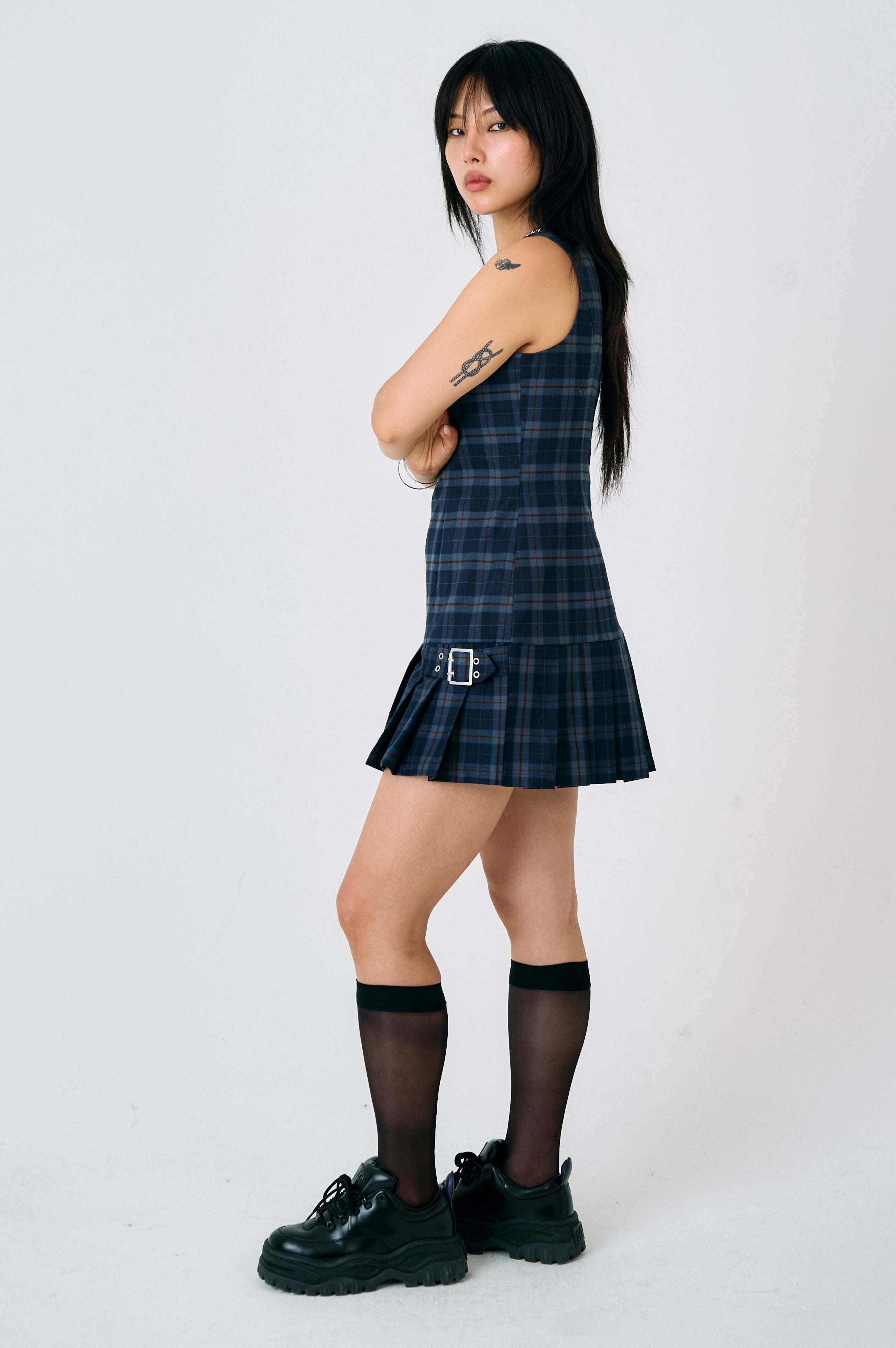 Blue check mini dress with a drop waist and pleated skirt. Featuring silver eyelet detail buckles at the side for a tailored fit with edge.
