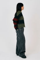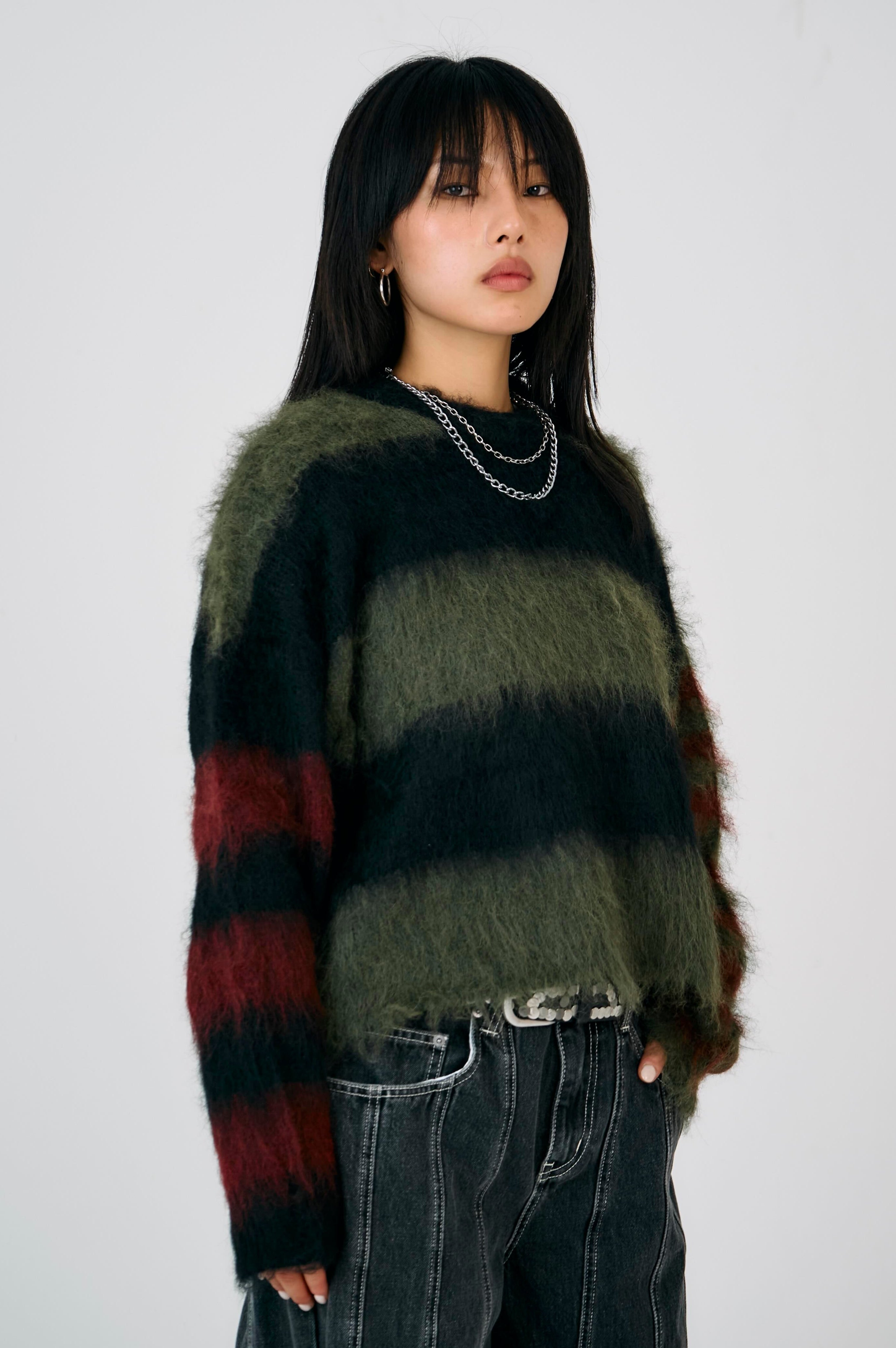 A Ragged staple made to stand out - meet the Humbug Knit. Fluffy, brushed knit in a black and khaki bold stripe, with contrast red and black stripe sleeves.