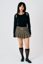 Houndstooth check pleated mini skirt with a drop waist and a silver eyelet detail belt.
