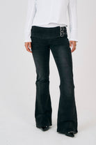 Vintage washed black bootcut flare jeans with double buckle detail. Designed in a vintage-inspired cut with a worn-in finish.