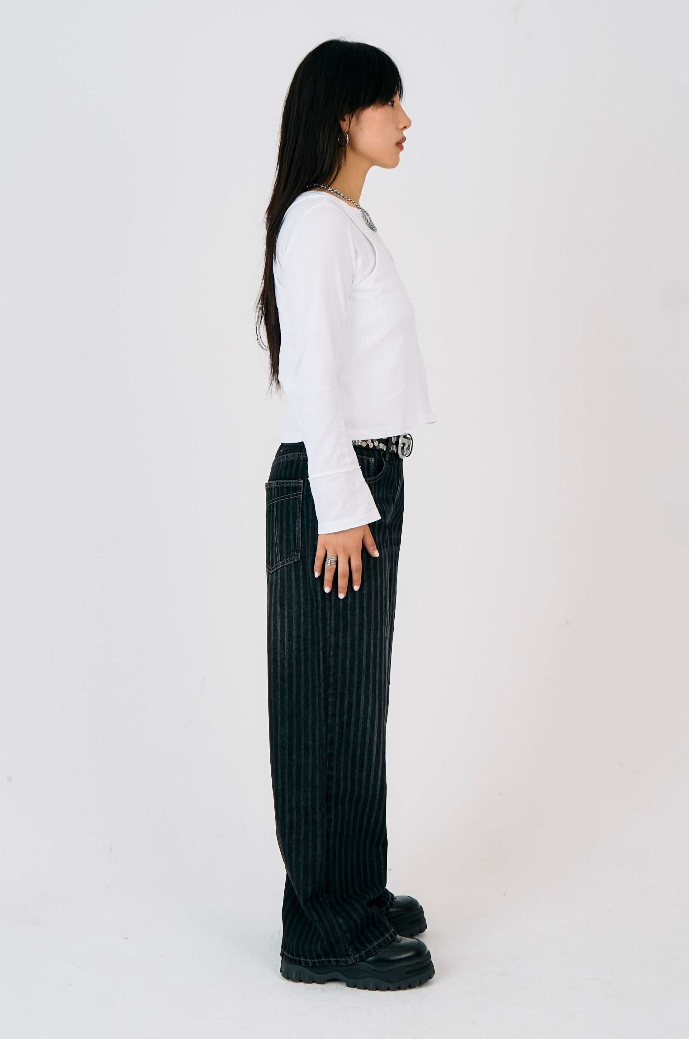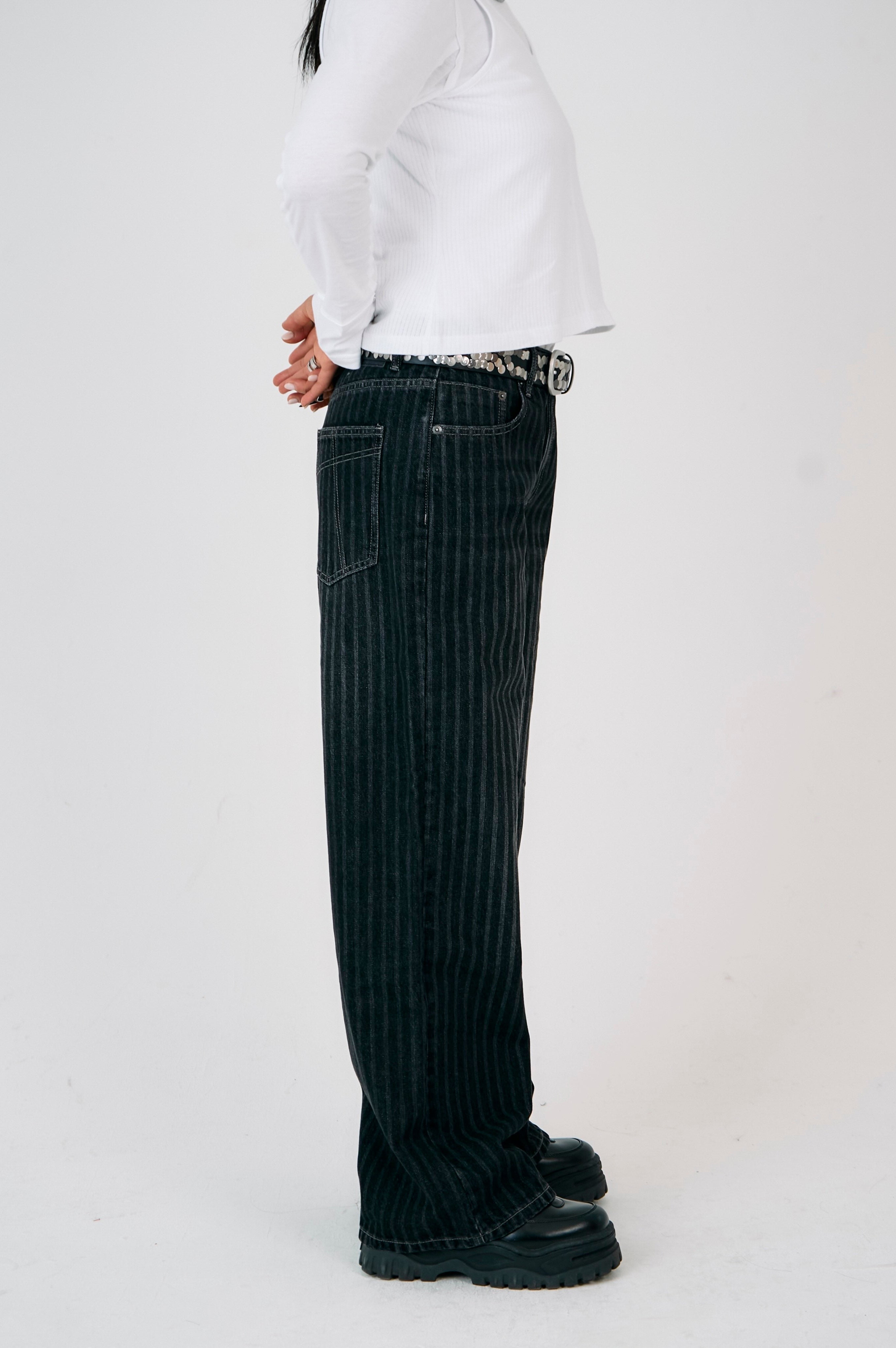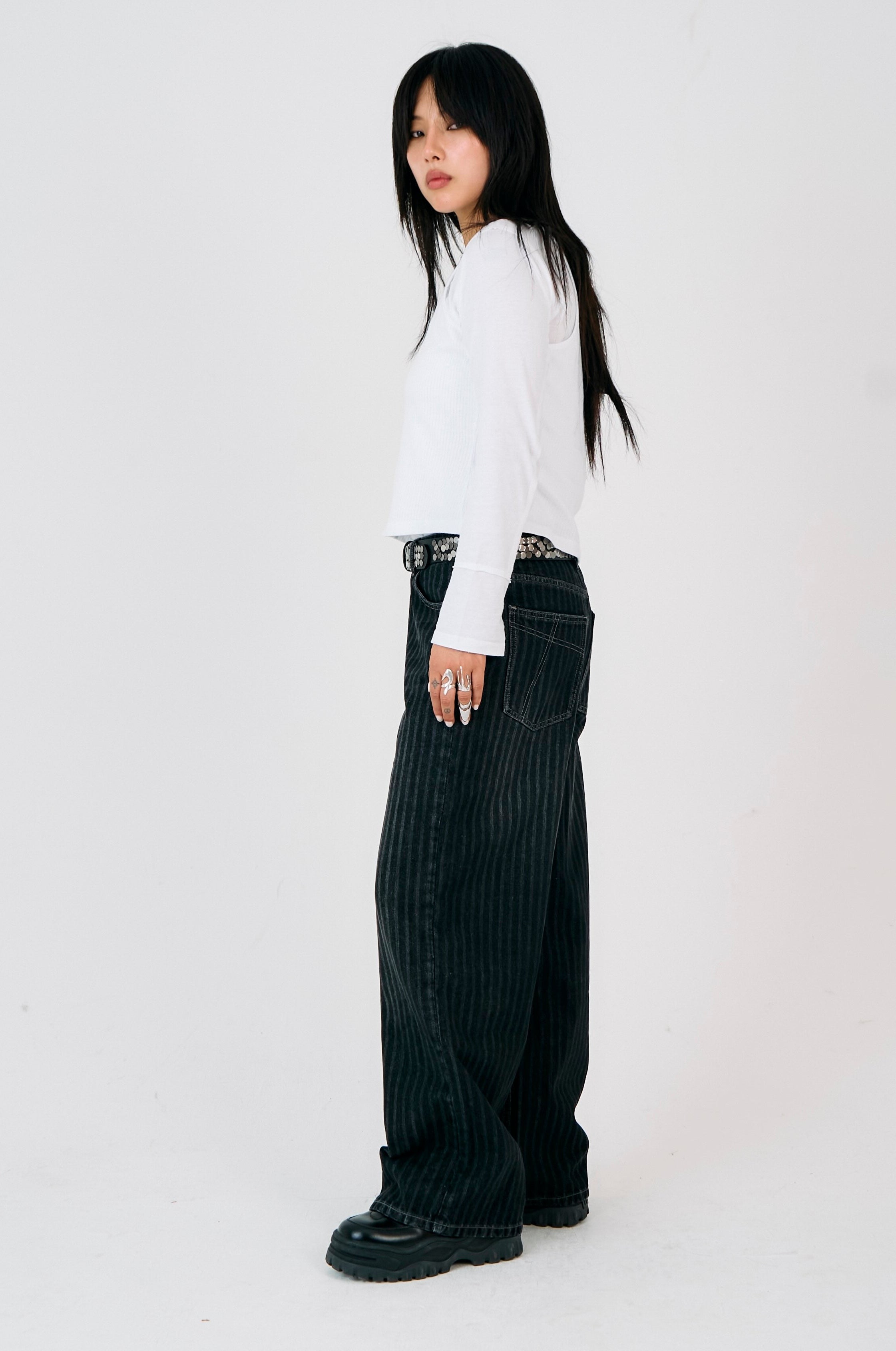 Our iconic Release Jean - ultra baggy, slouchy wide leg in a washed charcoal pinstripe.