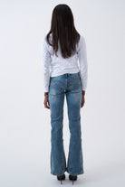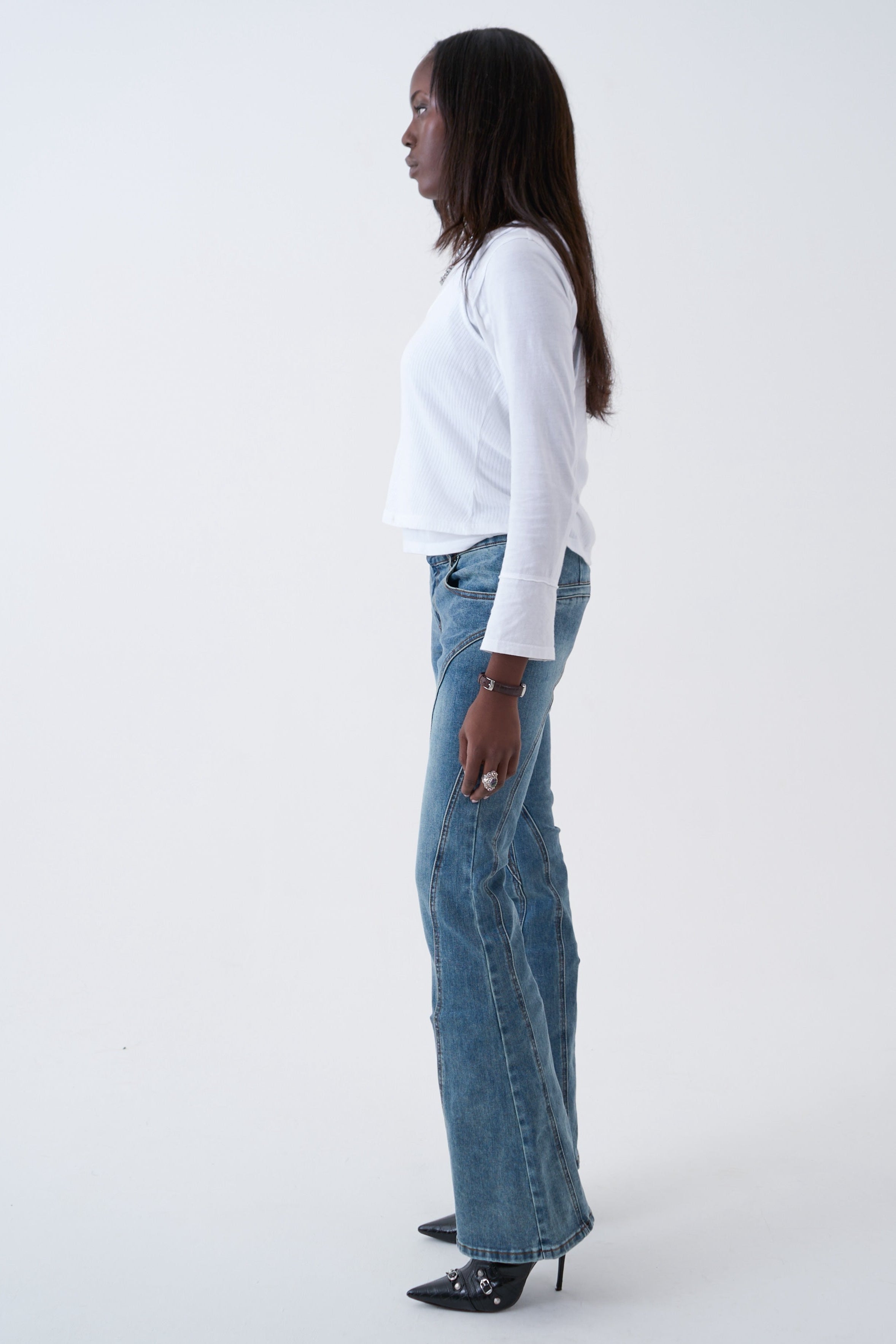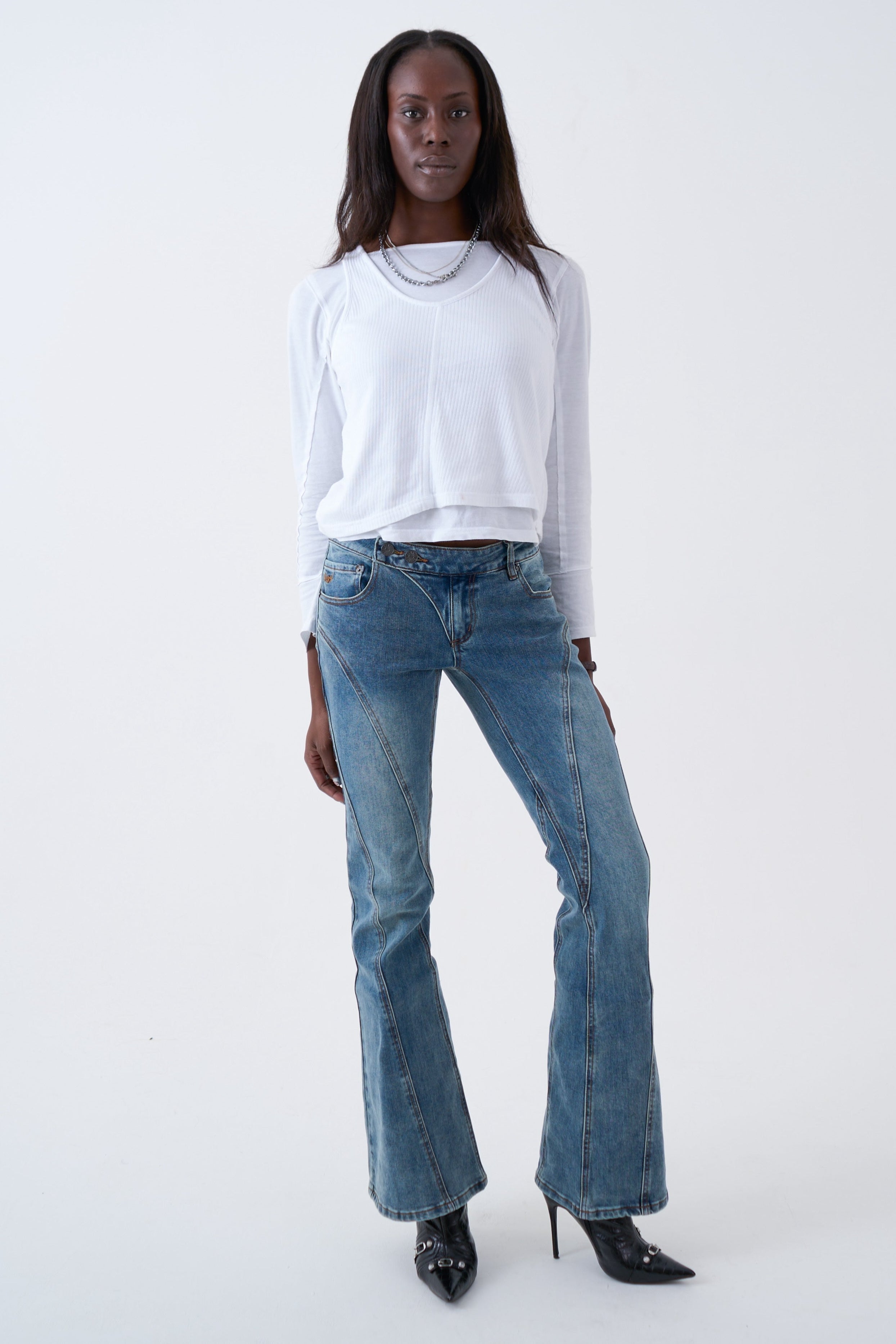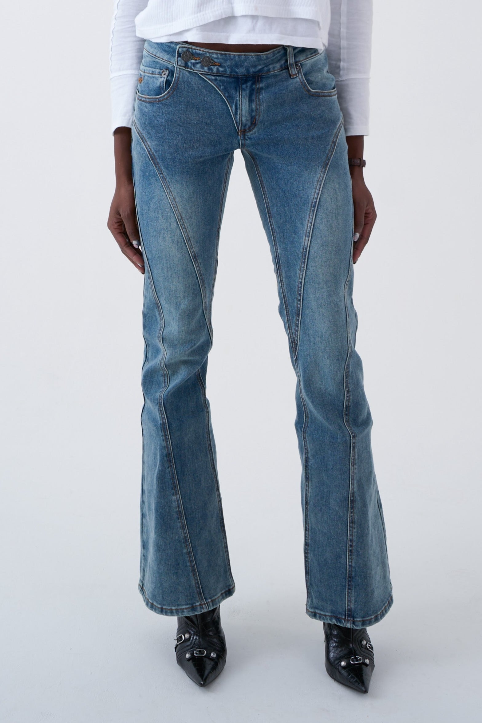 Dirty blue wash biker style stretch flare jeans with seamed panels and asymmetric waistband detail.