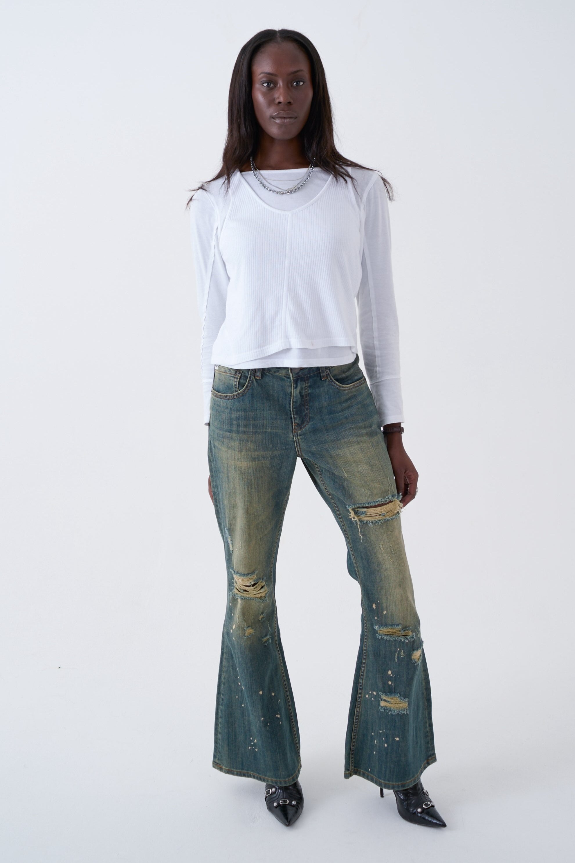 Extreme distressed vintage dirty rinse wash bootcut jean