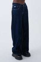 Our iconic Release Jean - ultra baggy, slouchy wide leg in a dark indigo rinse wash