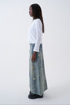 5 pocket denim maxi skirt with front split in snakeskin print, with distressed details for a grunge finish.
