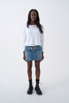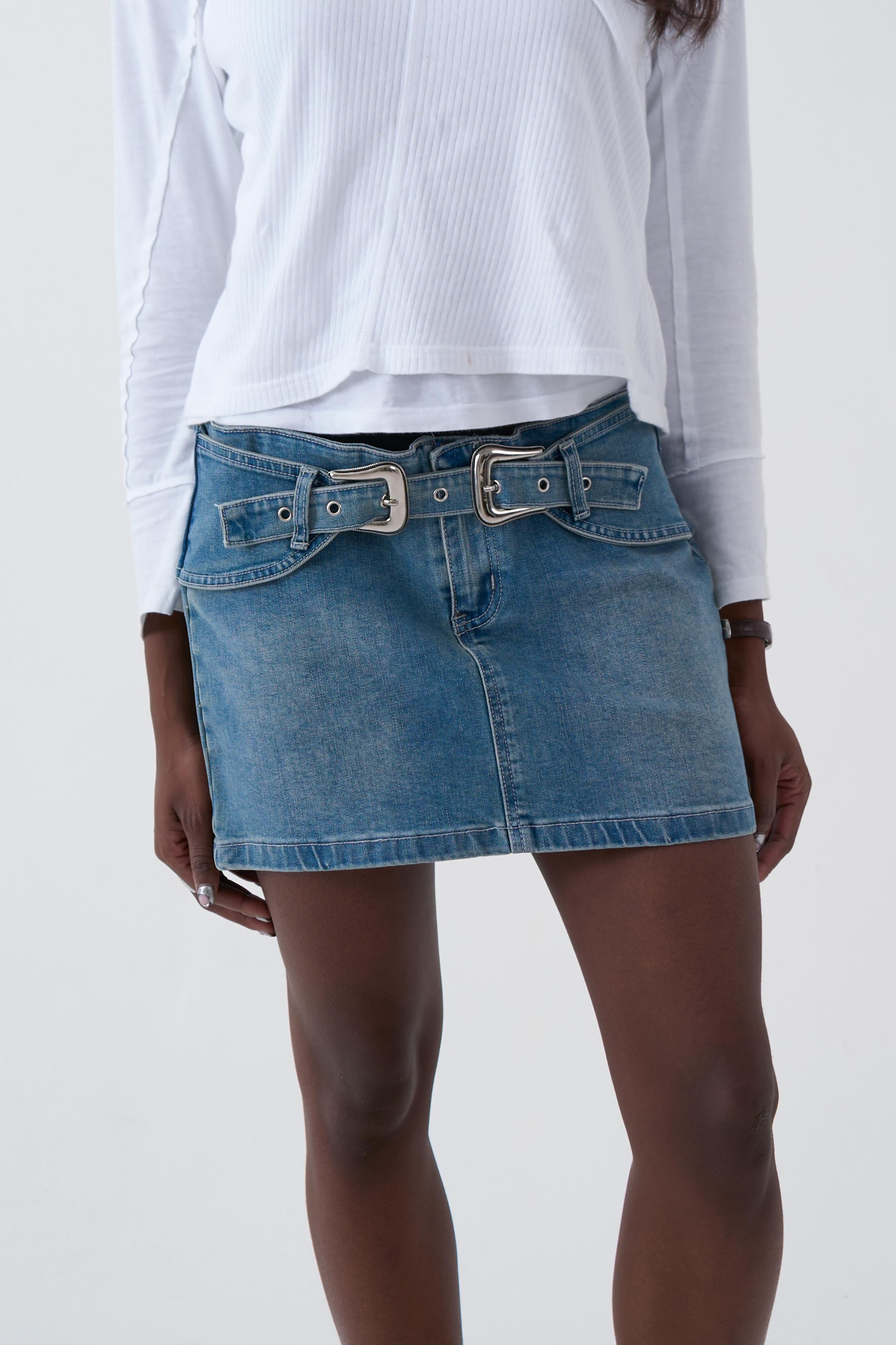 Mid blue wash denim mini skirt with statement double buckle western belt