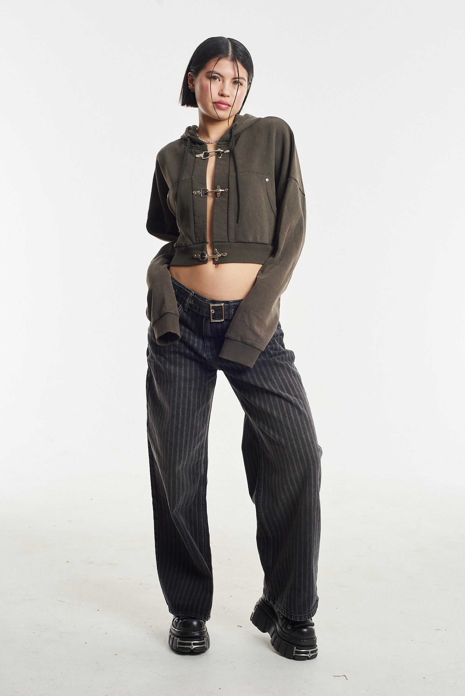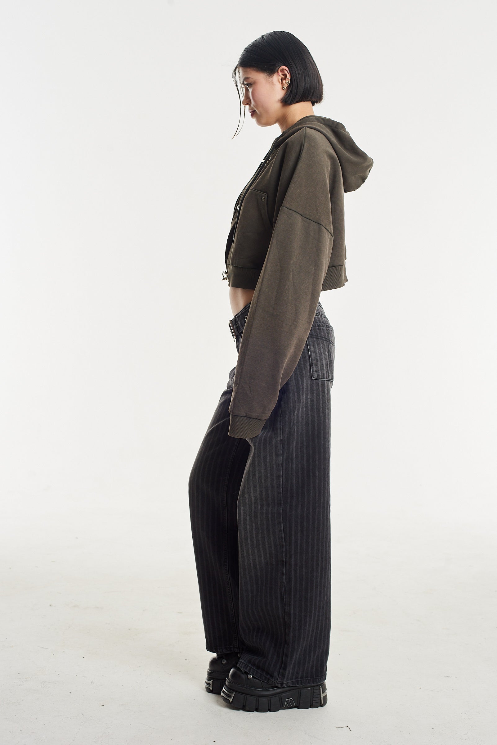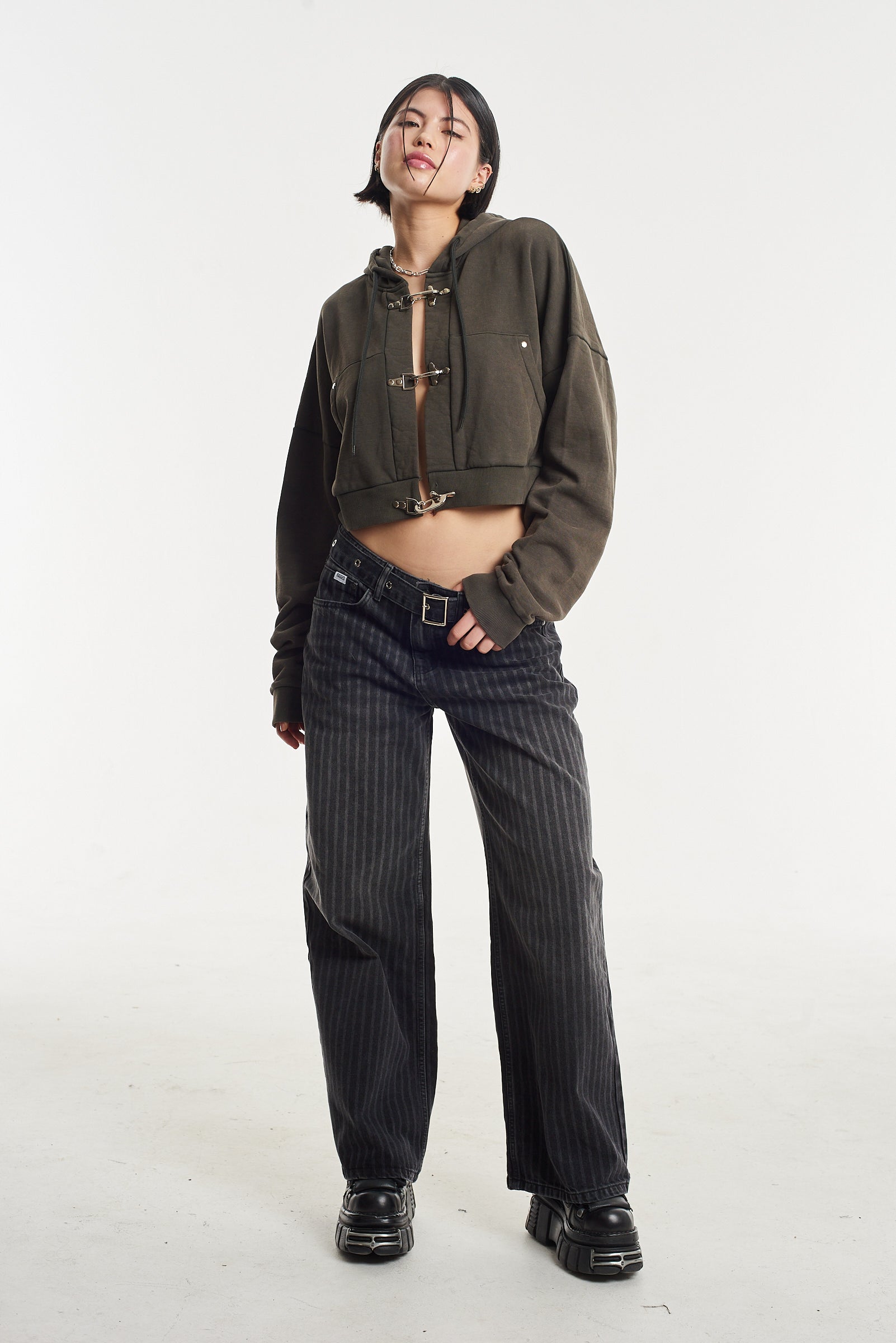 Our iconic Release Jean, in a washed charcoal pinstripe. Featuring an eyelet detail denim belt