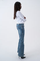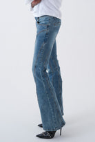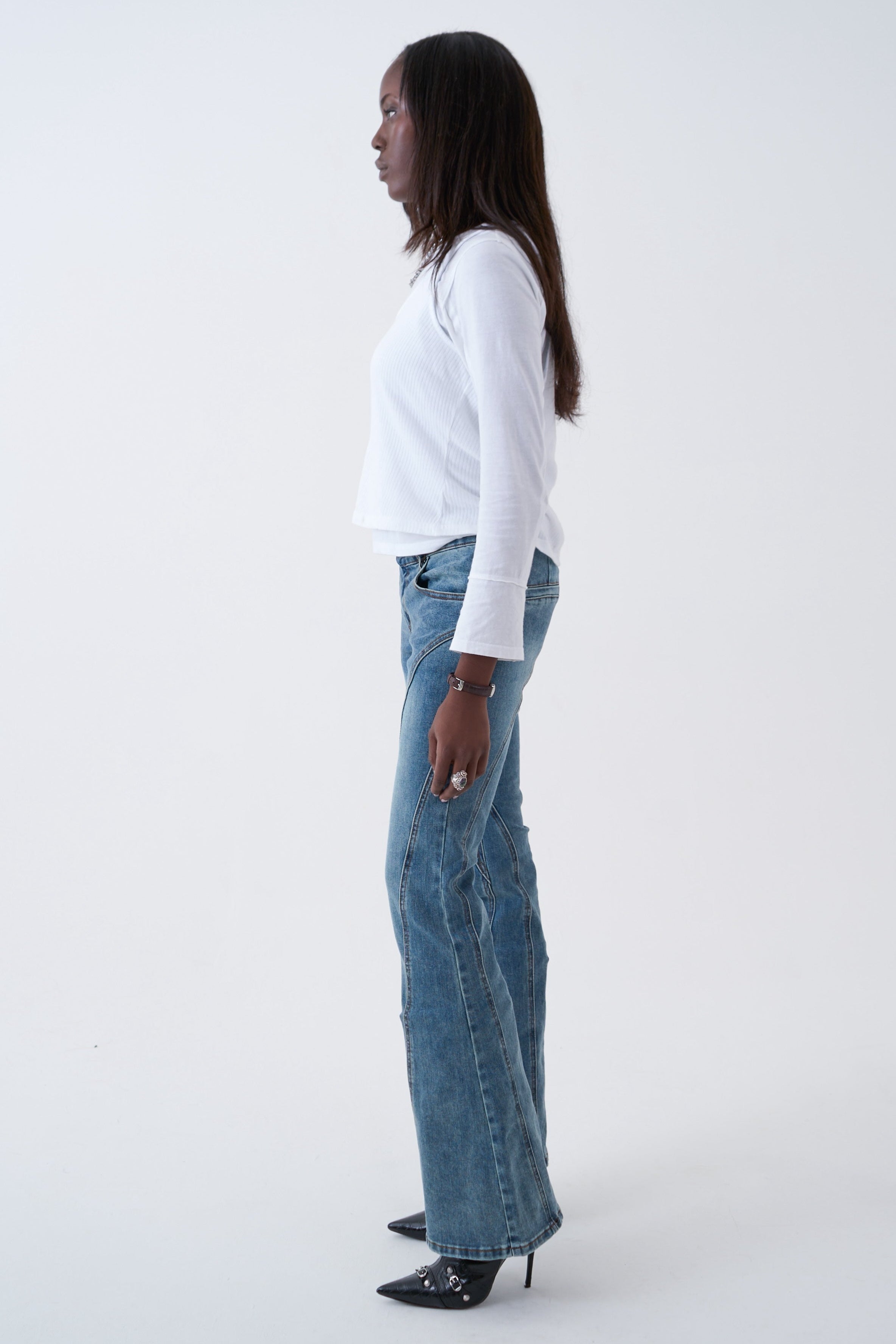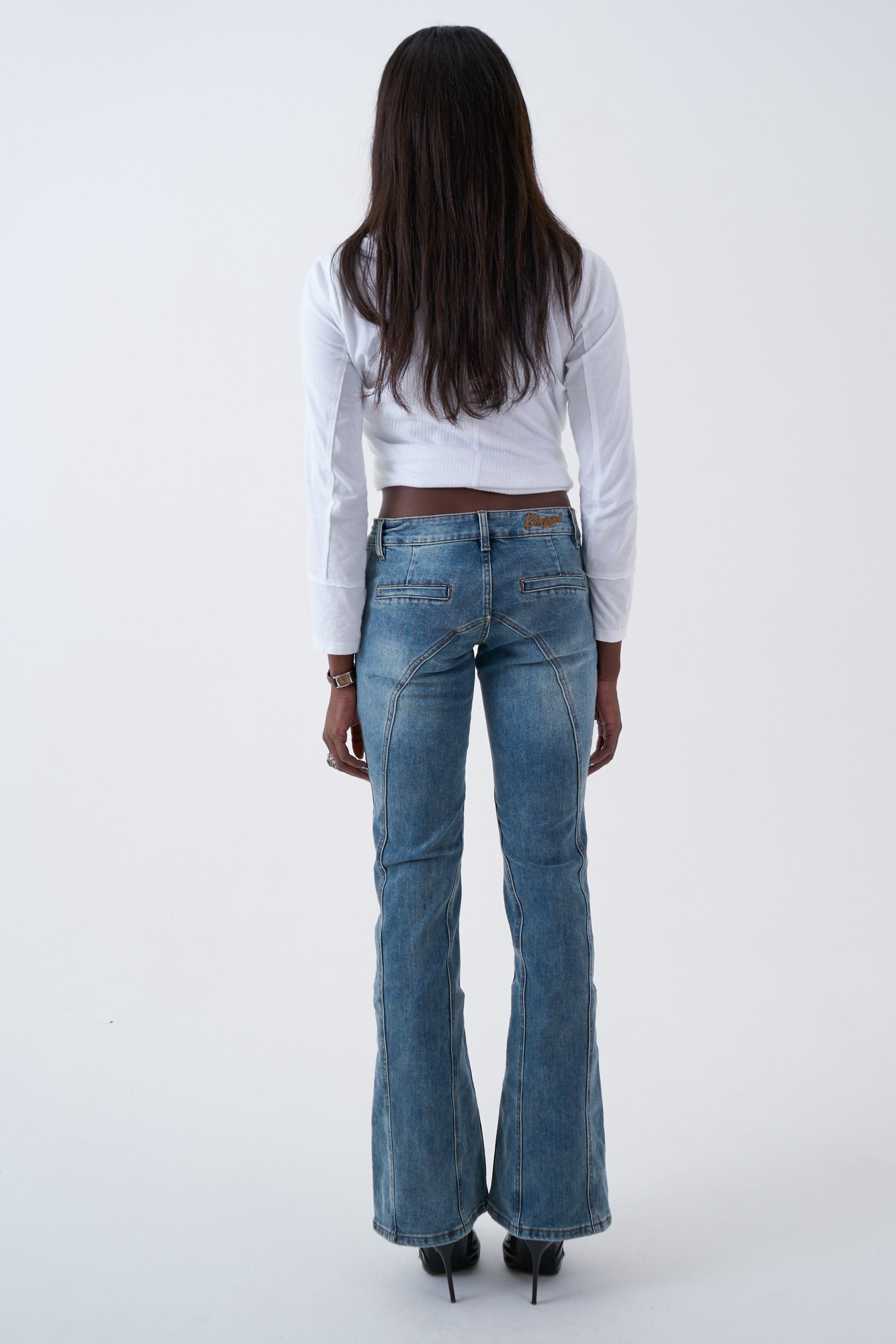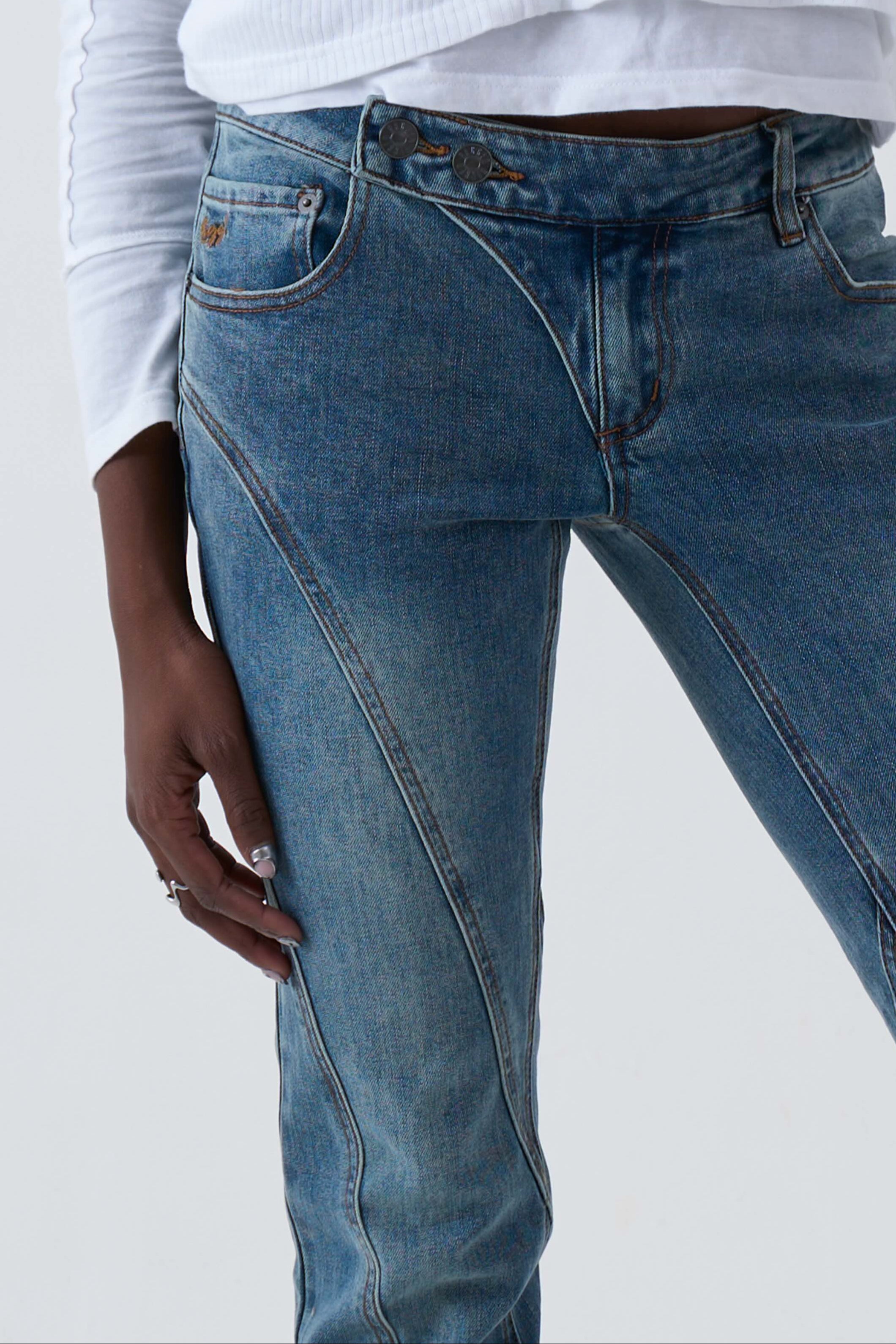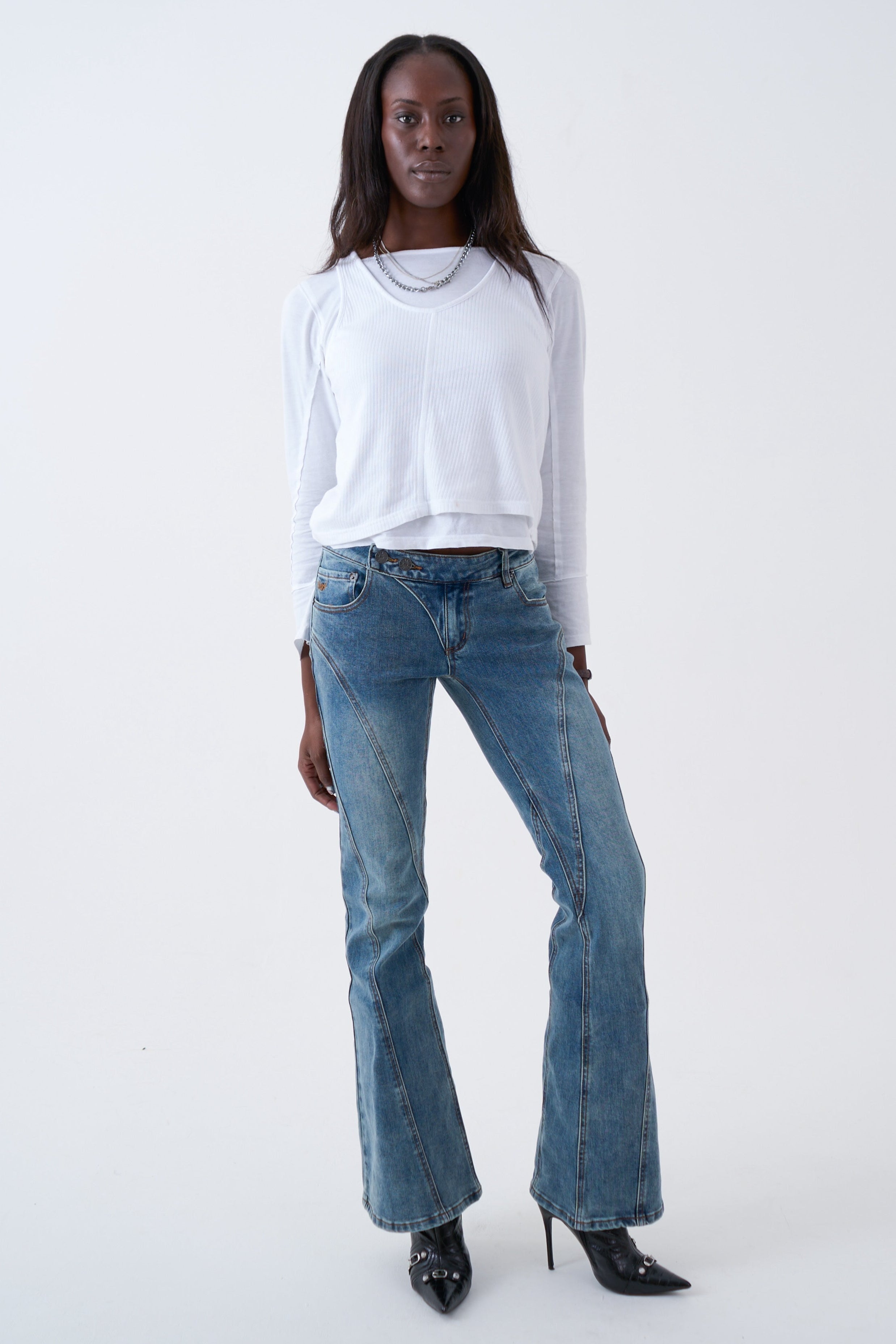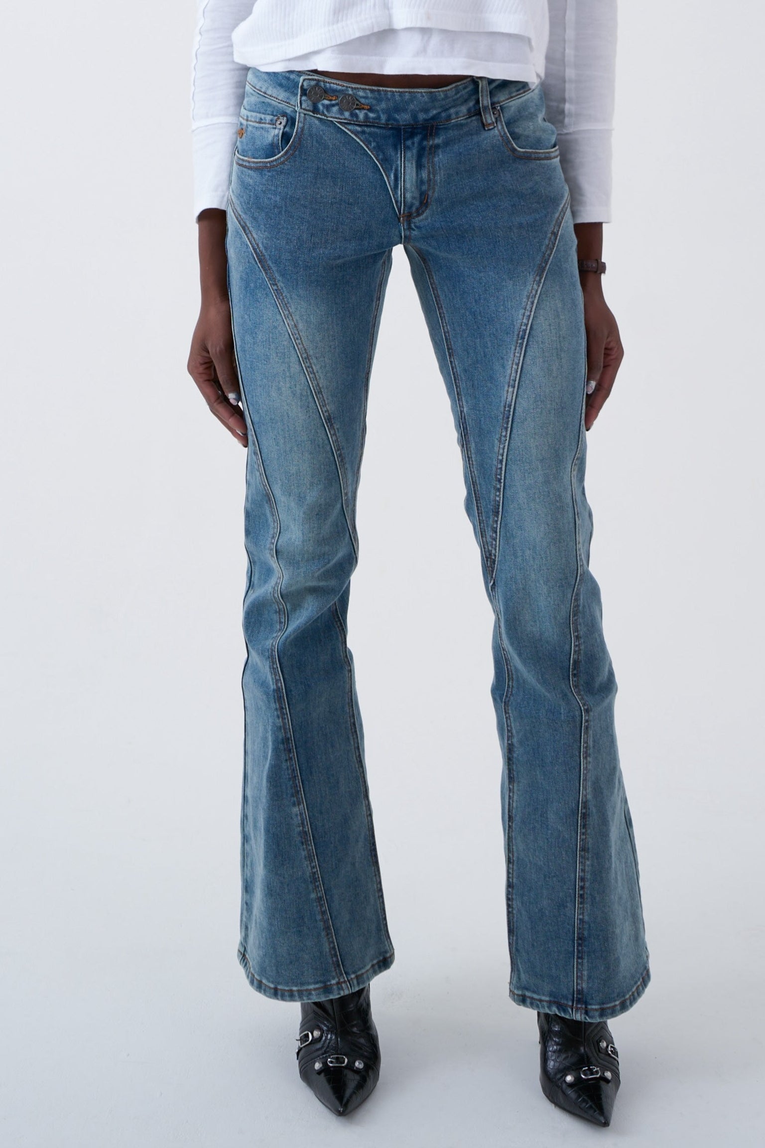Dirty blue wash biker style stretch flare jeans with seamed panels and asymmetric waistband detail.