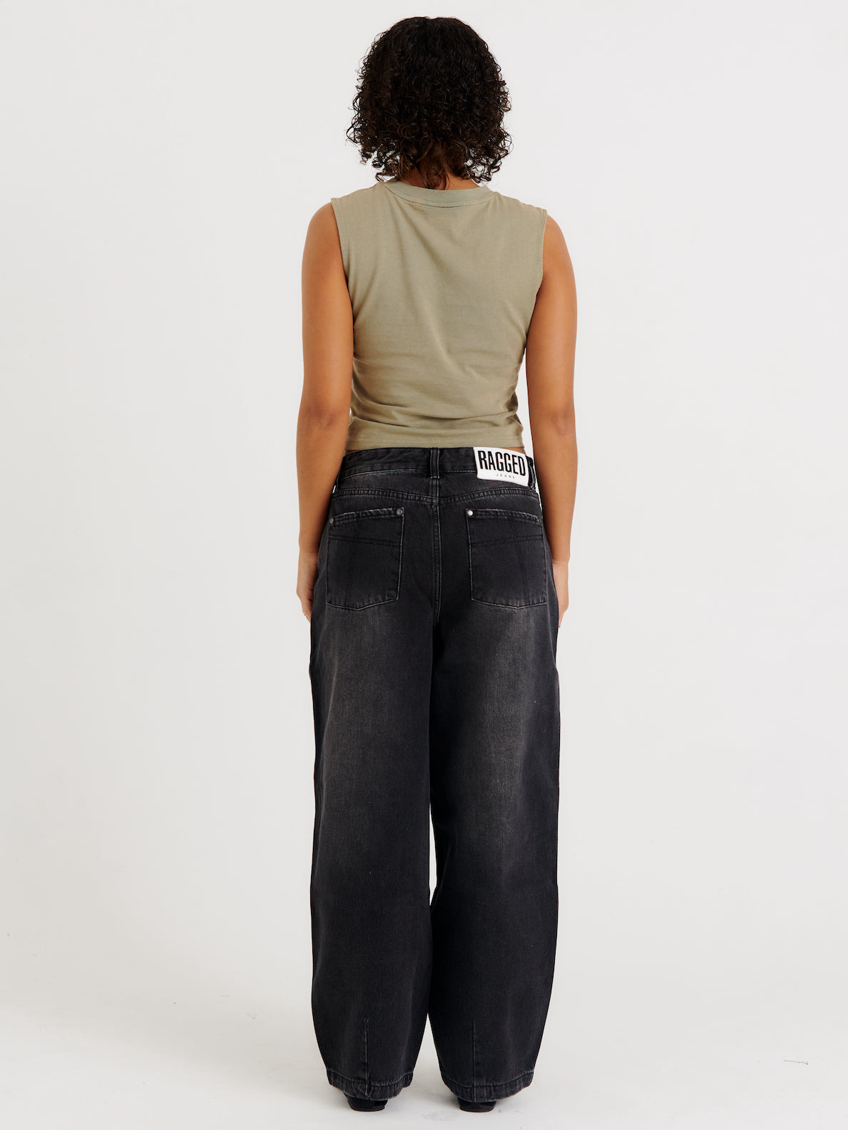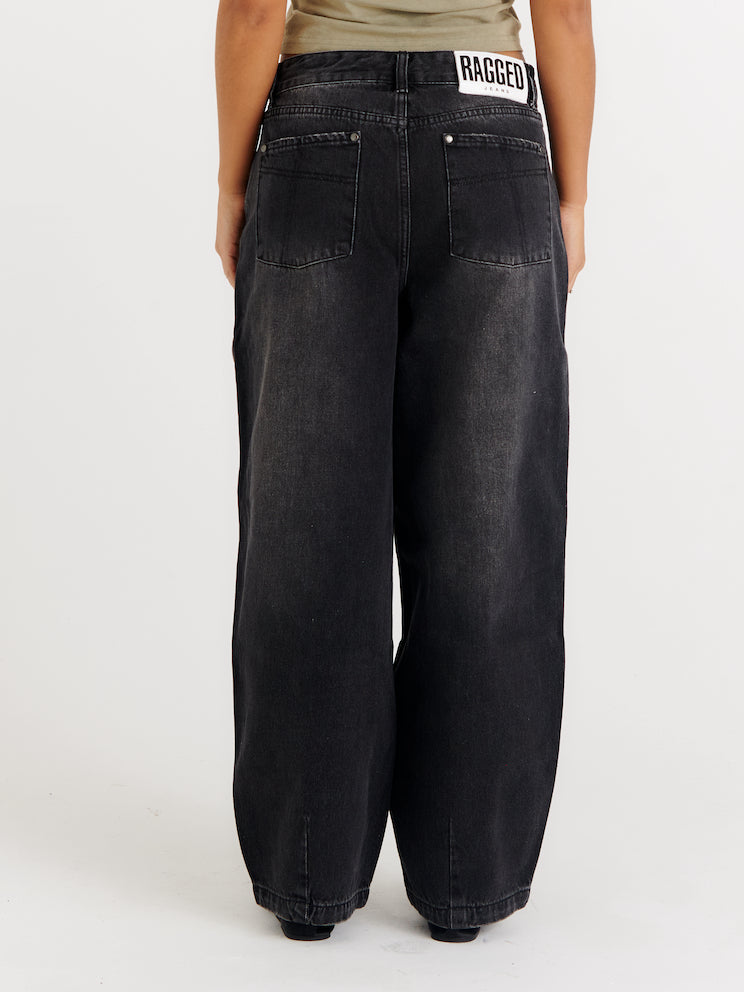 The Ragged Priest signature Goliath Jean fit in our charcoal washed denim with our classic "Ragged Jeans" belt loop back tab.