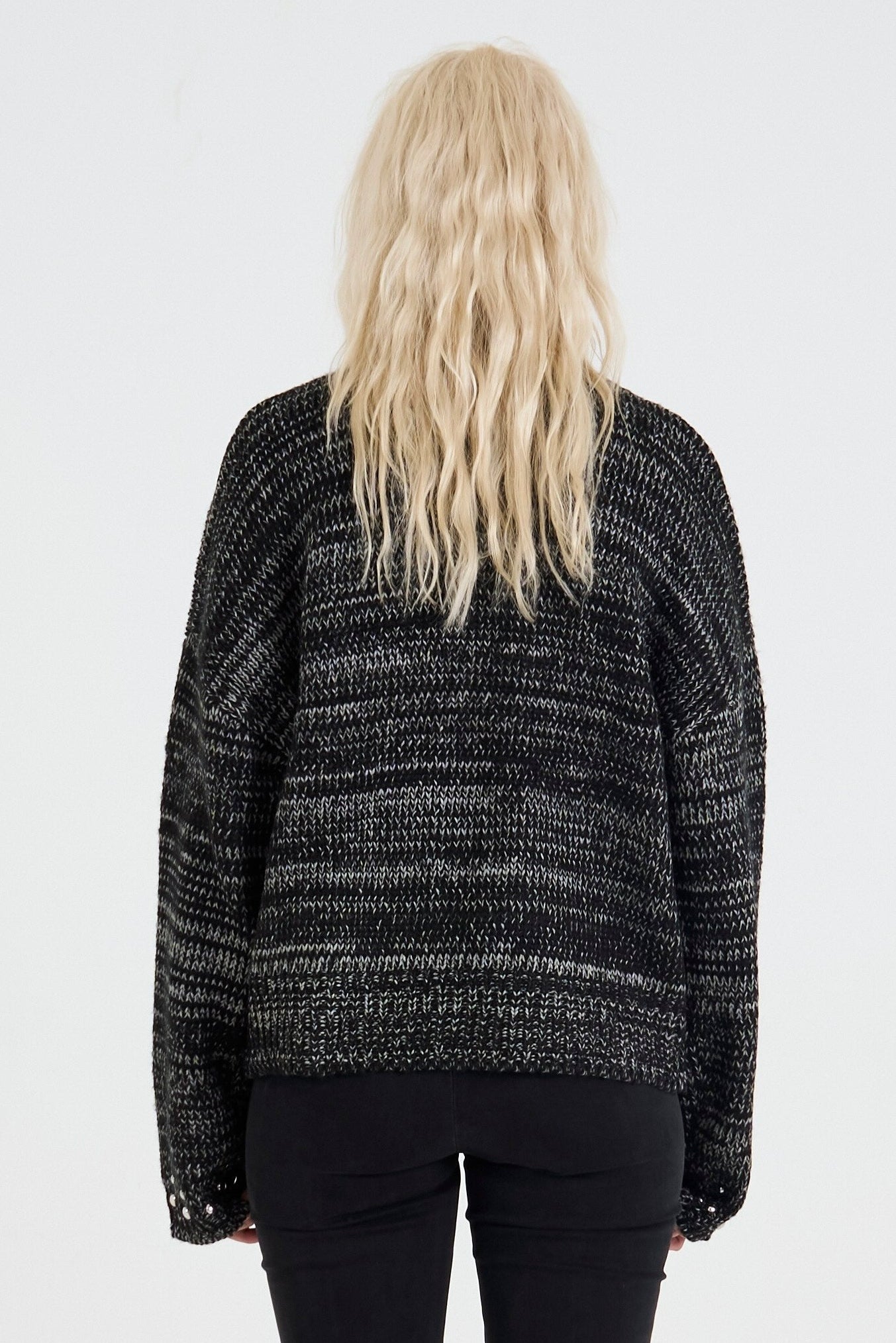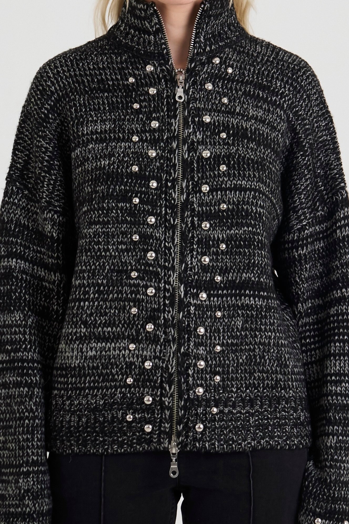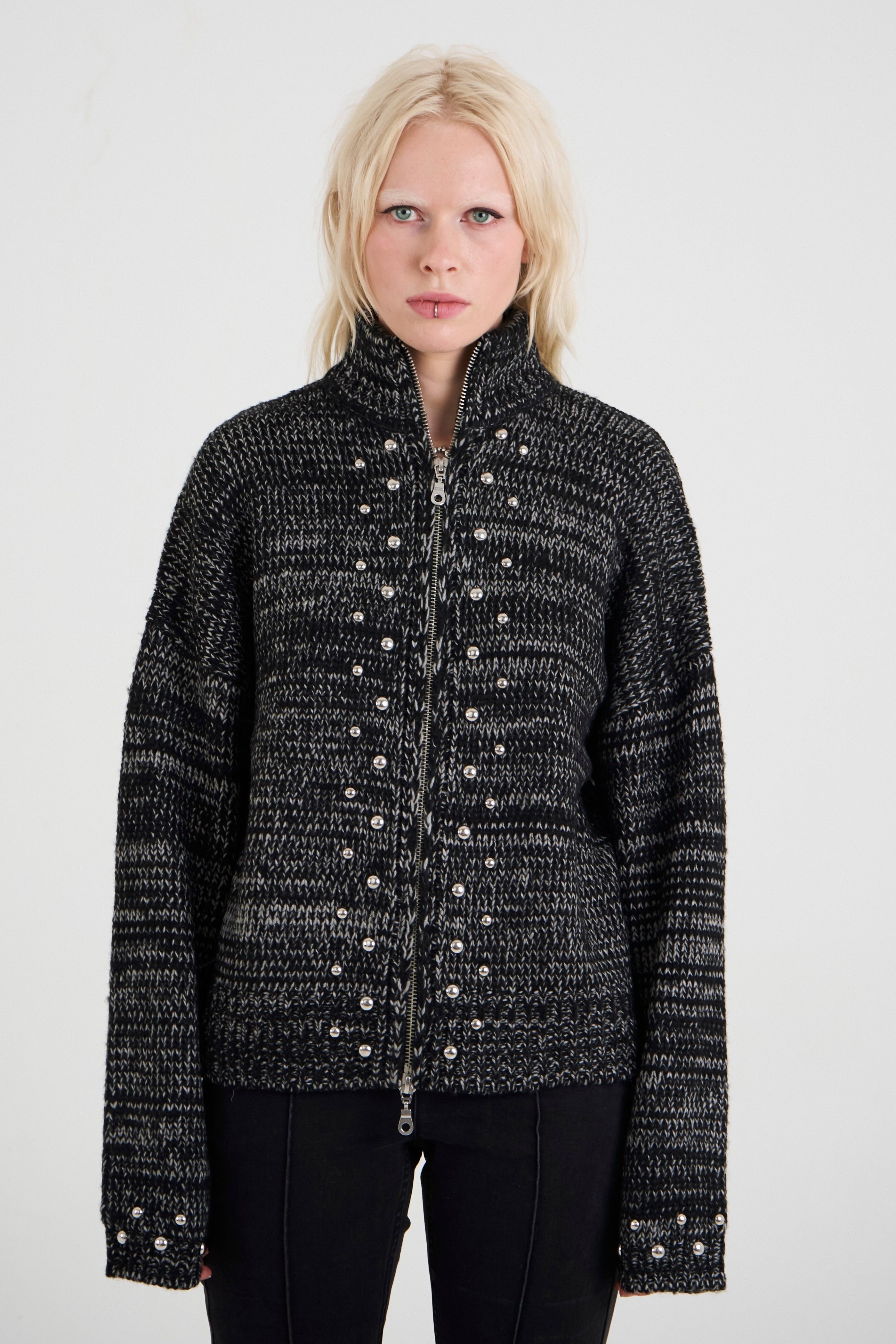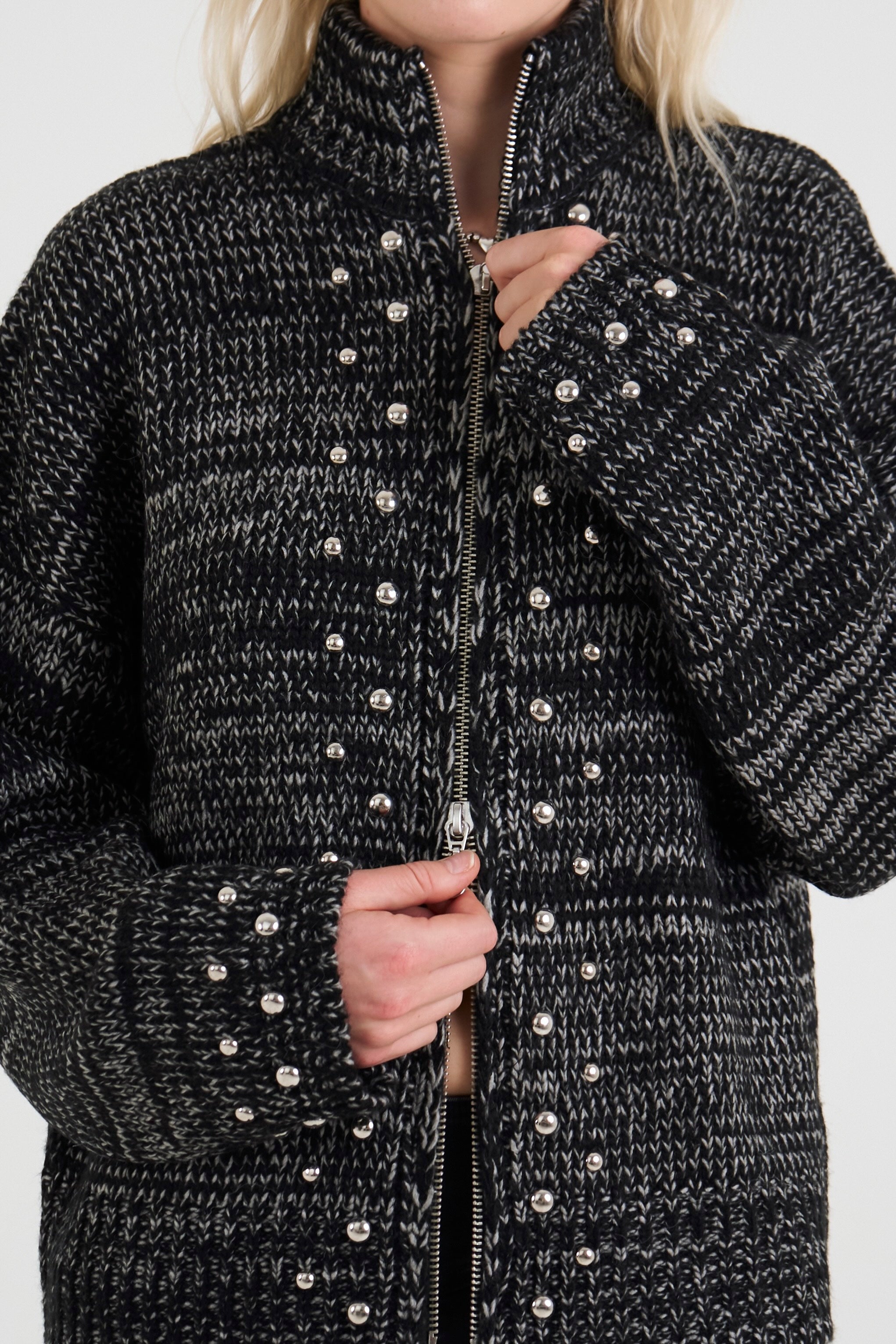 Spacedye marl chunky knit cardigan with 2 way zip and silver stud detailing for a grunge finish.