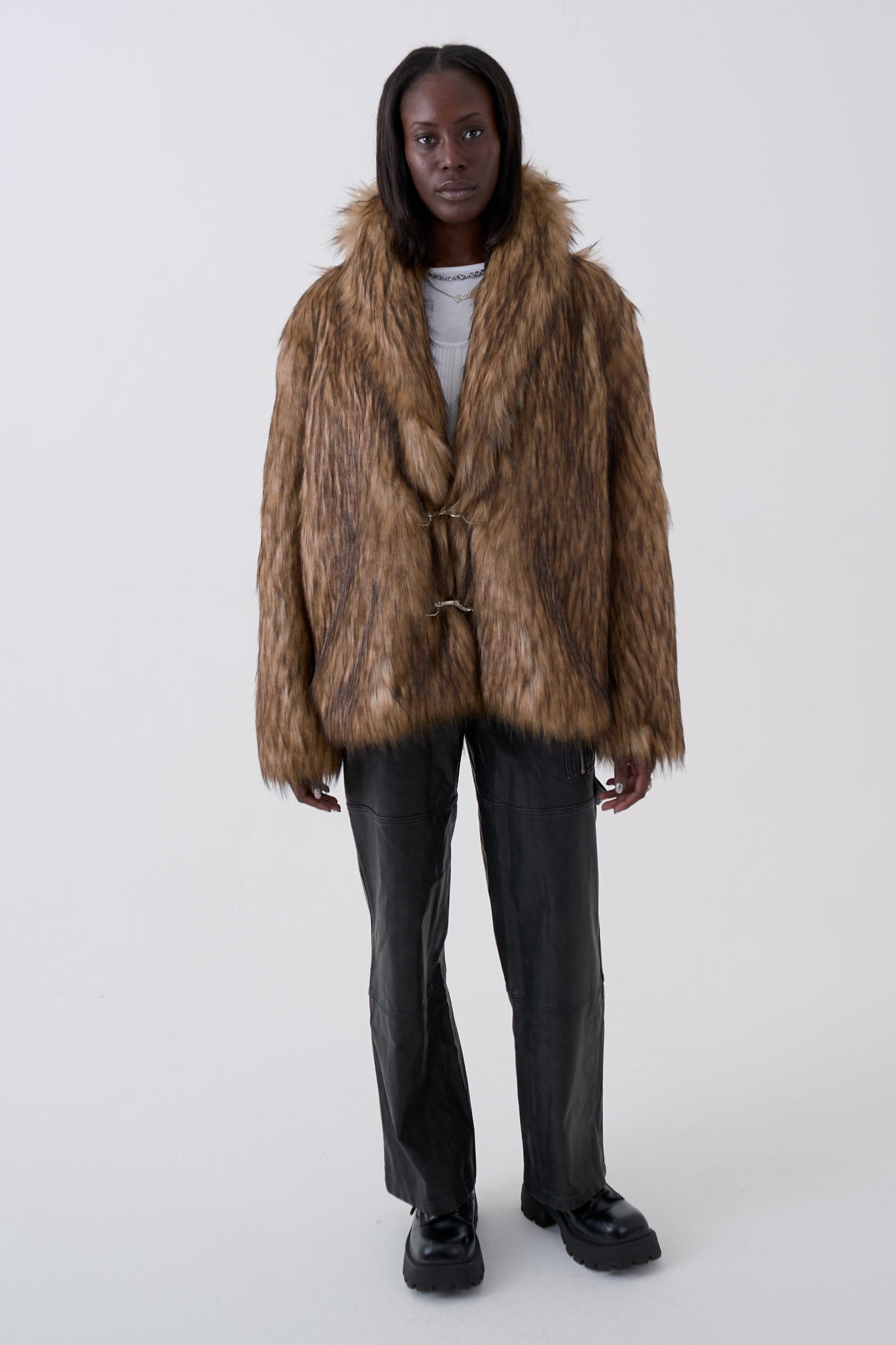 Brown super soft faux fur coat, featuring an oversized shawl collar and silver hardware fastening.