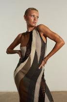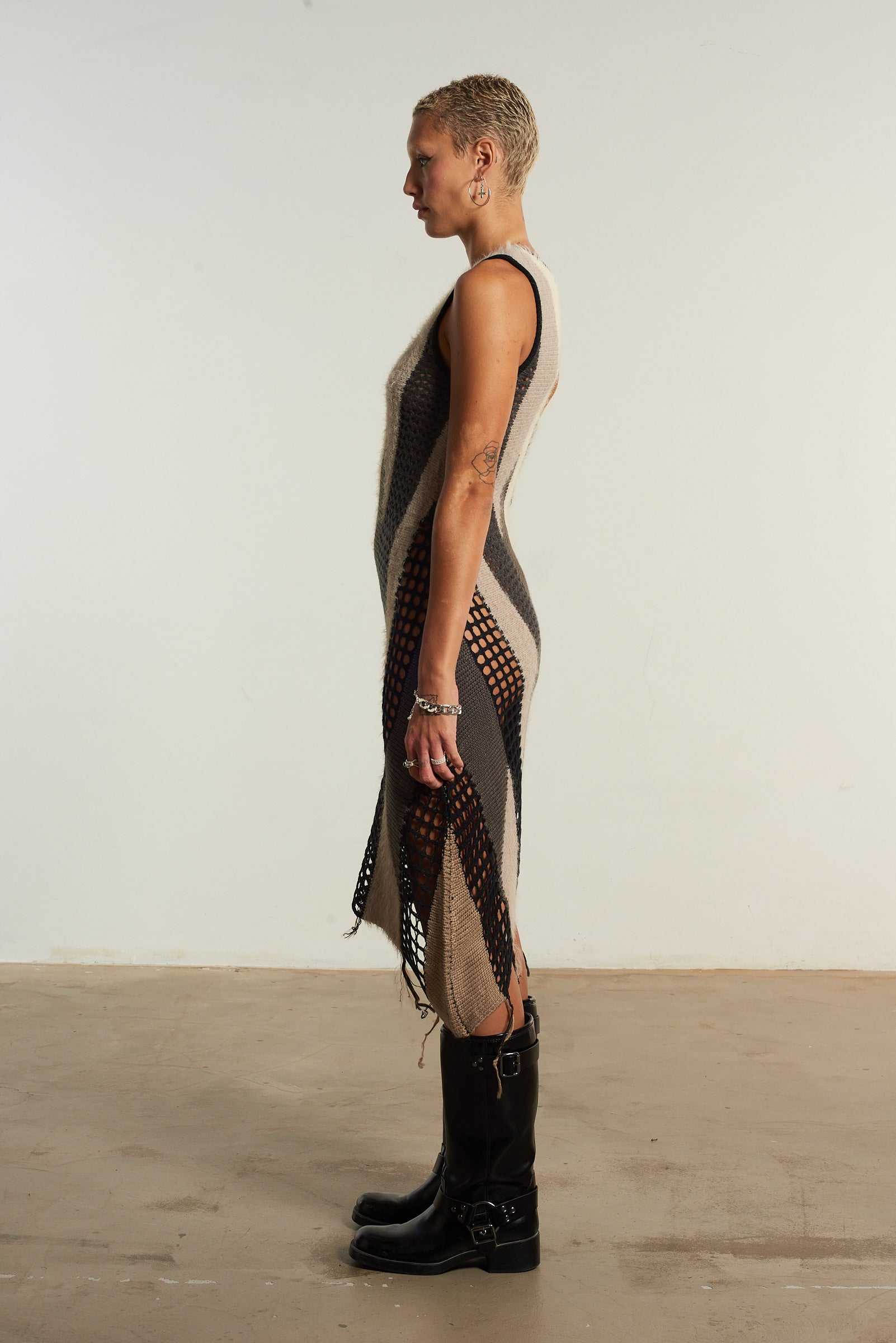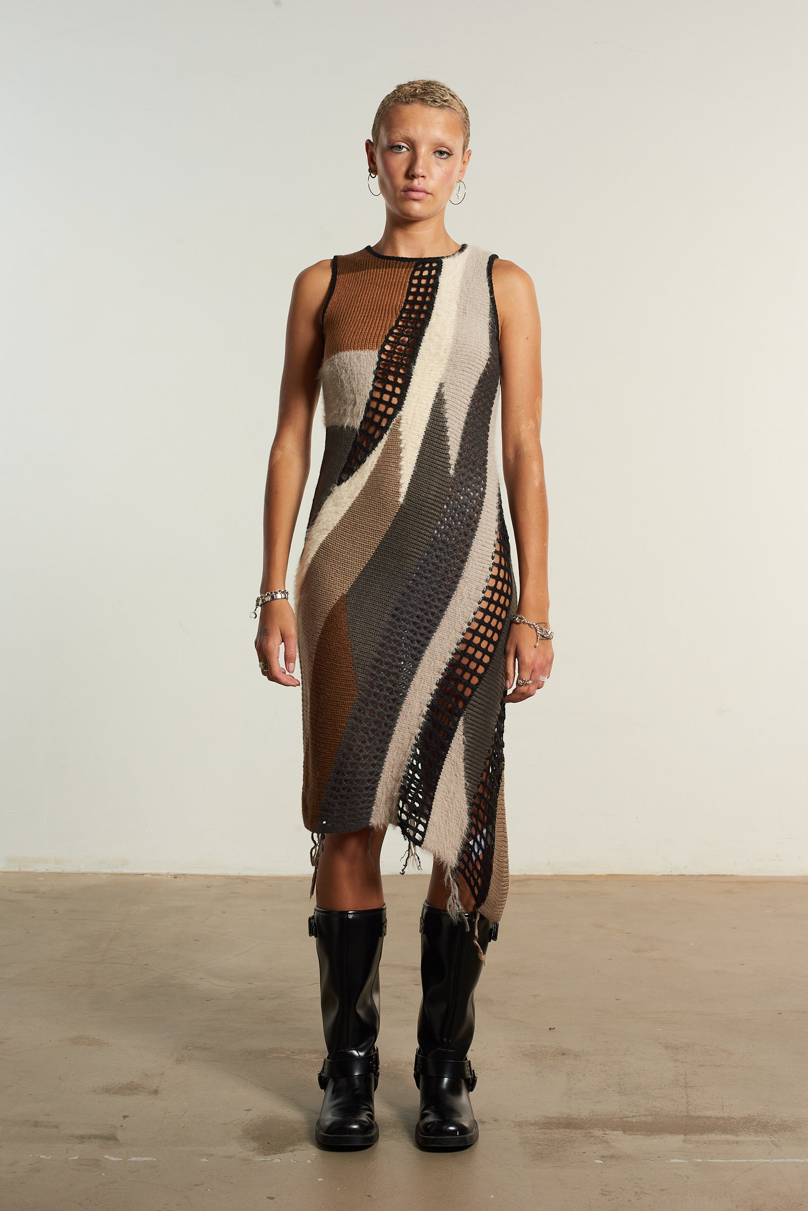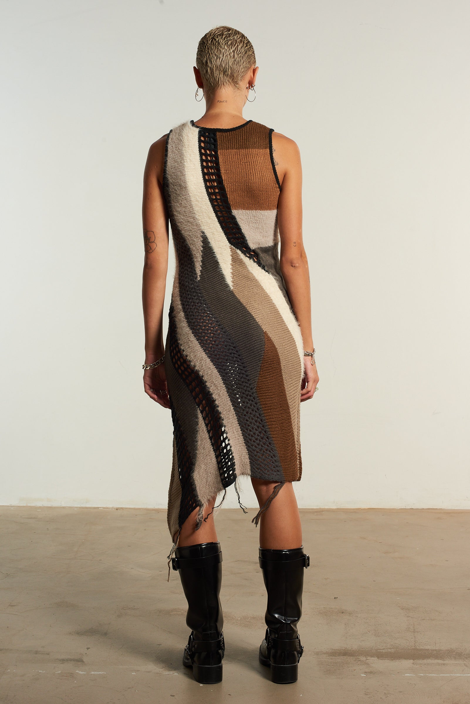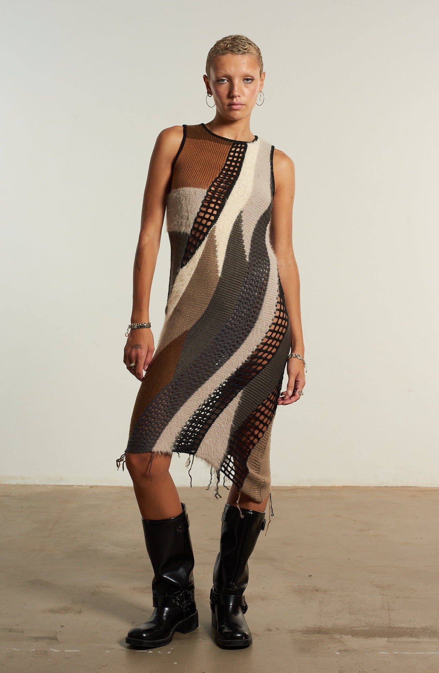 The Ragged Priest neutral tone multi texture sleeveless midi dress with distressed asymmetric hem detail