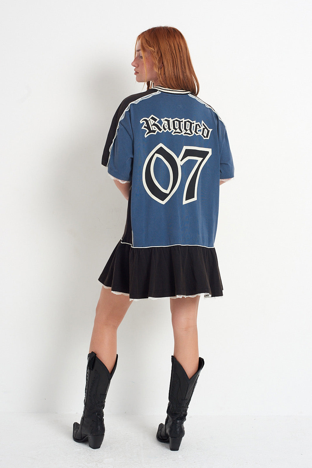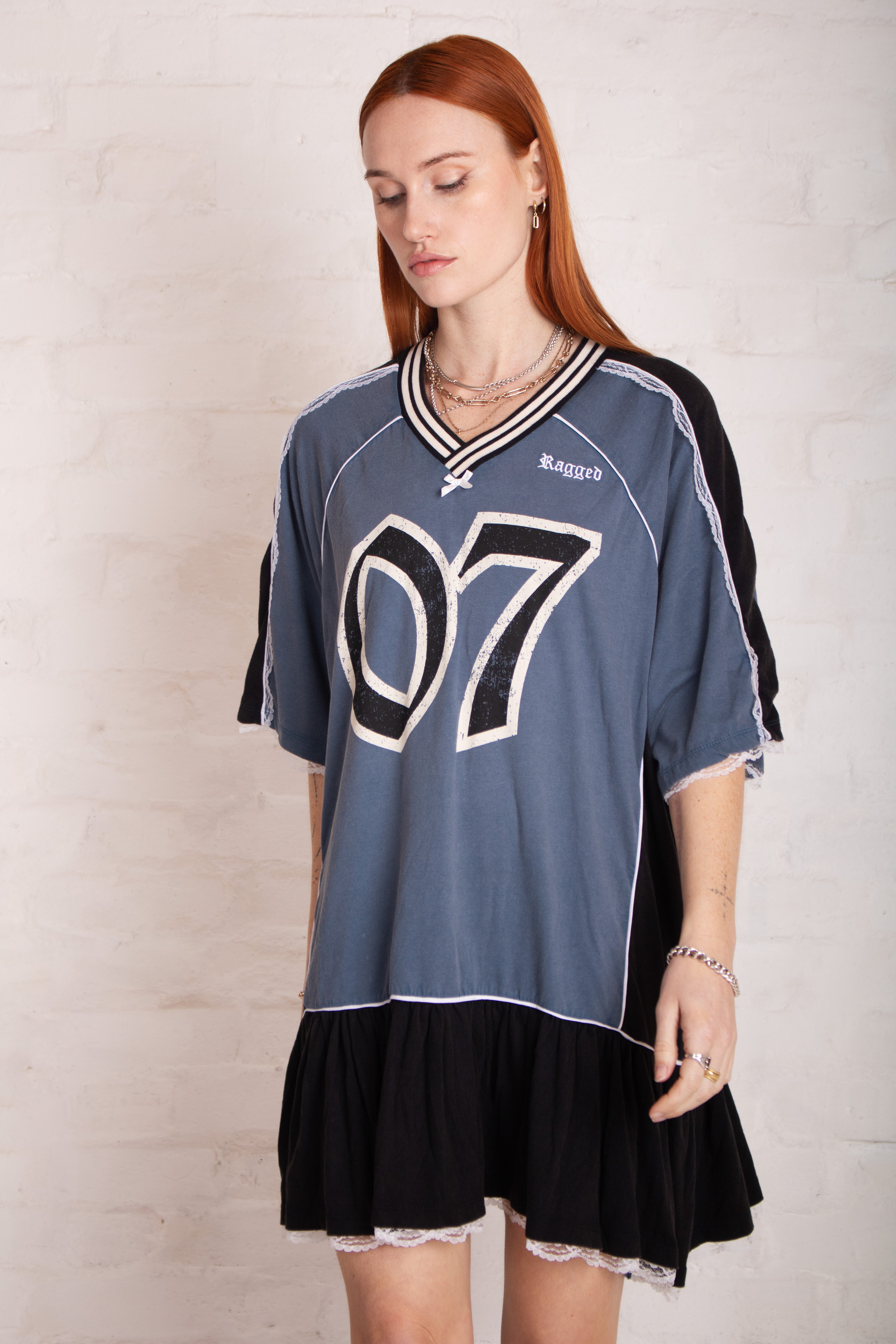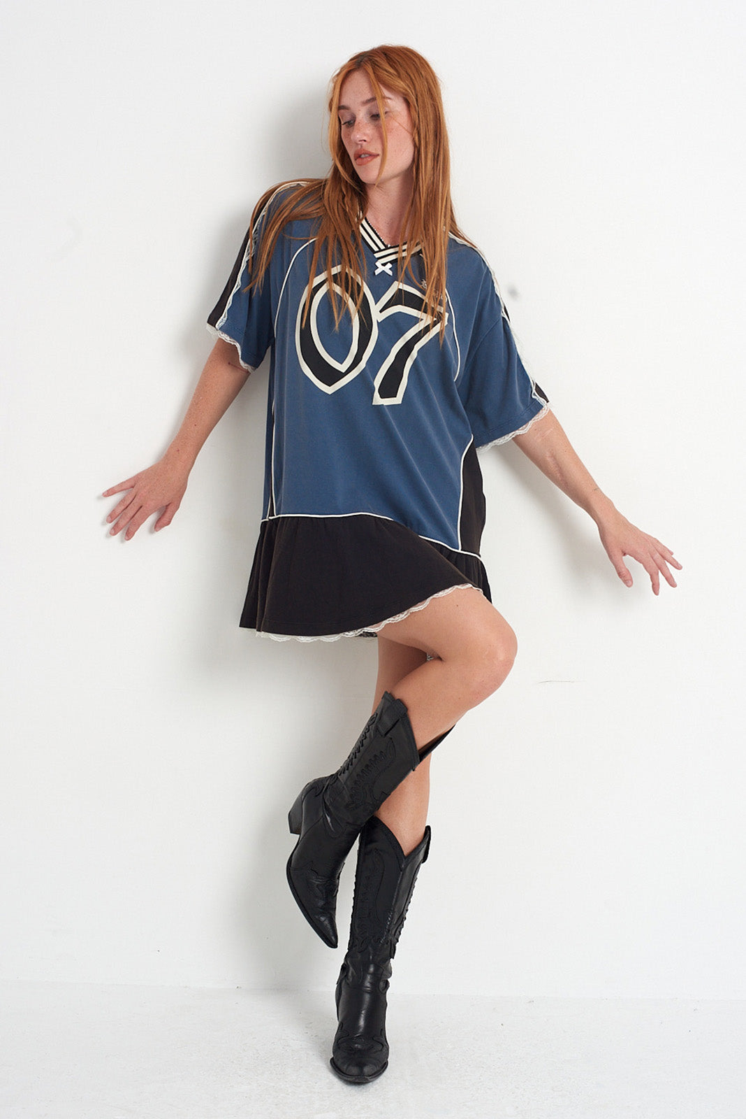 Acid wash blue & black colourblock varsity t-shirt mini dress with lace and bow detail
