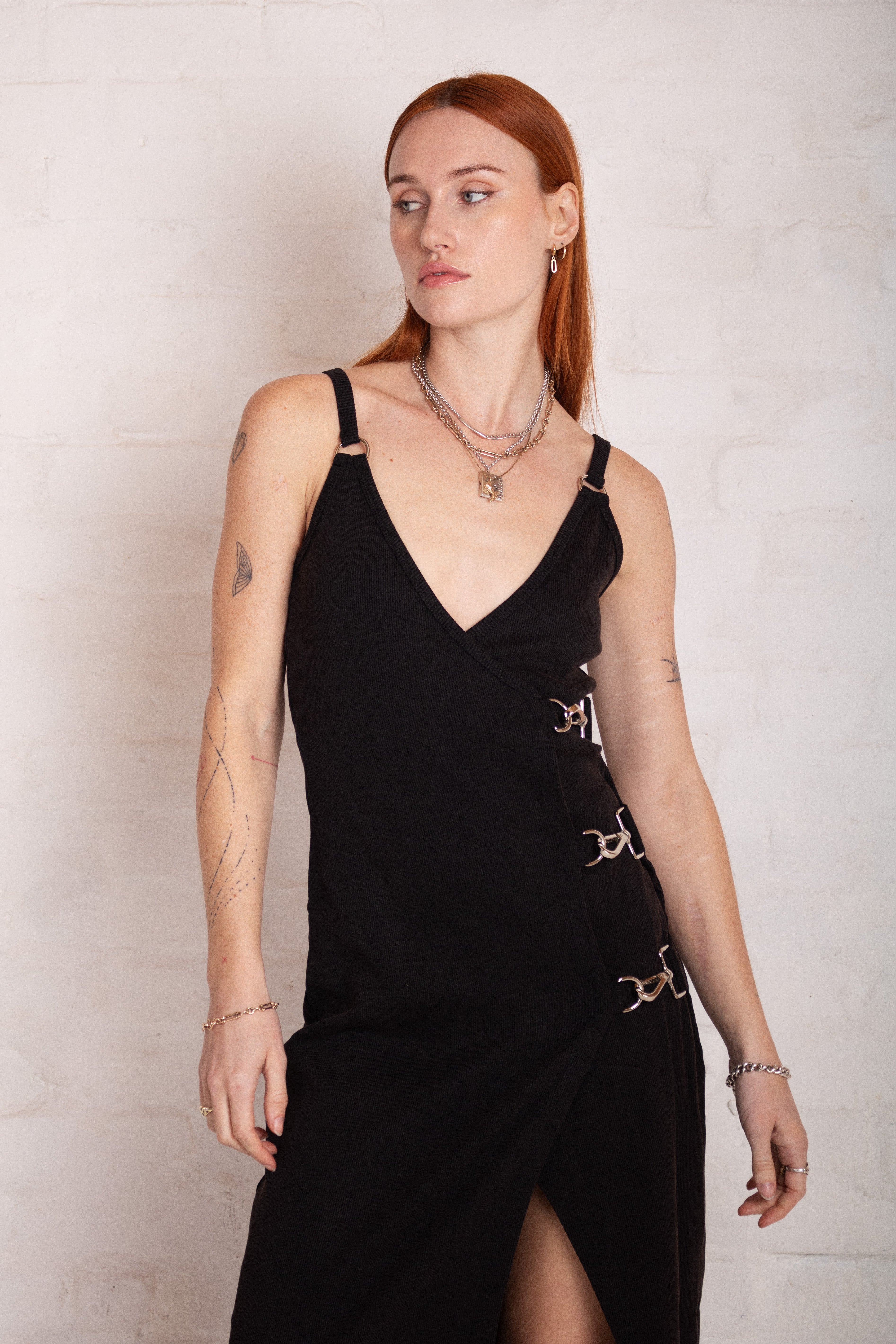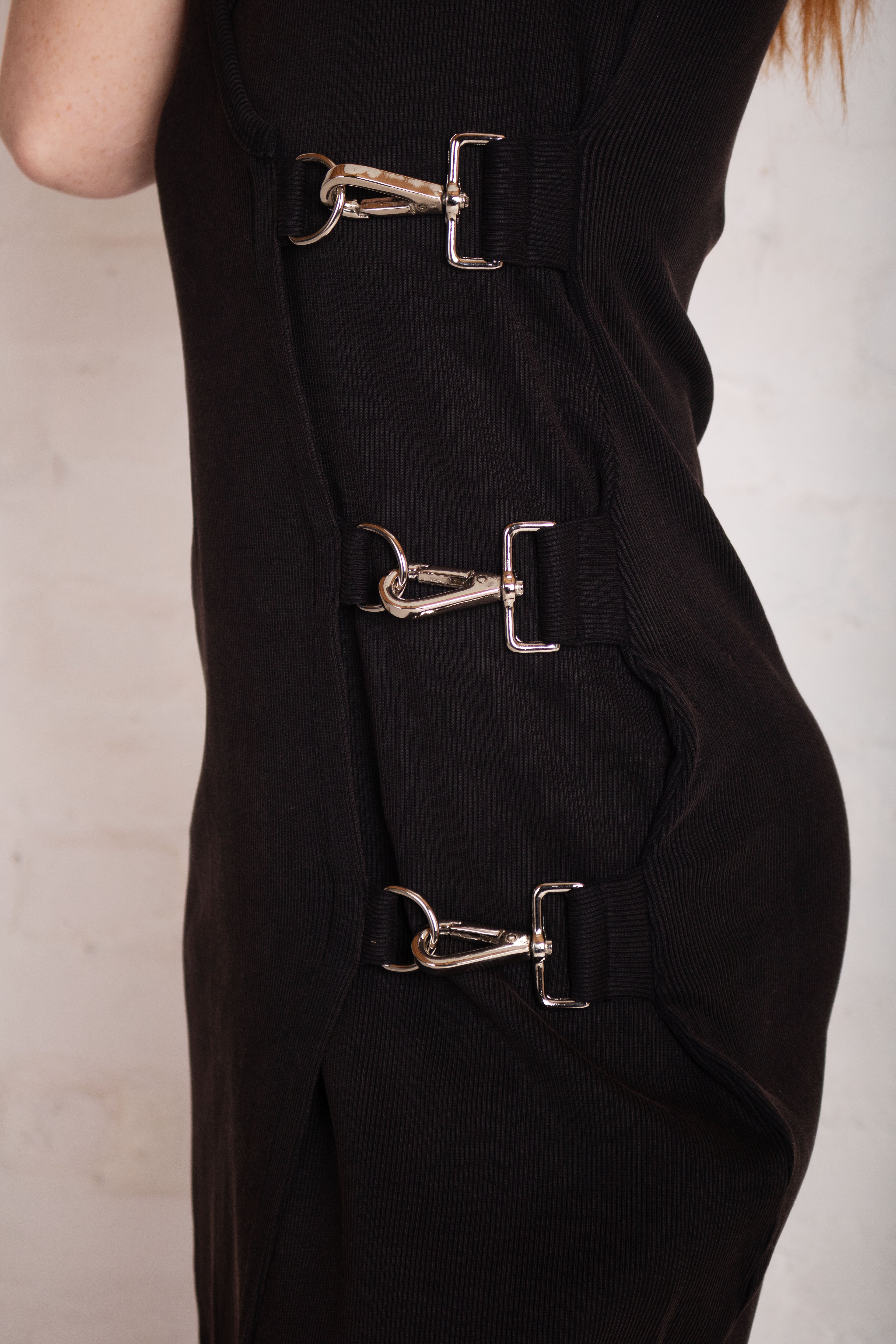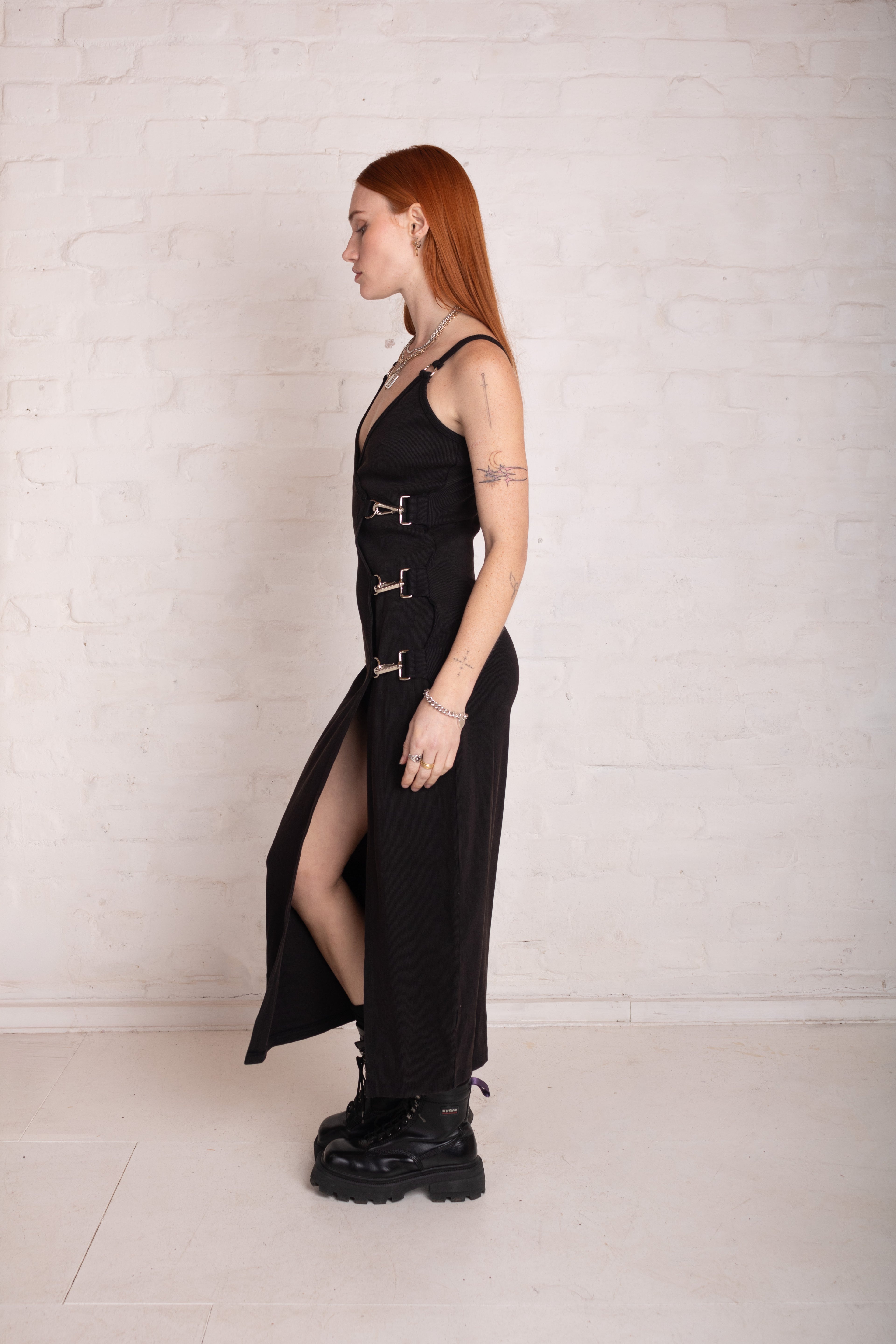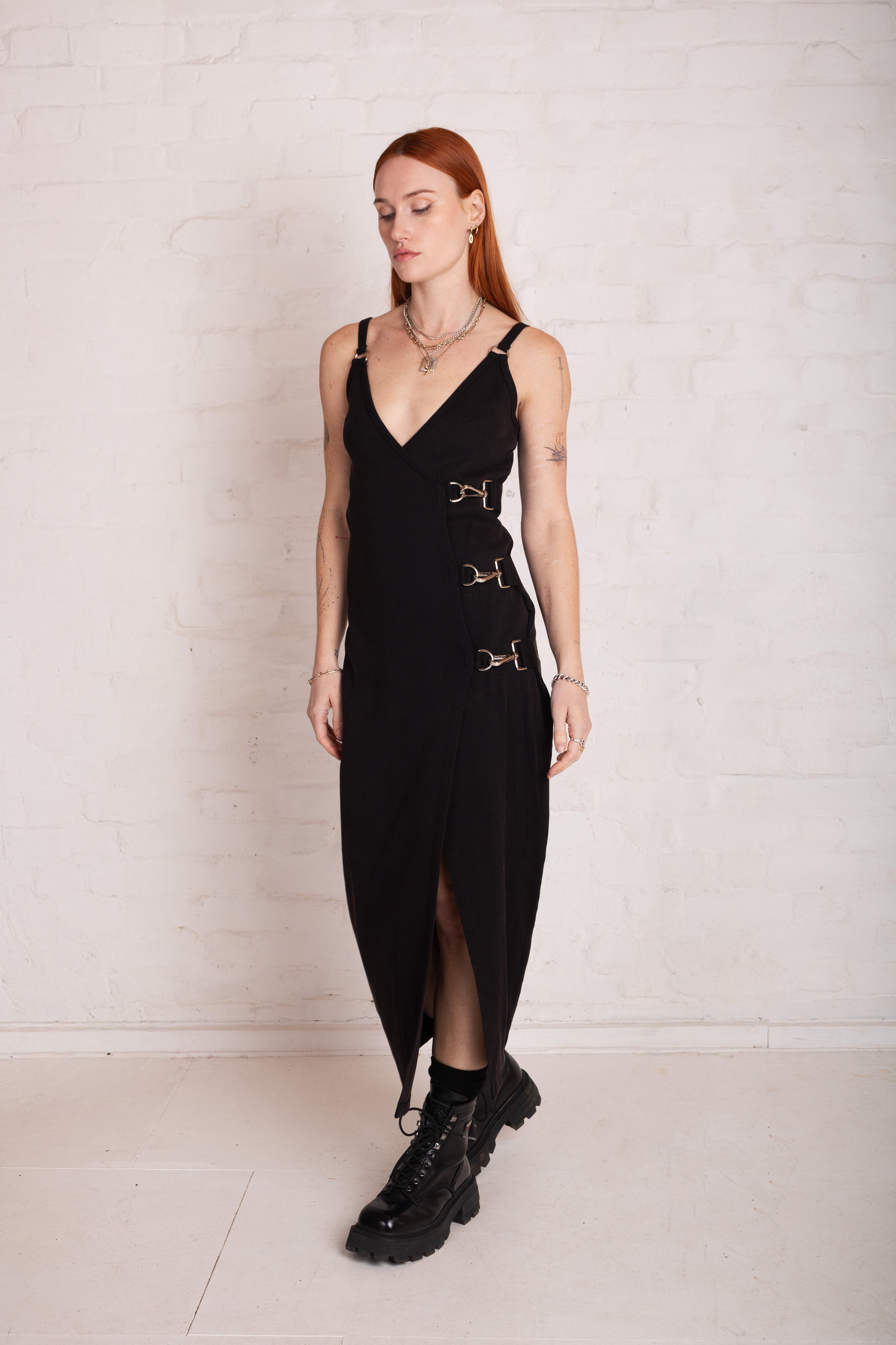 Black plunging maxi dress with hardware buckle and D ring detail