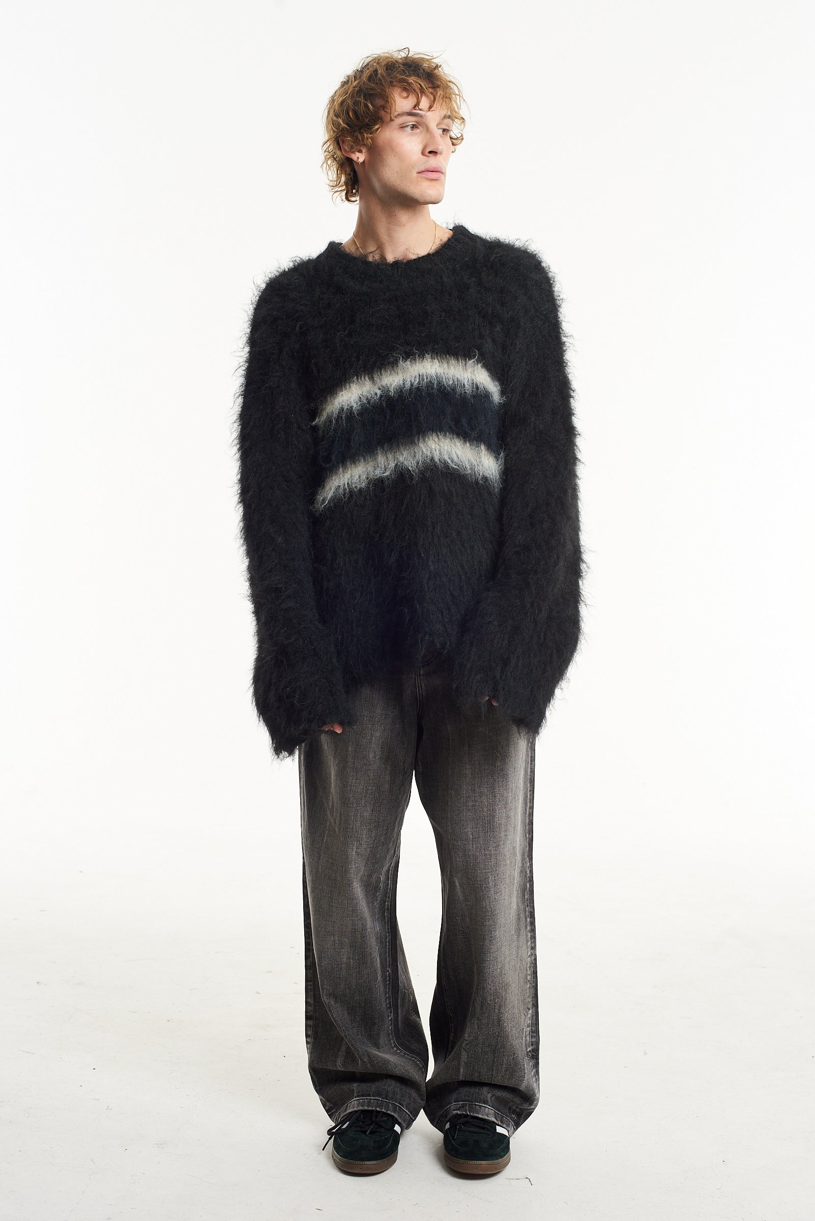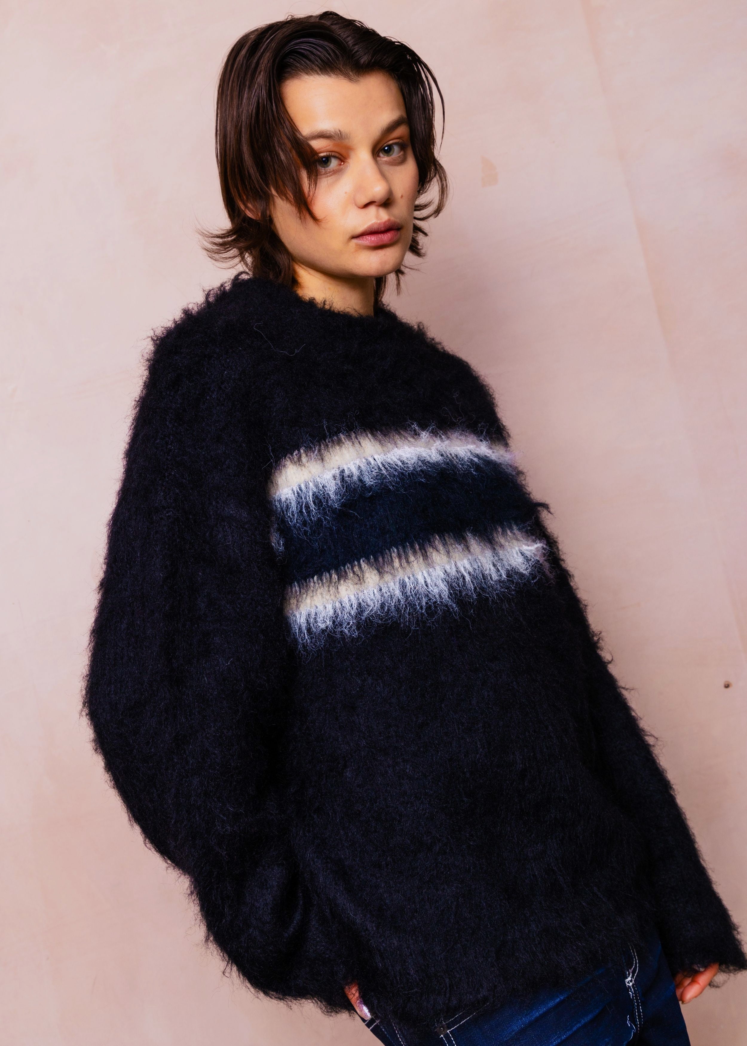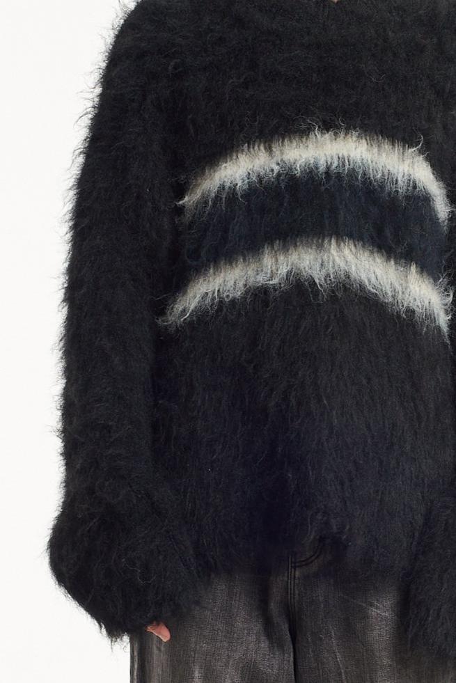 Black supersoft faux mohair fluffy knit with white stripe detail