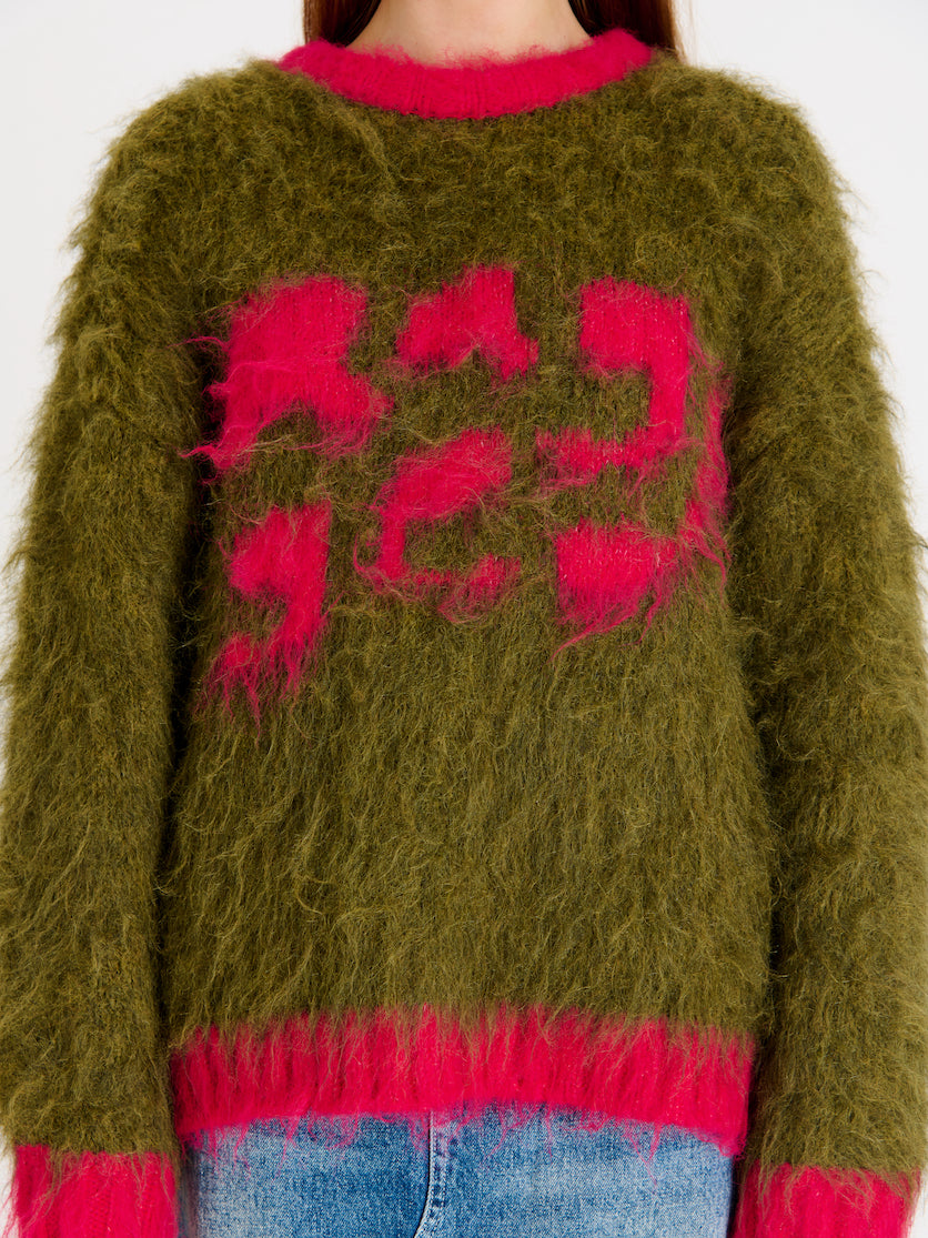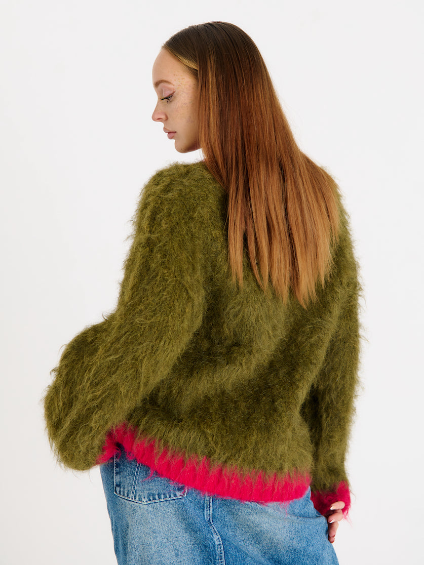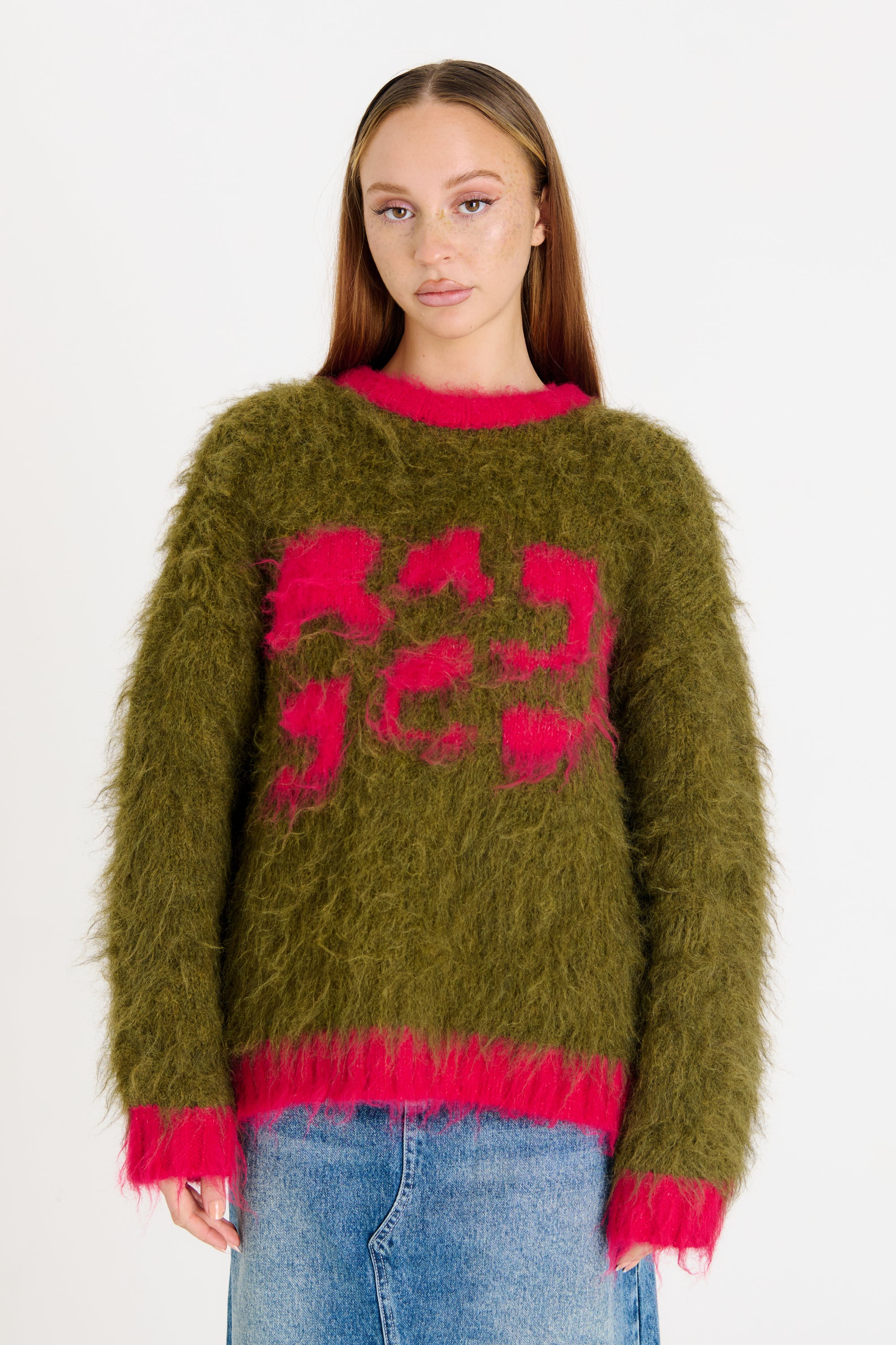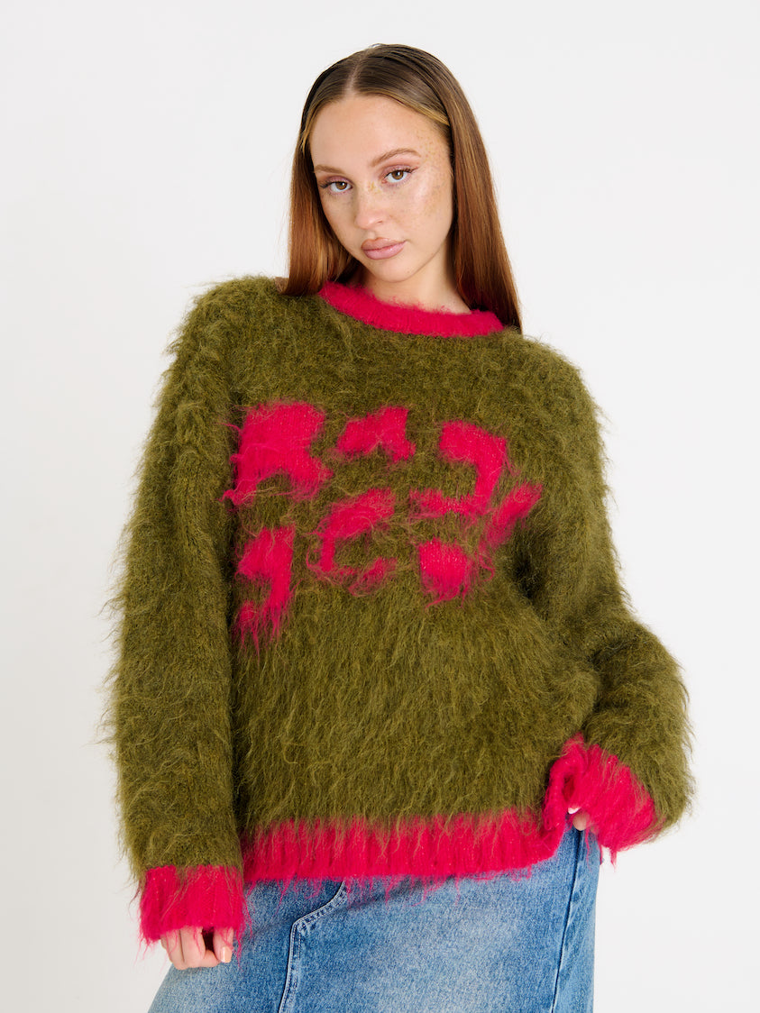 Moss green fluffy brushed knit with pink contrast trim and abstract Ragged logo