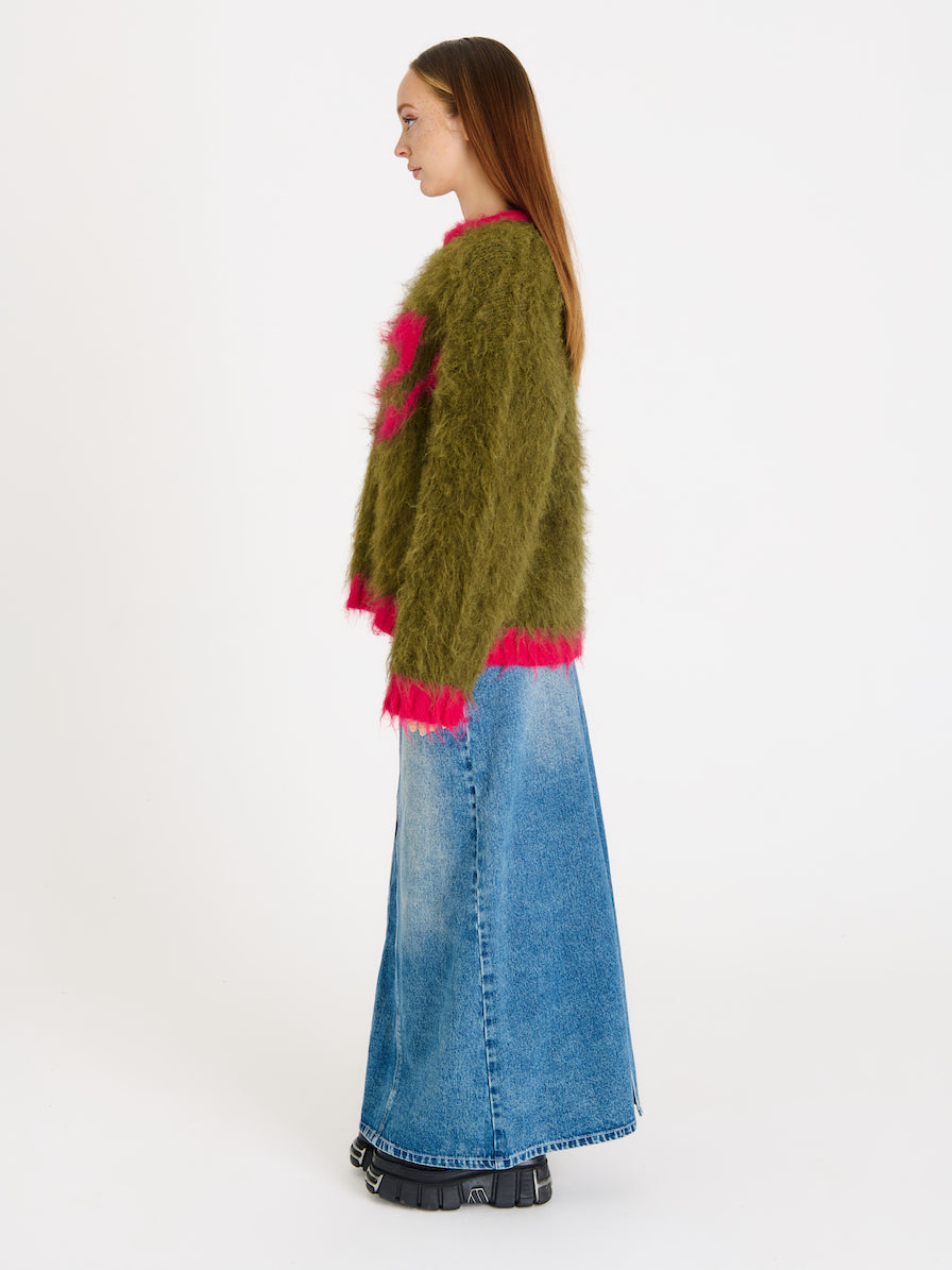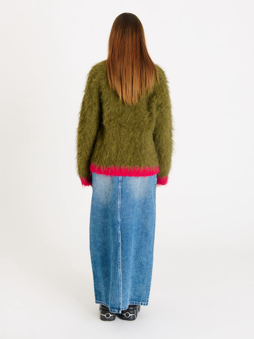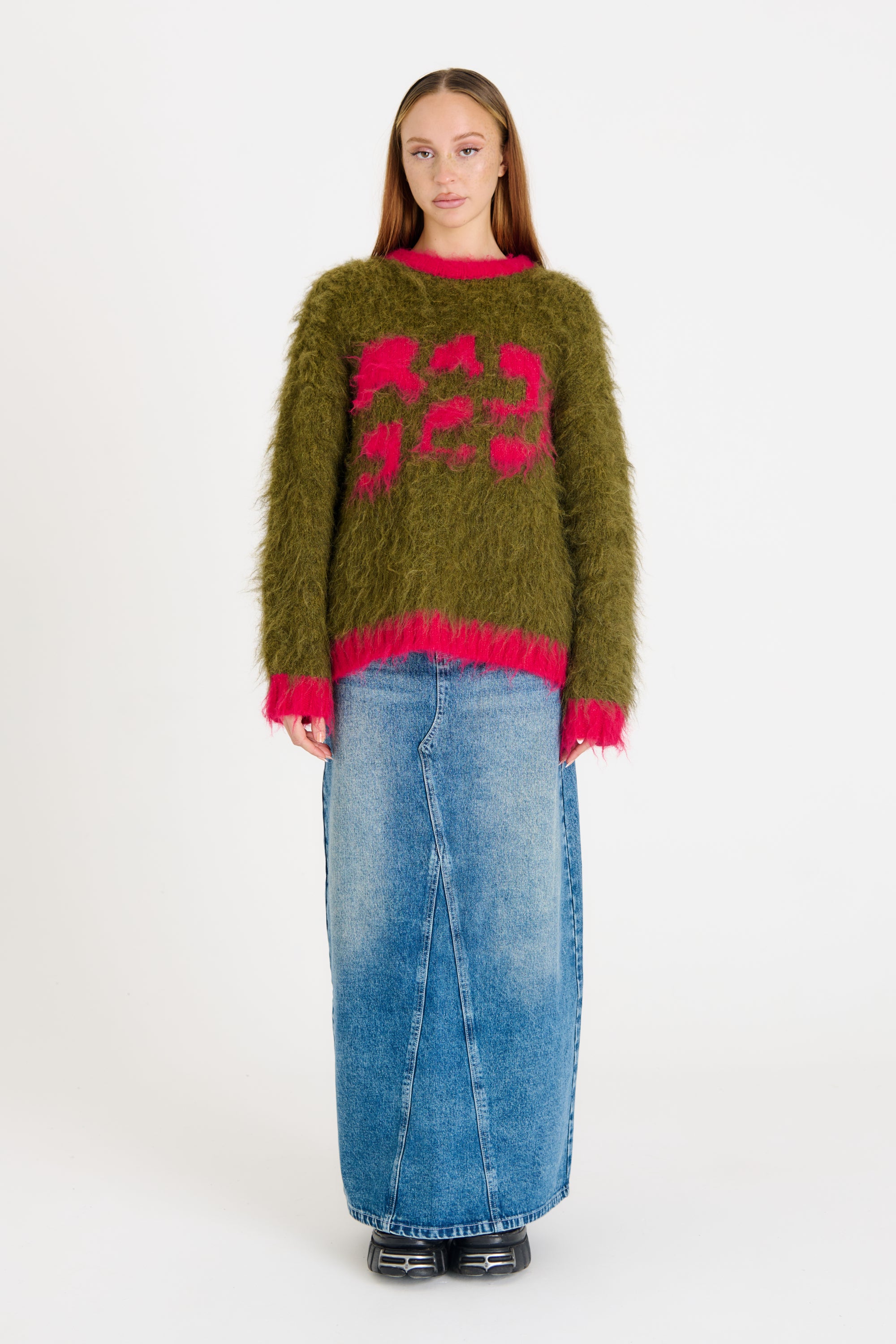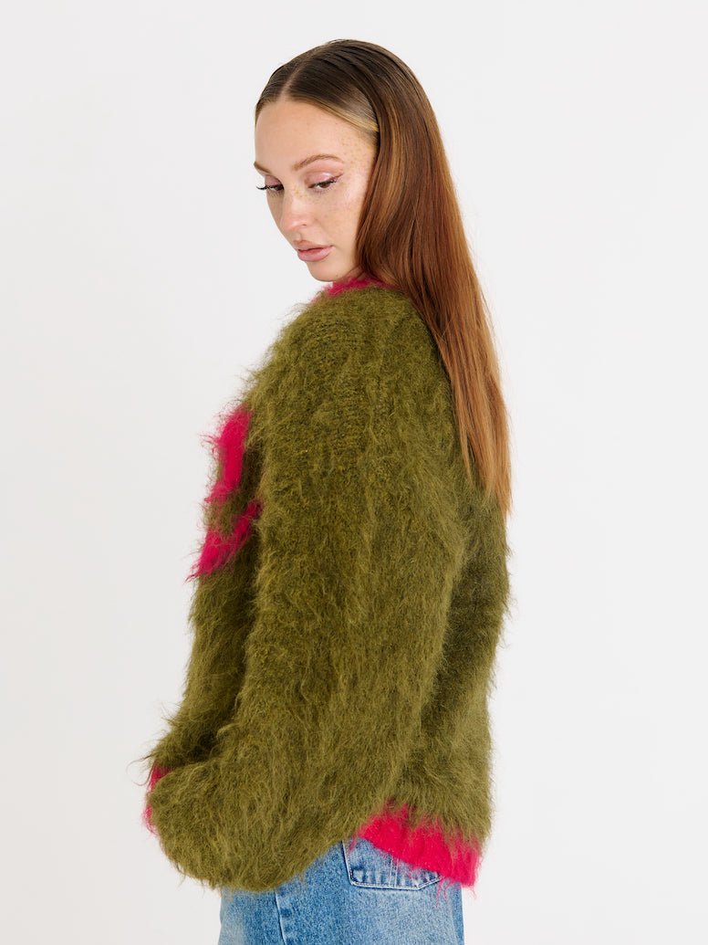 Moss green fluffy brushed knit with pink contrast trim and abstract Ragged logo