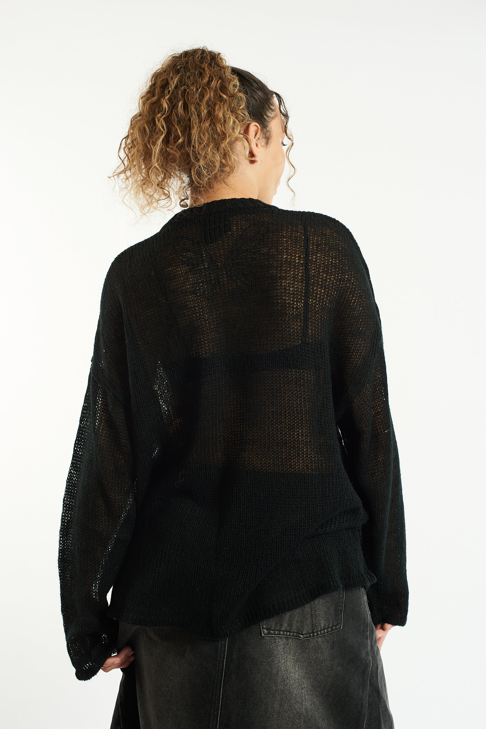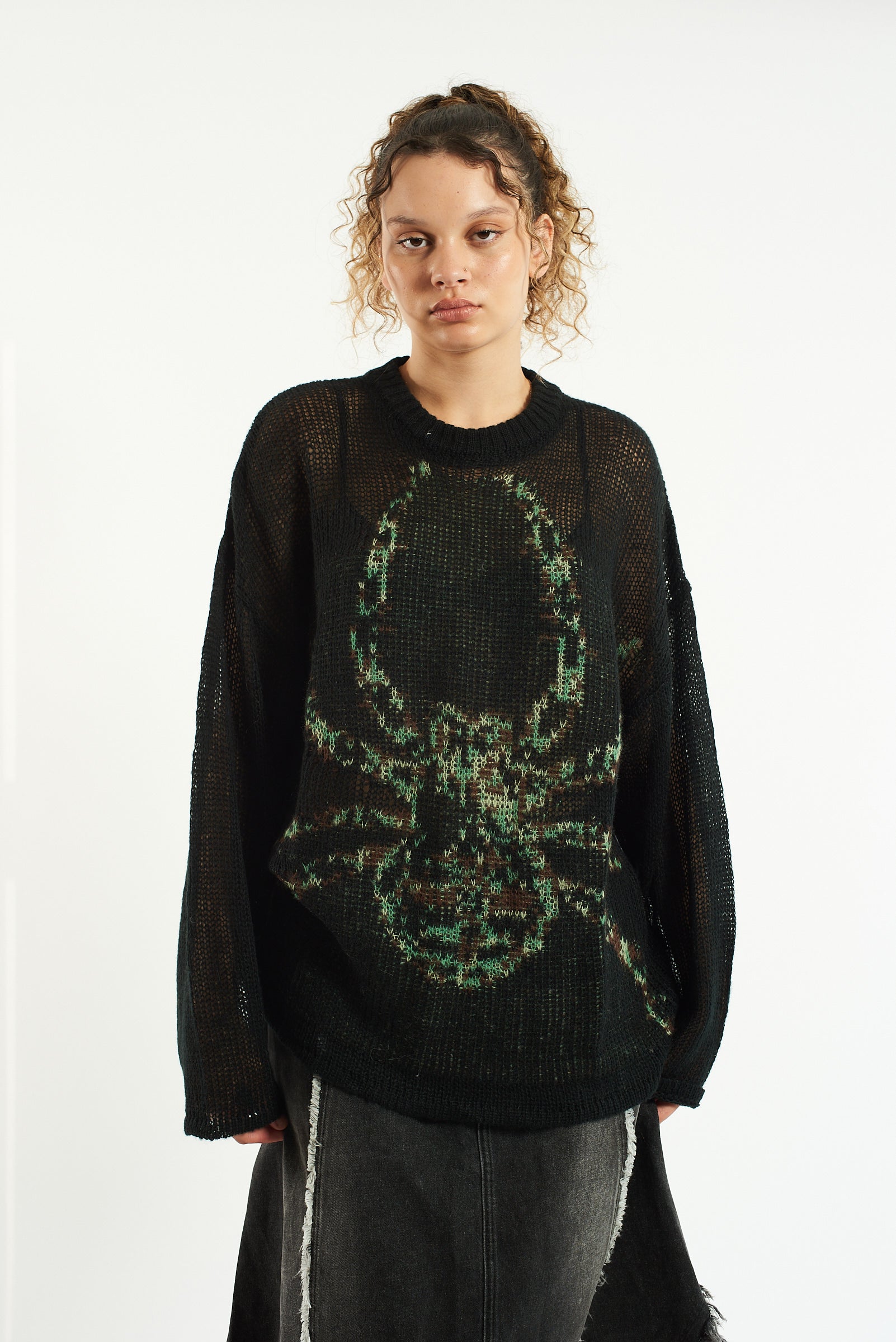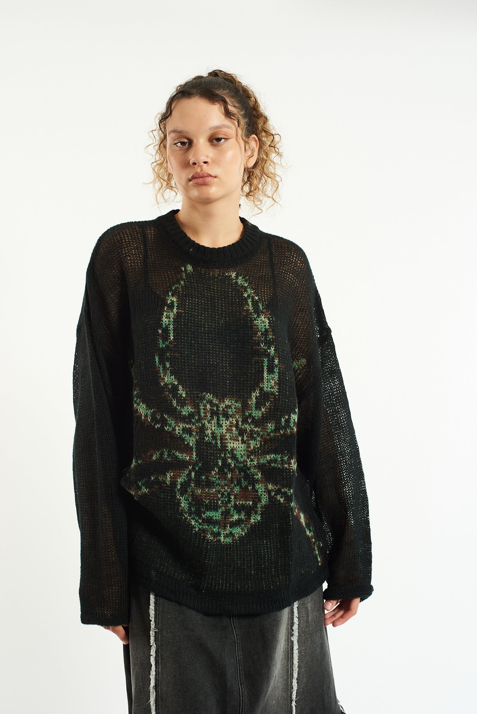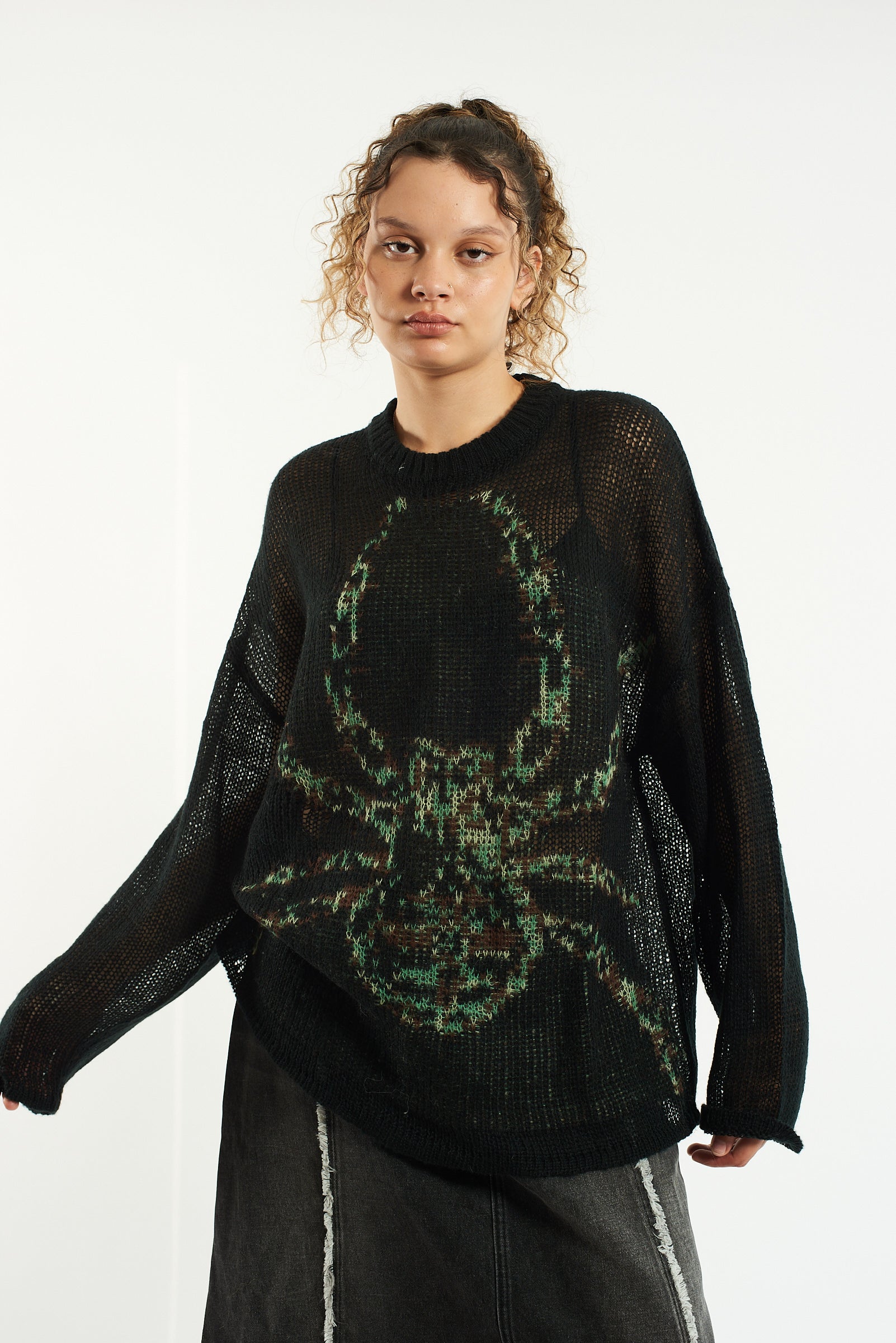 Oversized black loose open knit jumper with oversized spider graphic