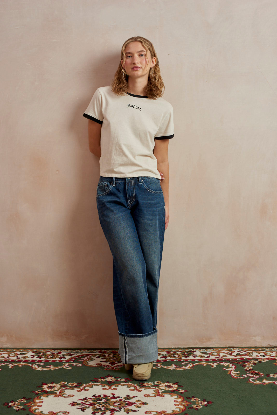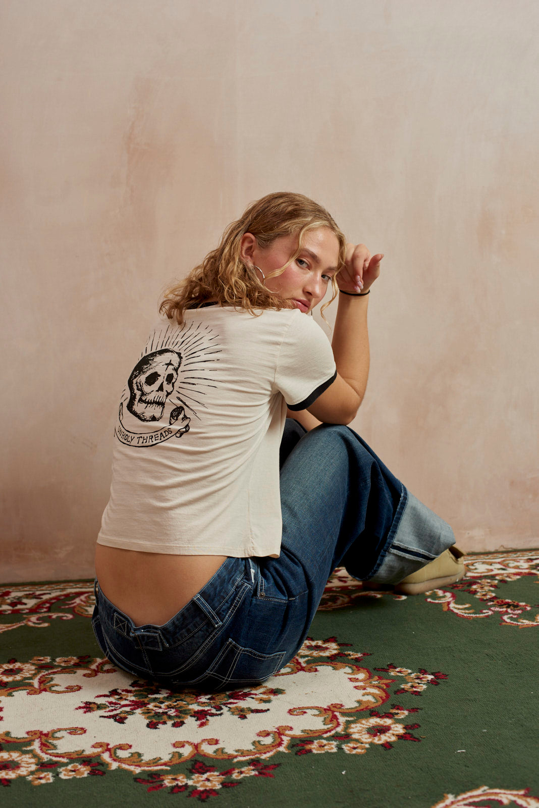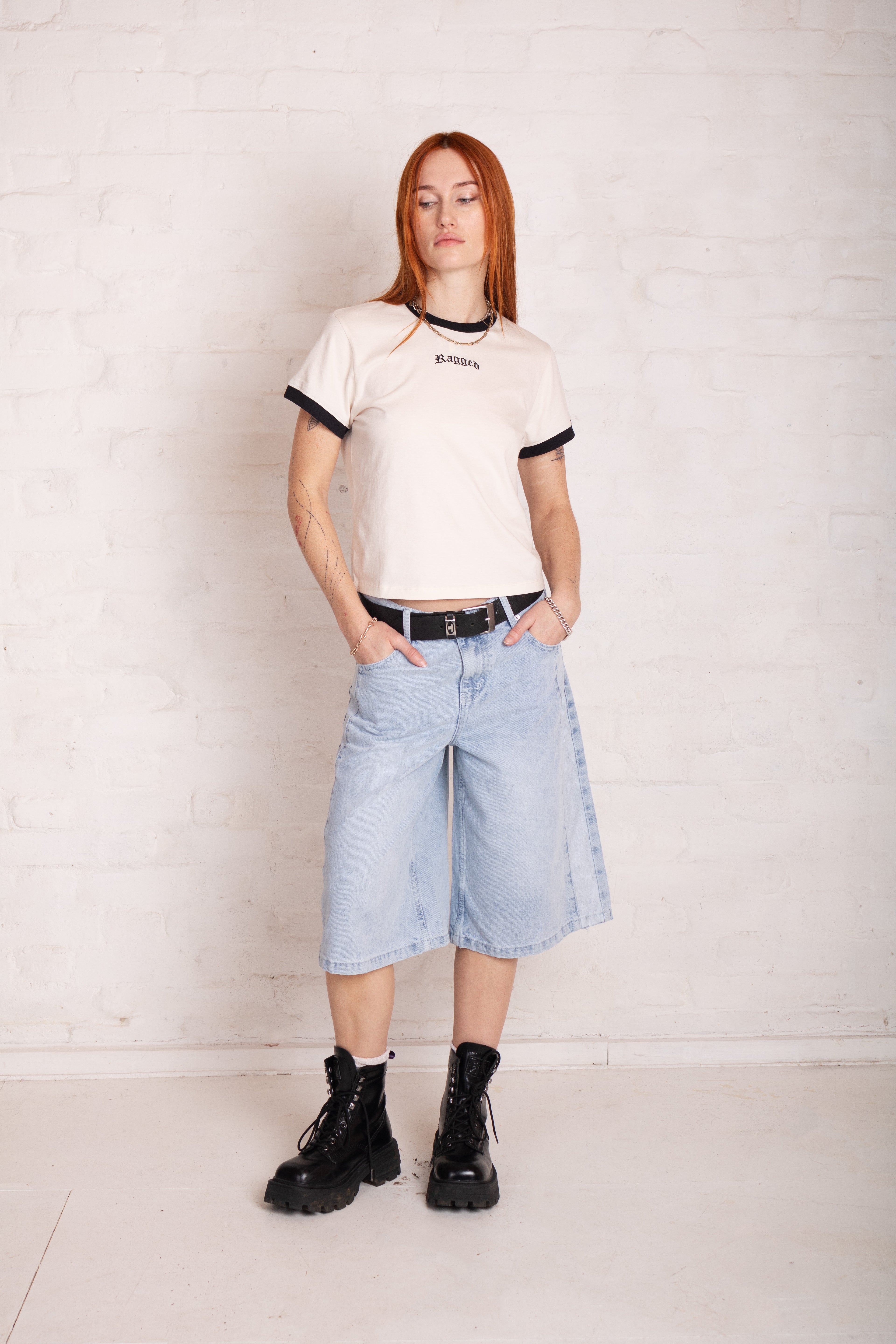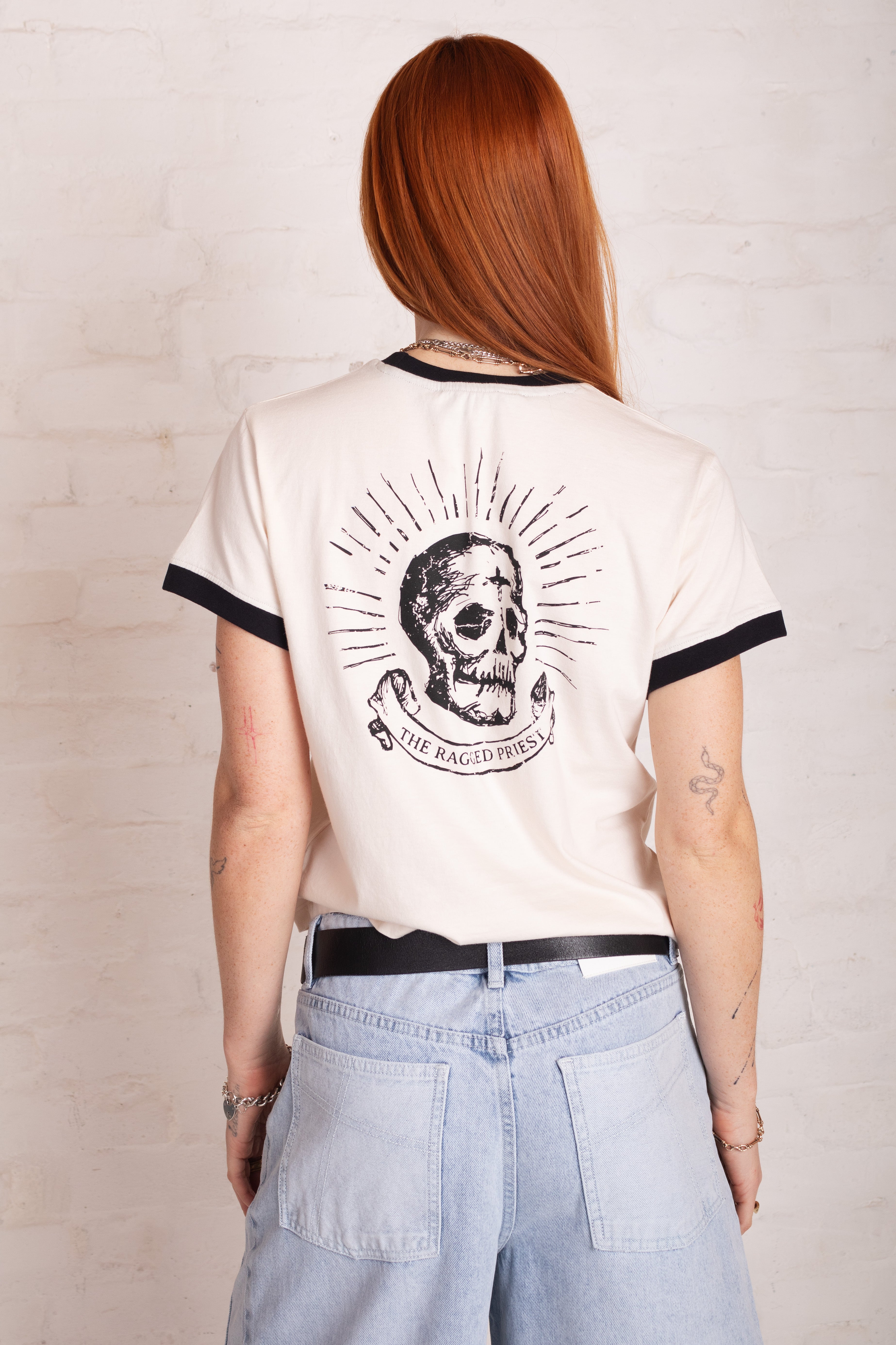 Ecru & black ringer t-shirt with embroidered gothic RAGGED logo and skull graphic on back - designed by our team in London