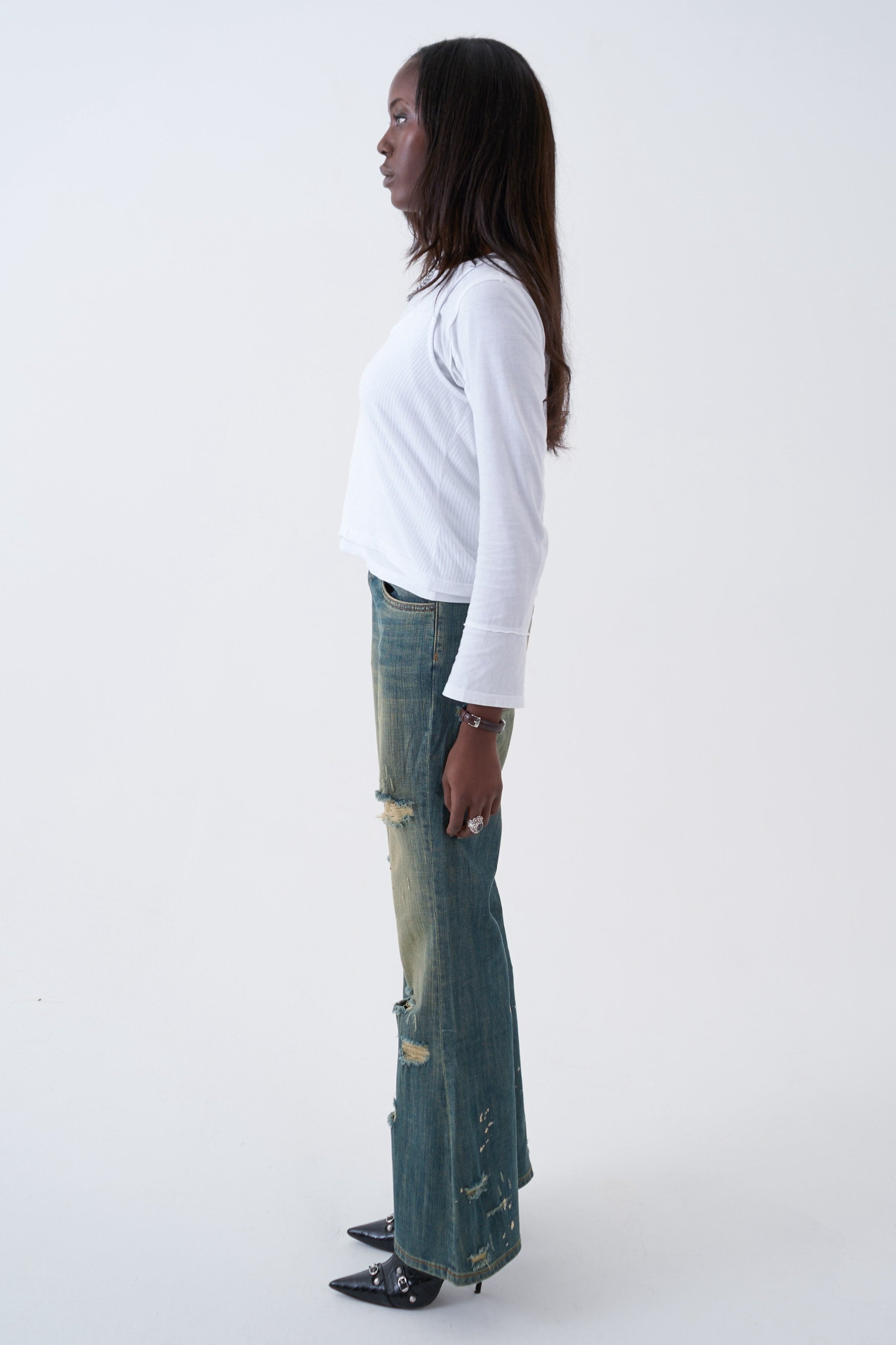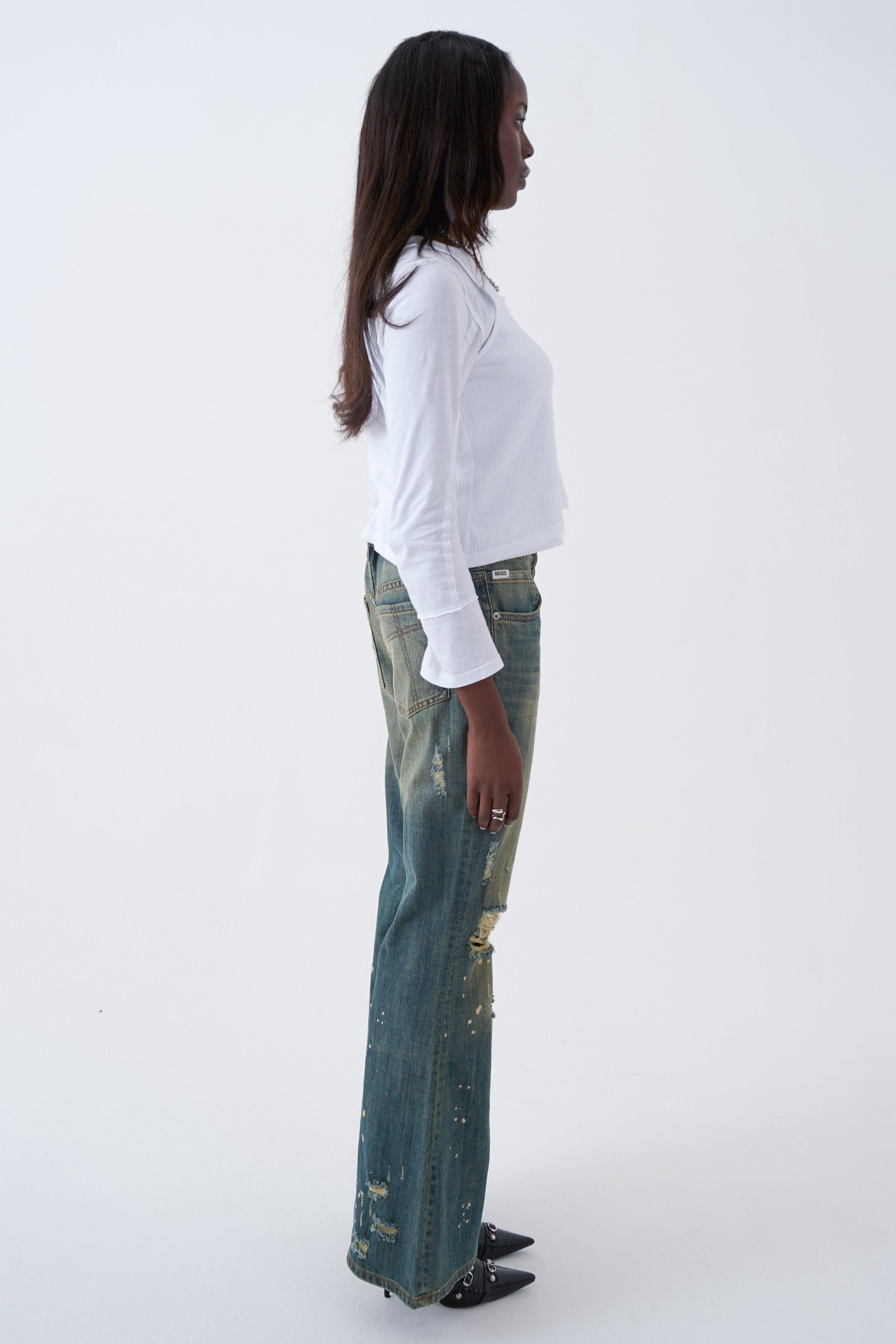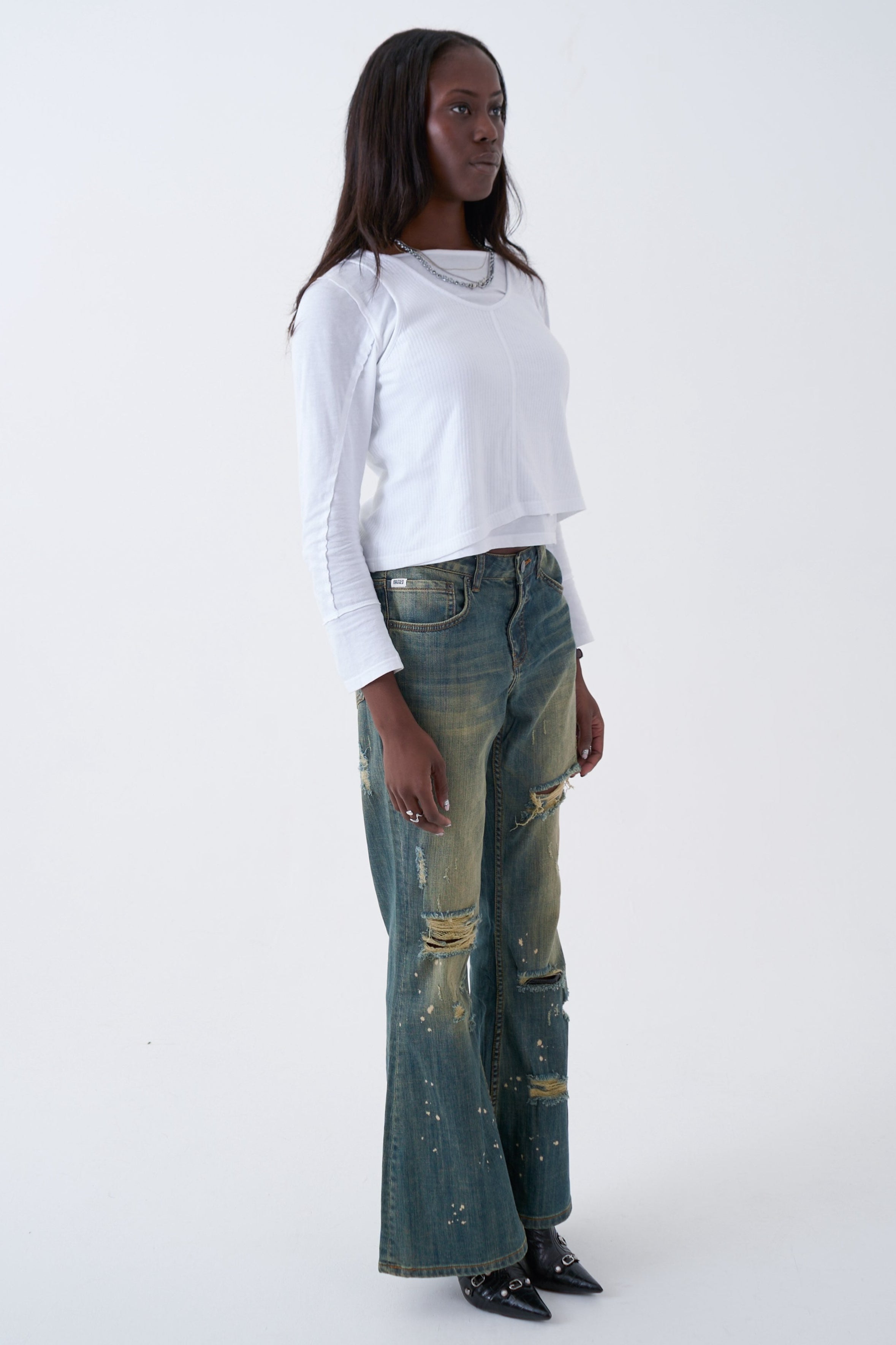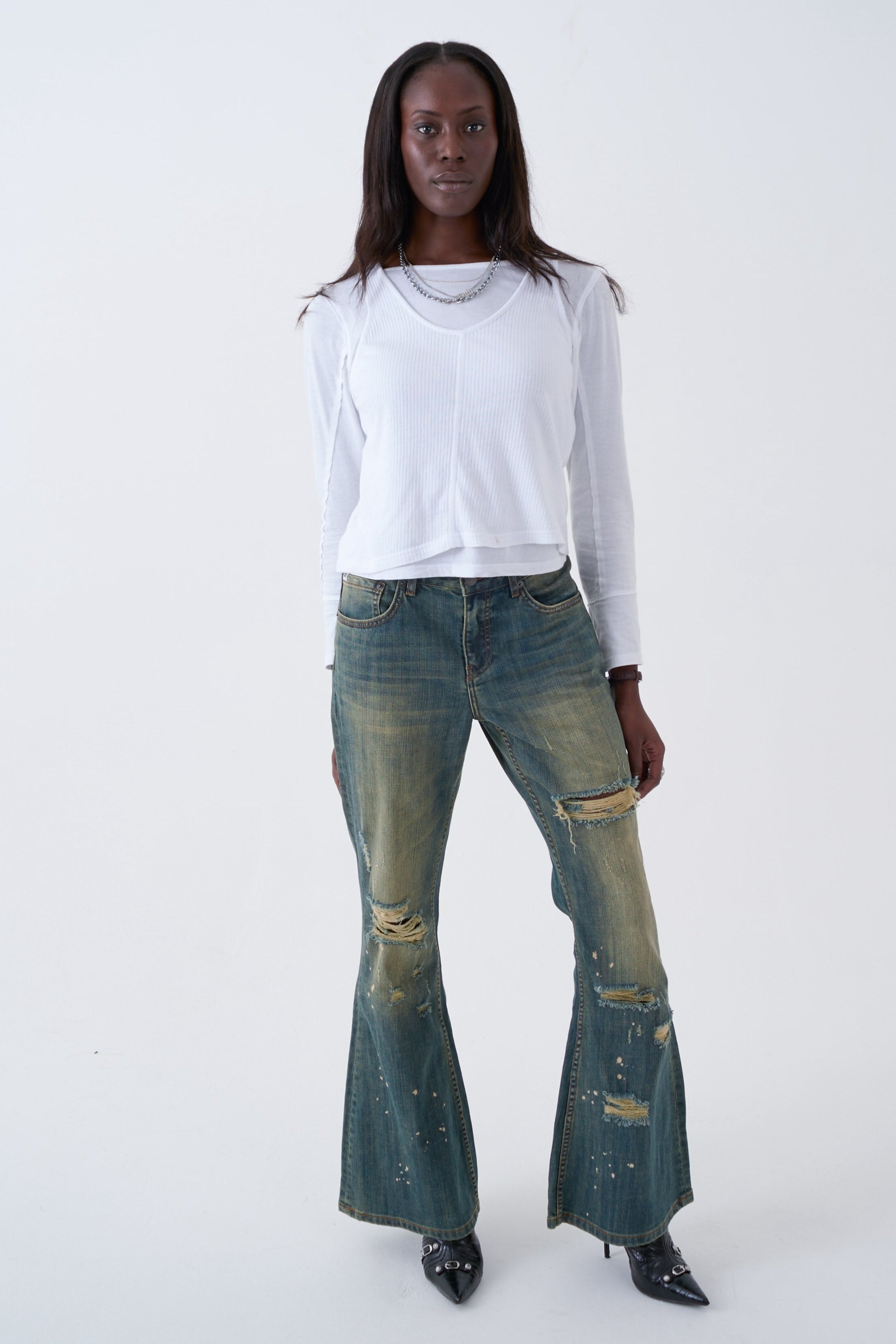 Extreme distressed vintage dirty rinse wash bootcut jean