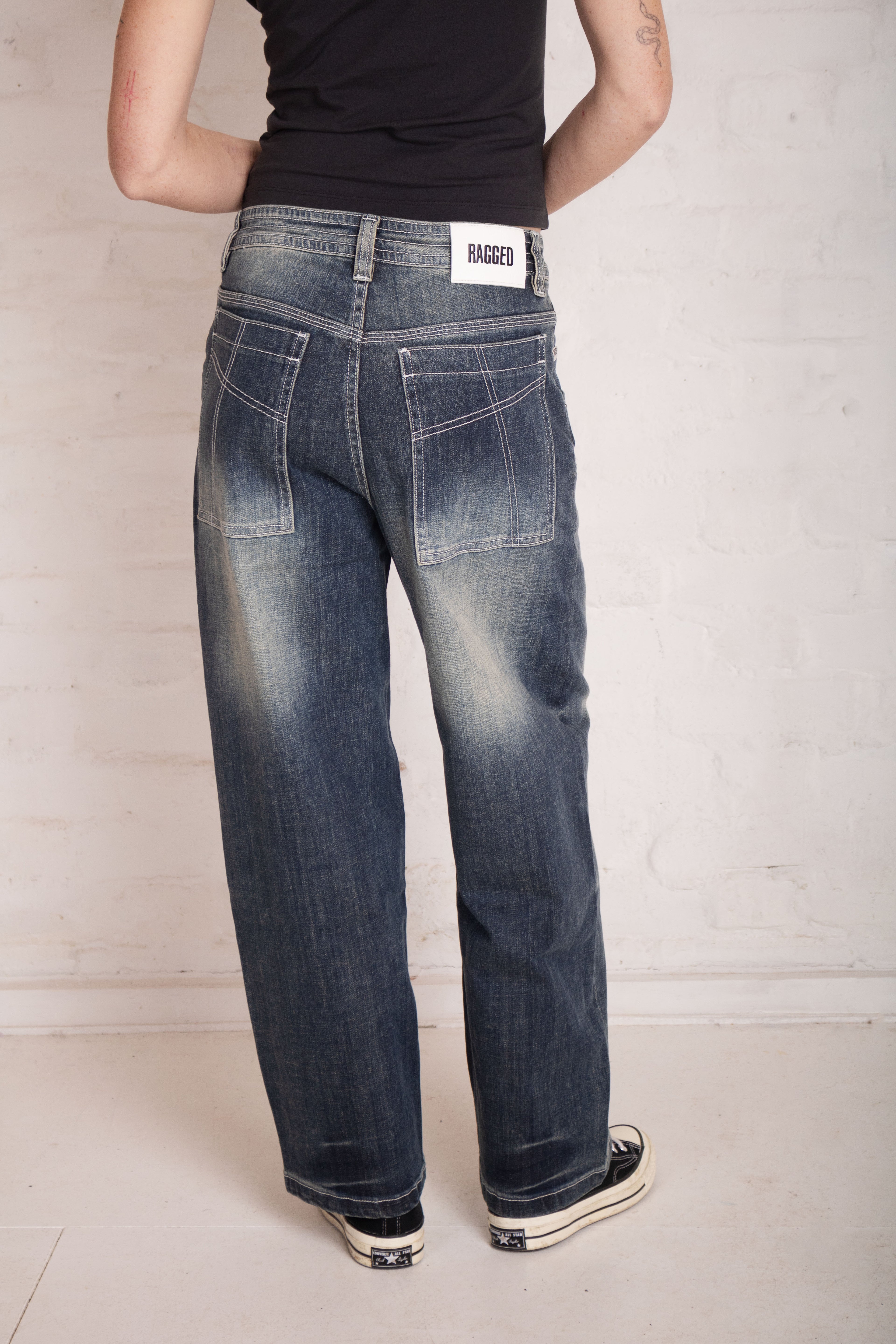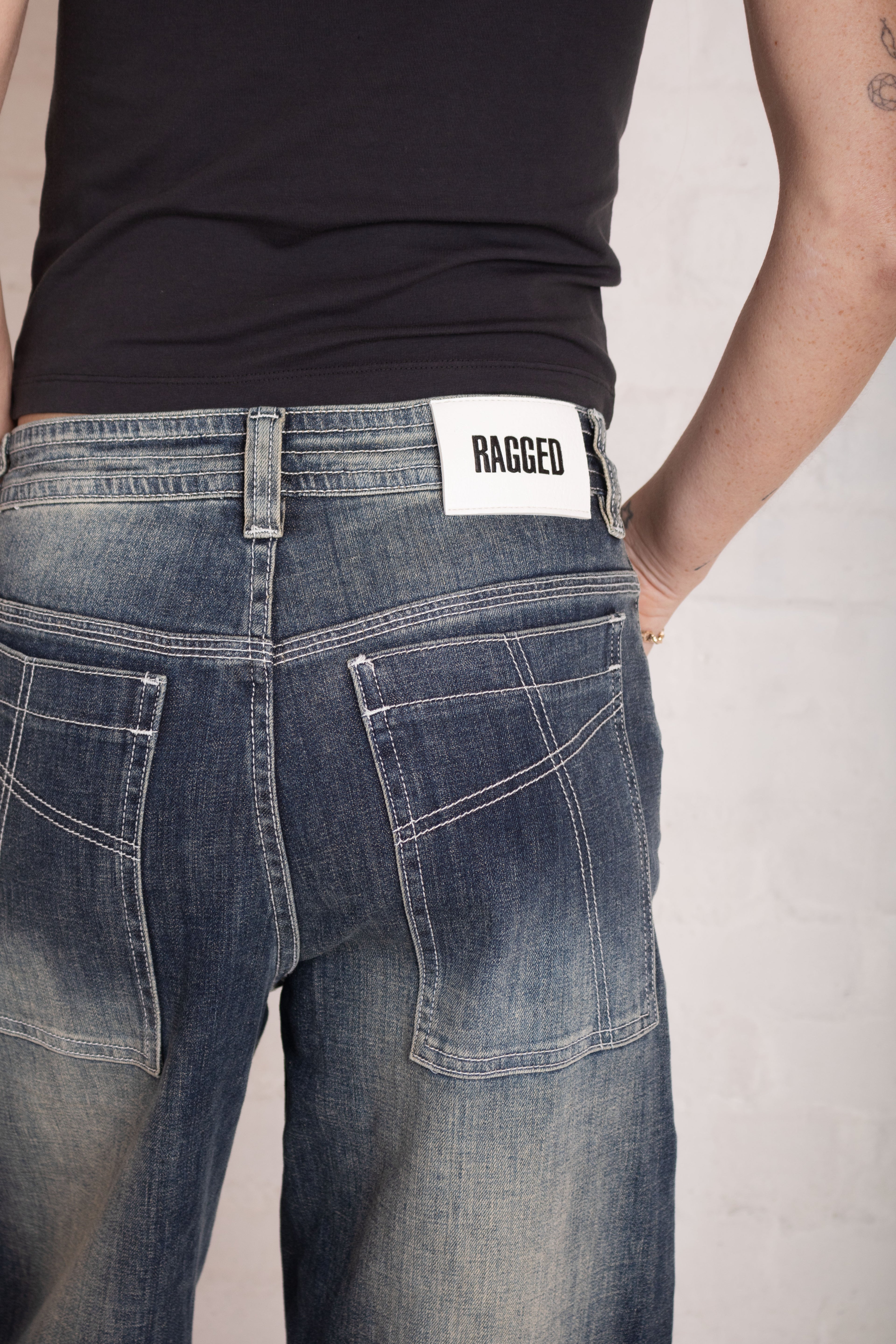 - Signature Ragged vegan leather logo patch and cross stitch on back pockets