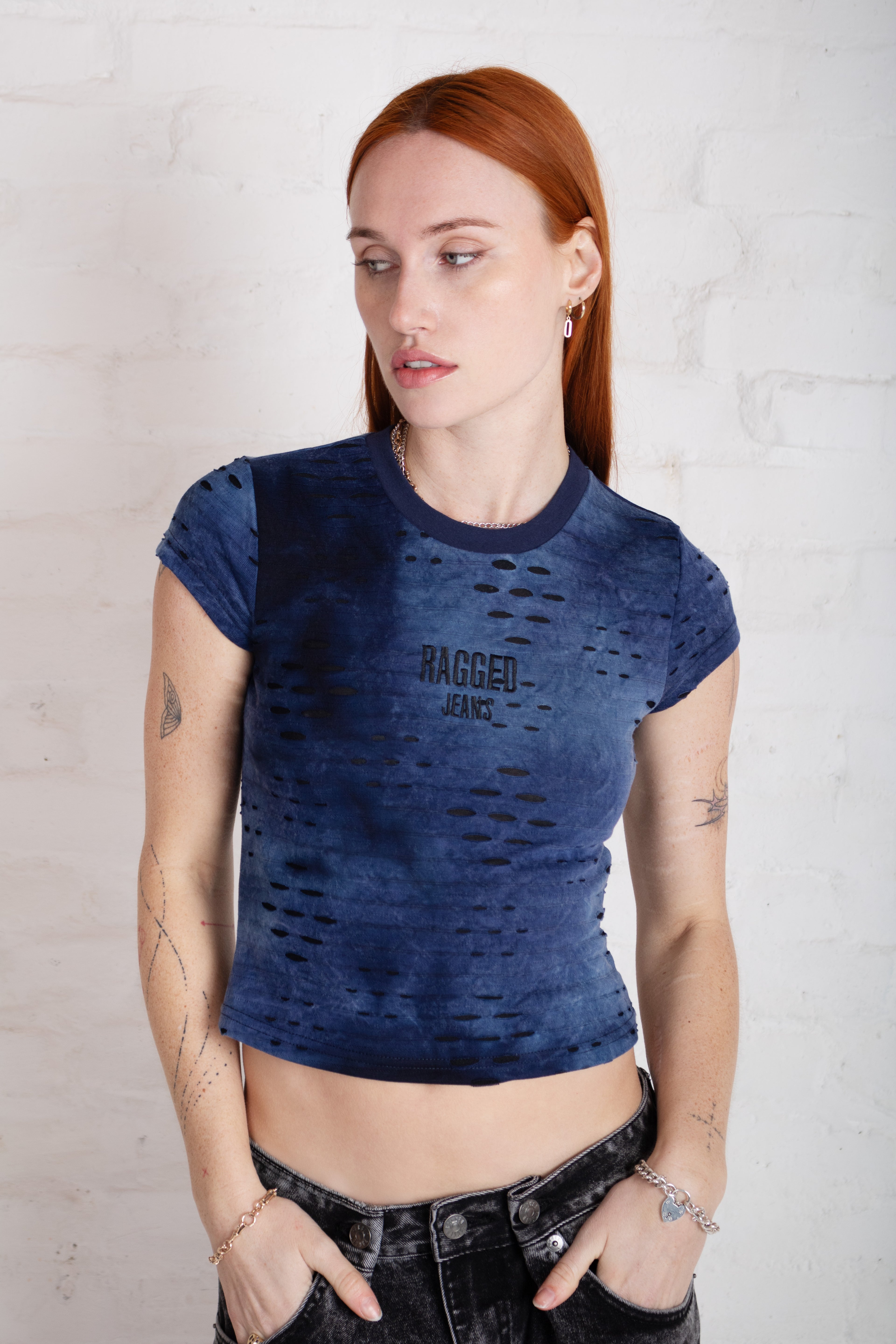 Black & blue tie dye textured baby tee with RAGGED logo