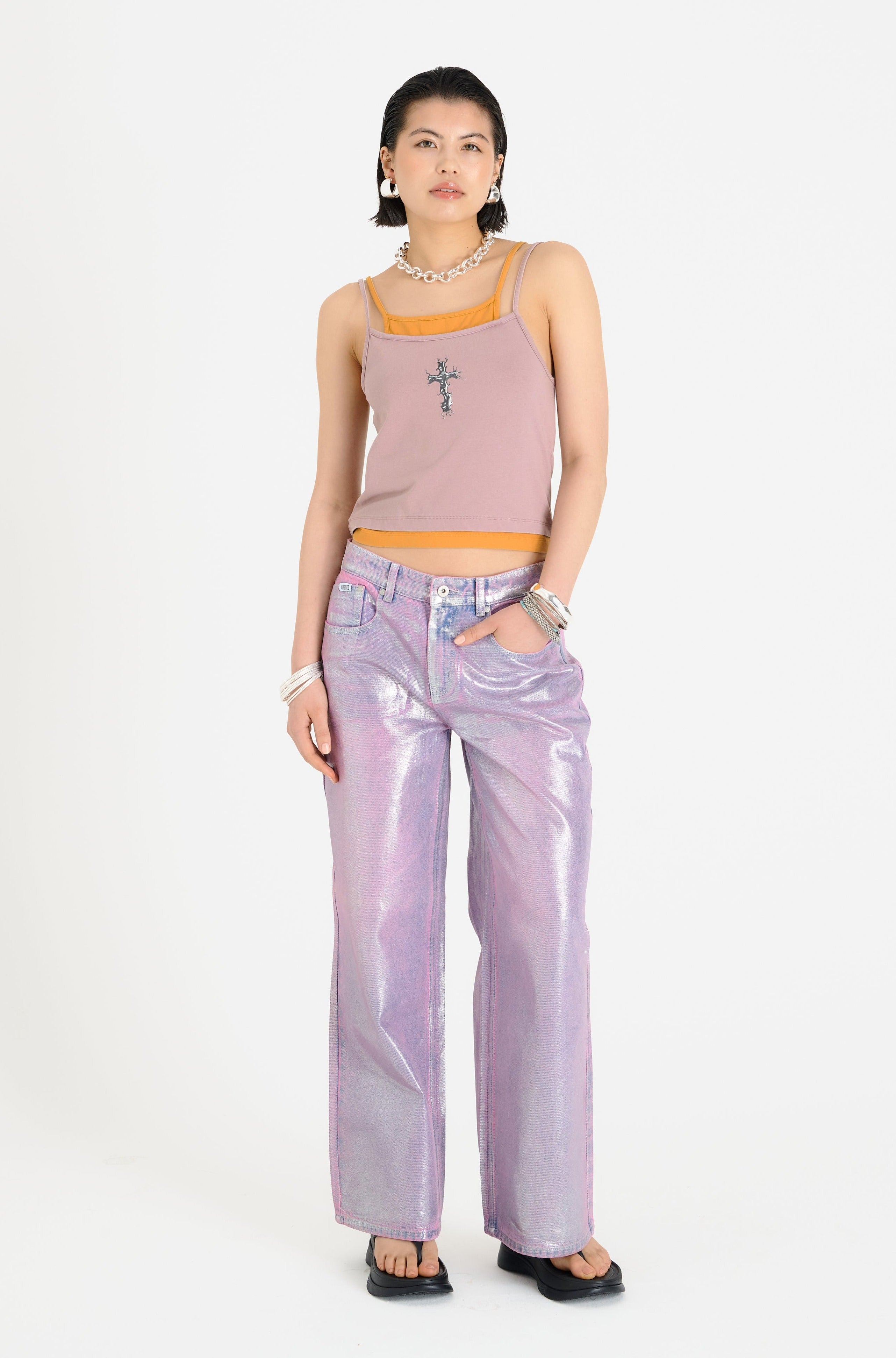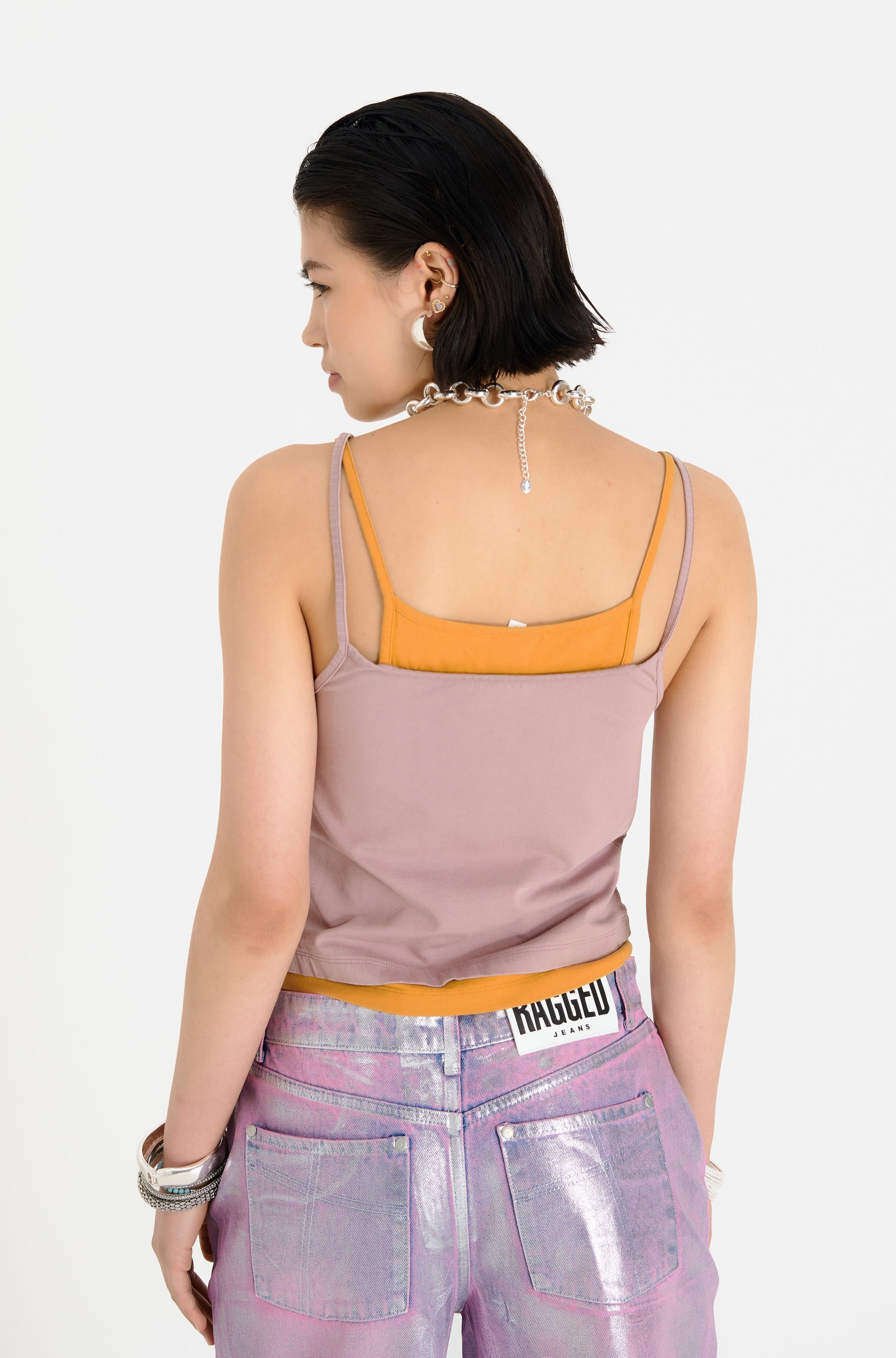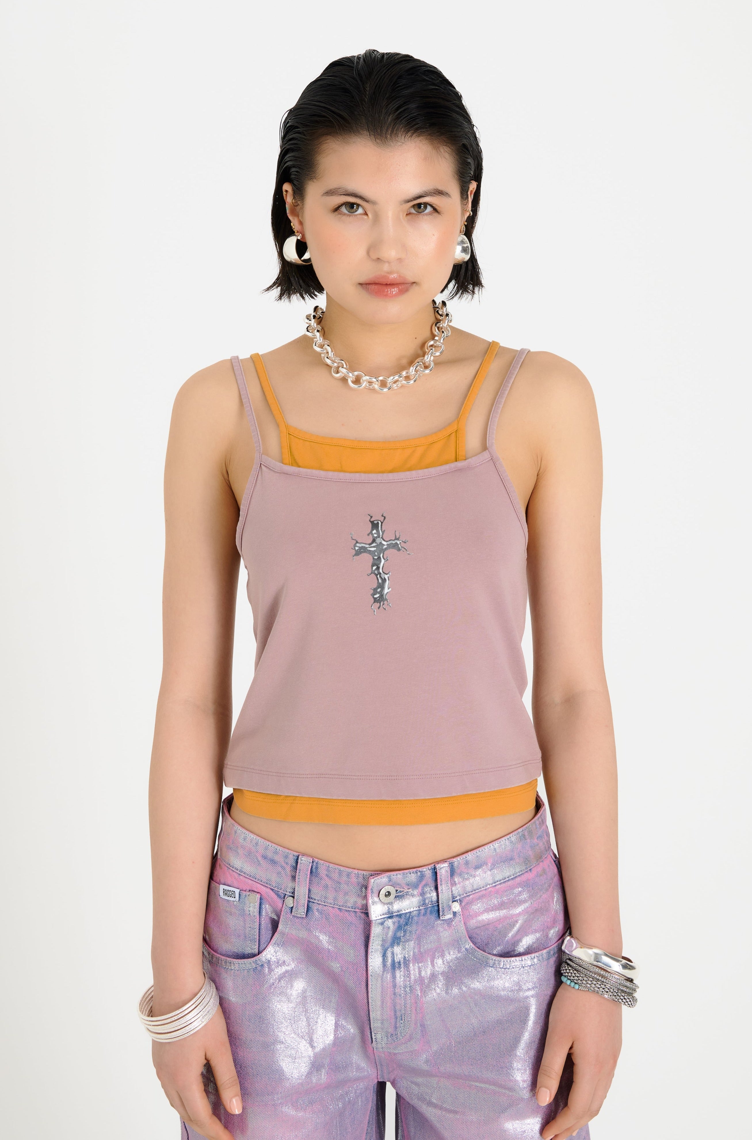 Lilac and yellow layered strappy vest top with metallic cross icon