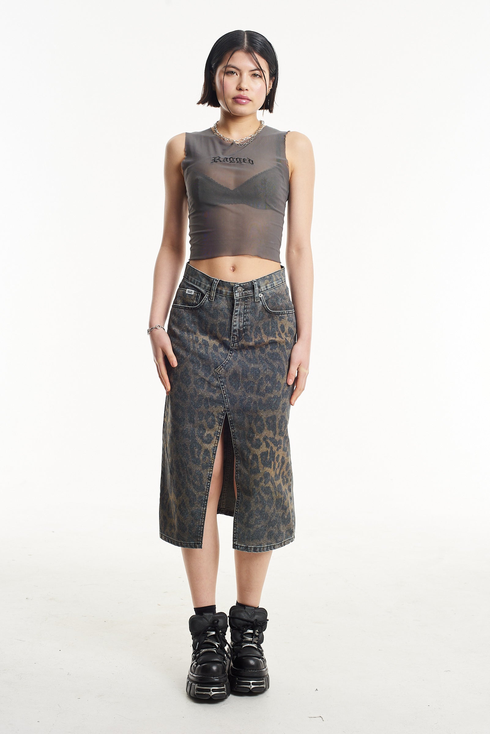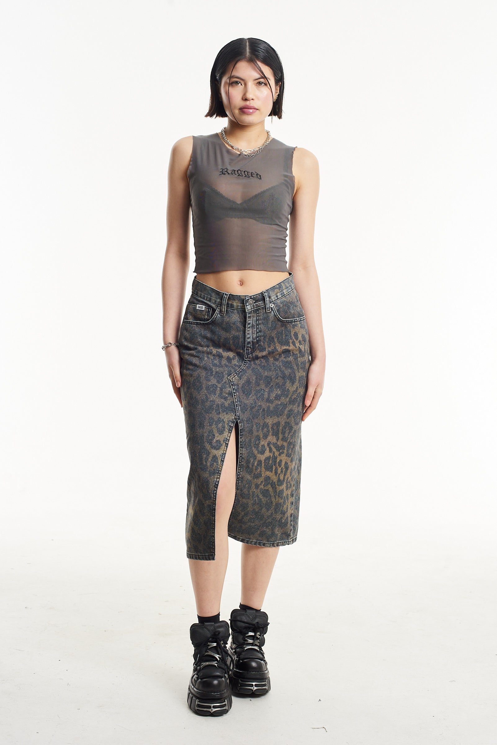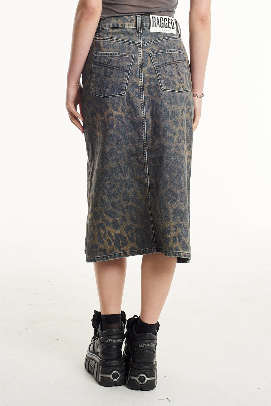 5 pocket denim midi skirt with front split in washed dark leopard print
