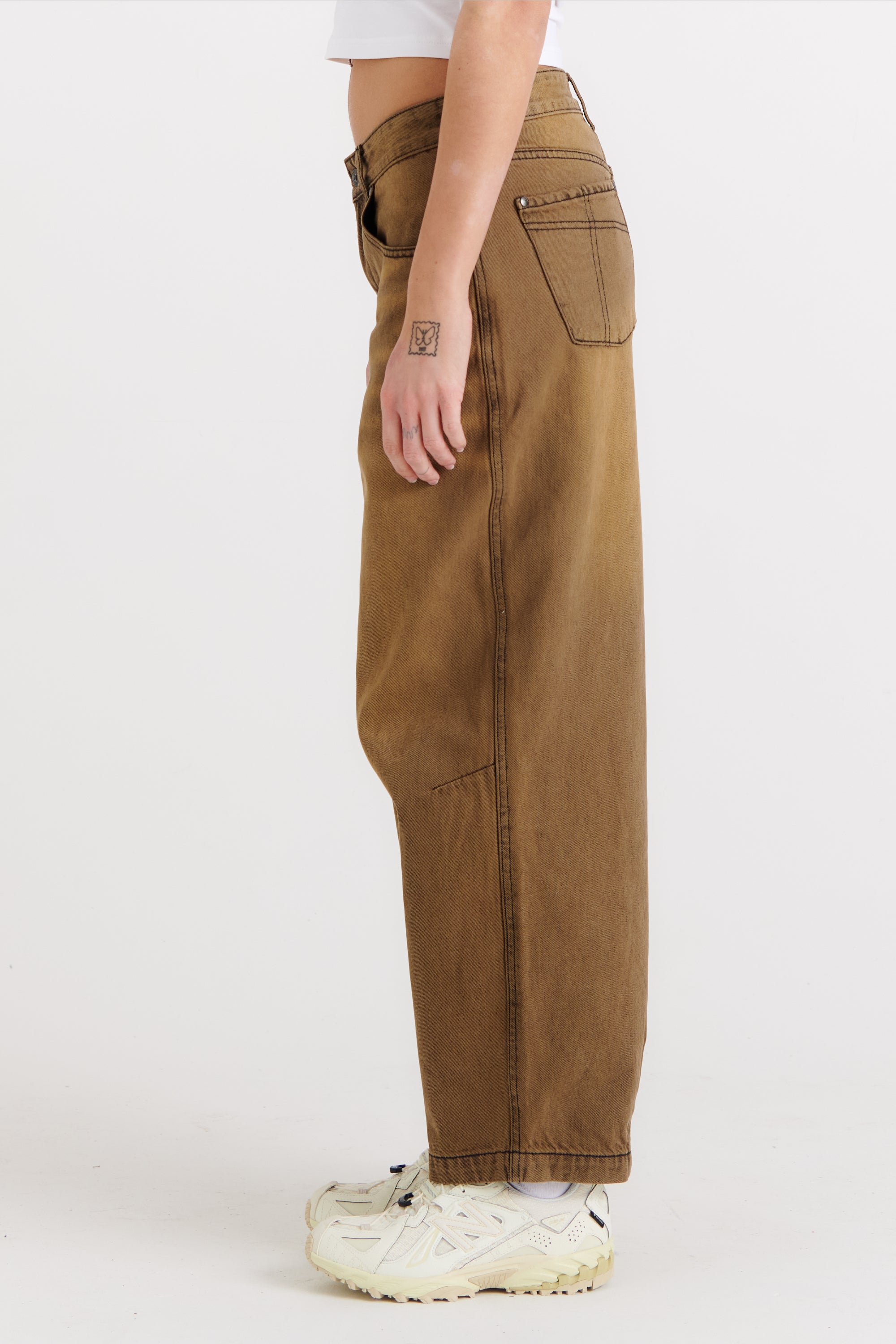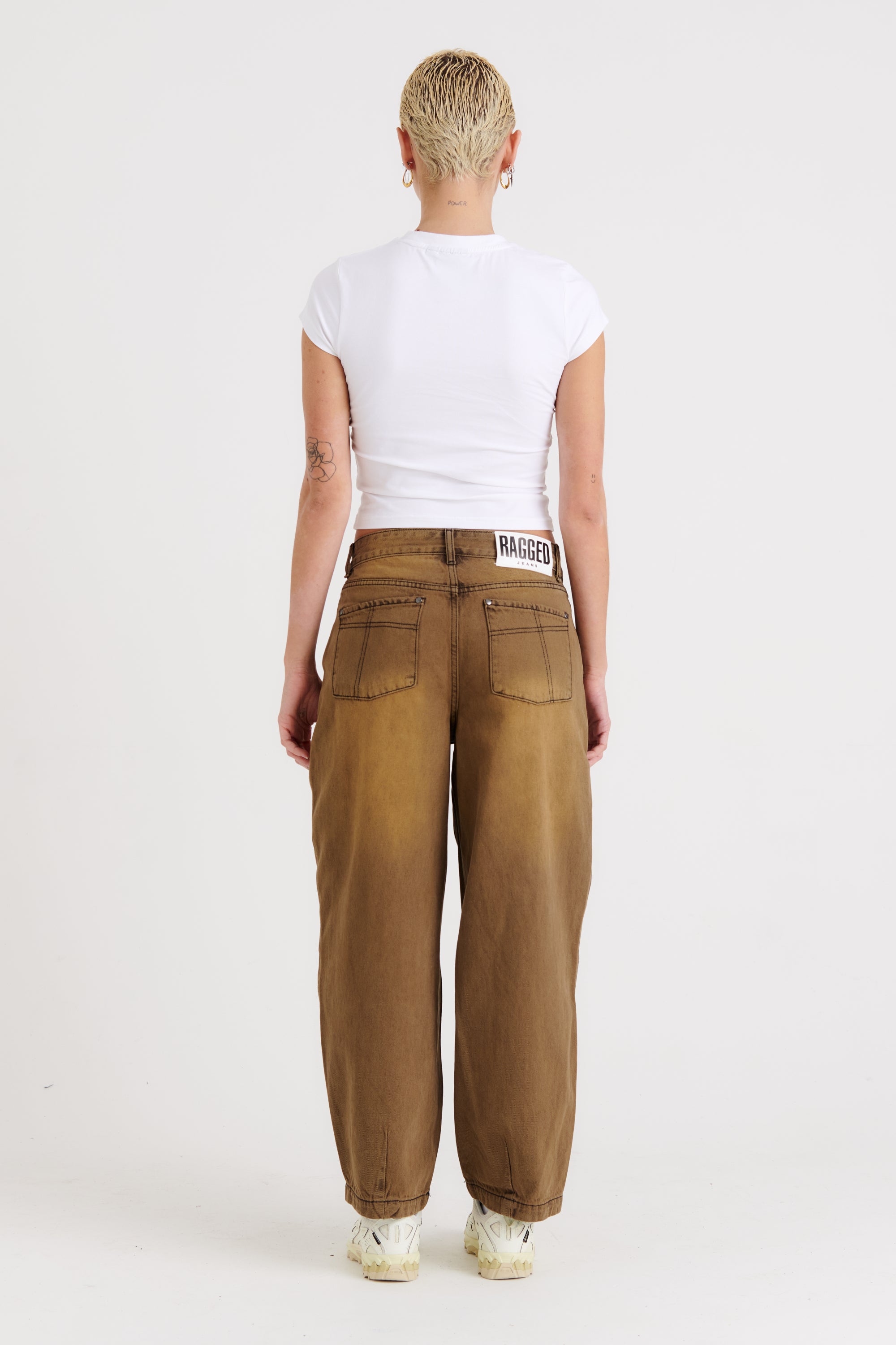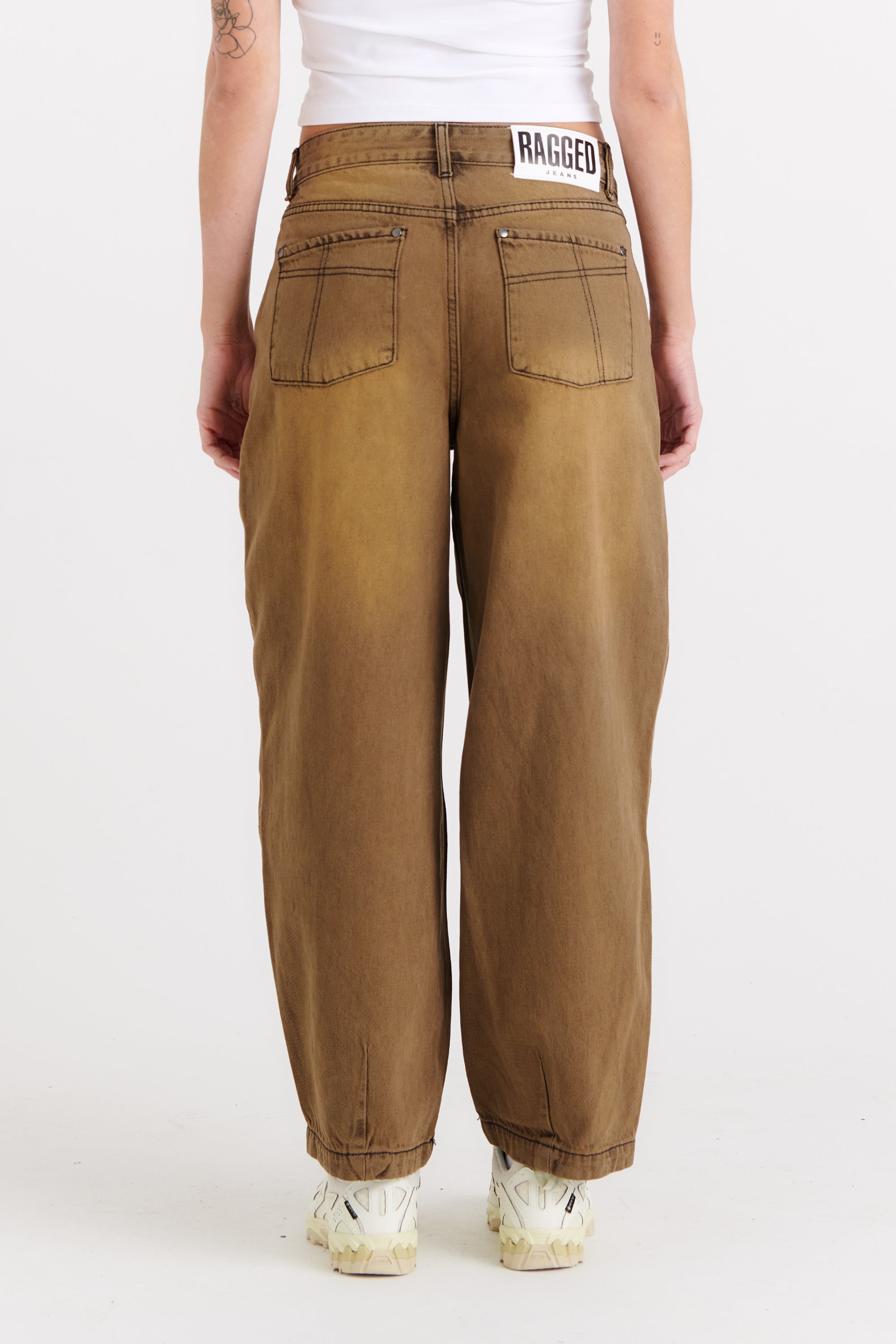Our signature Goliath Jean fit in our brown washed denim with our classic "Ragged Jeans" belt loop back tab.