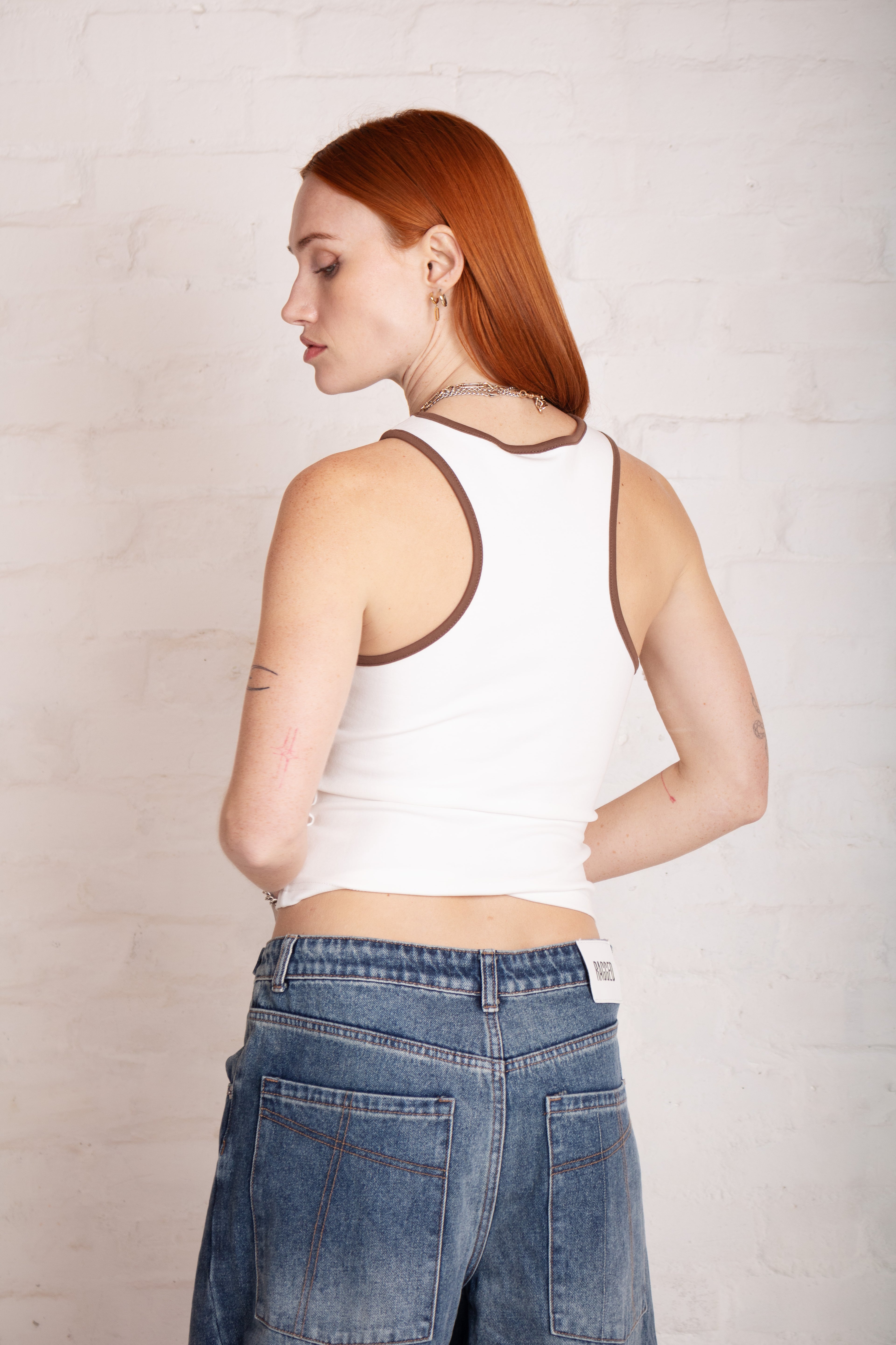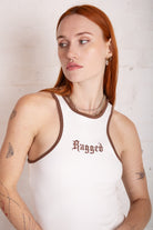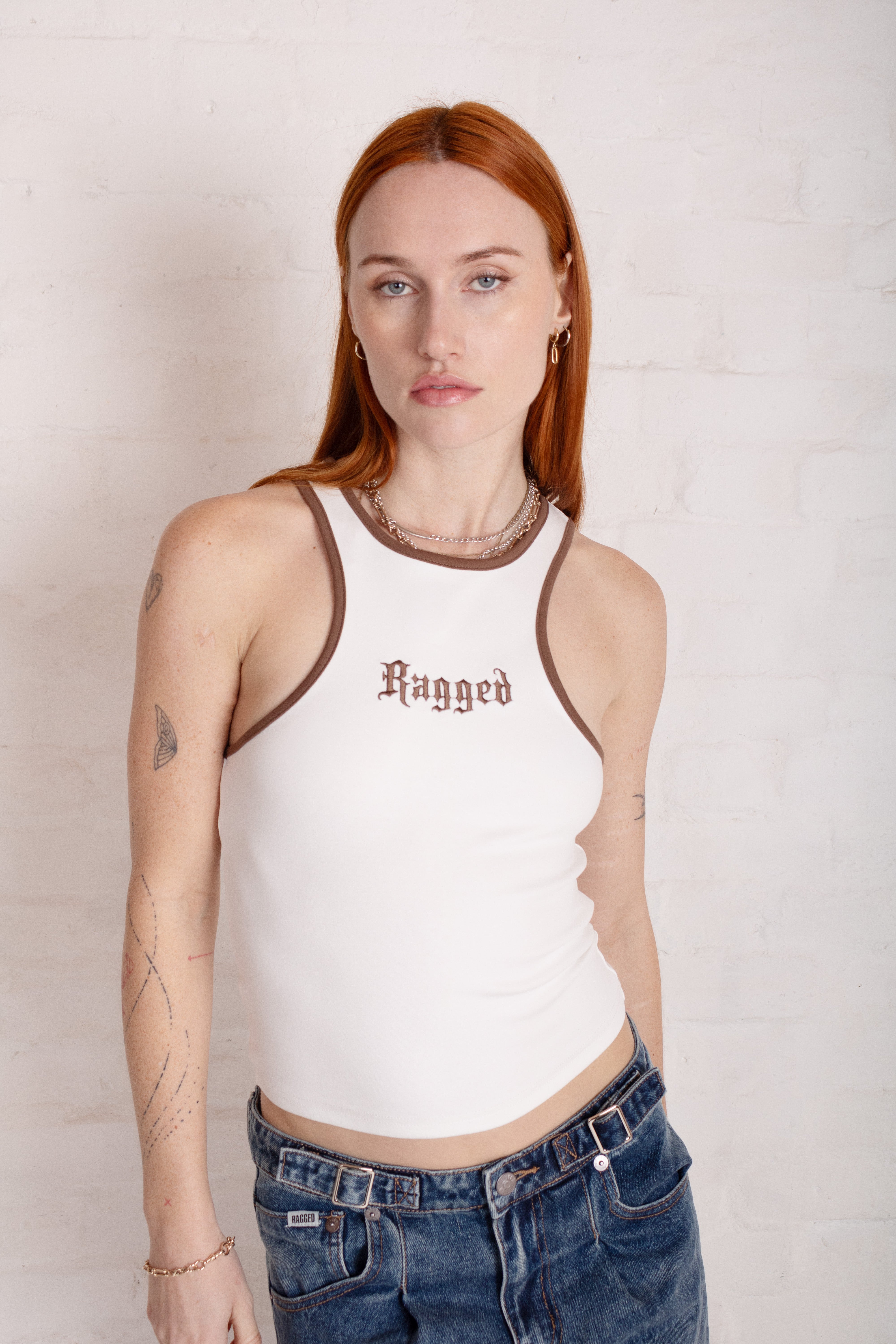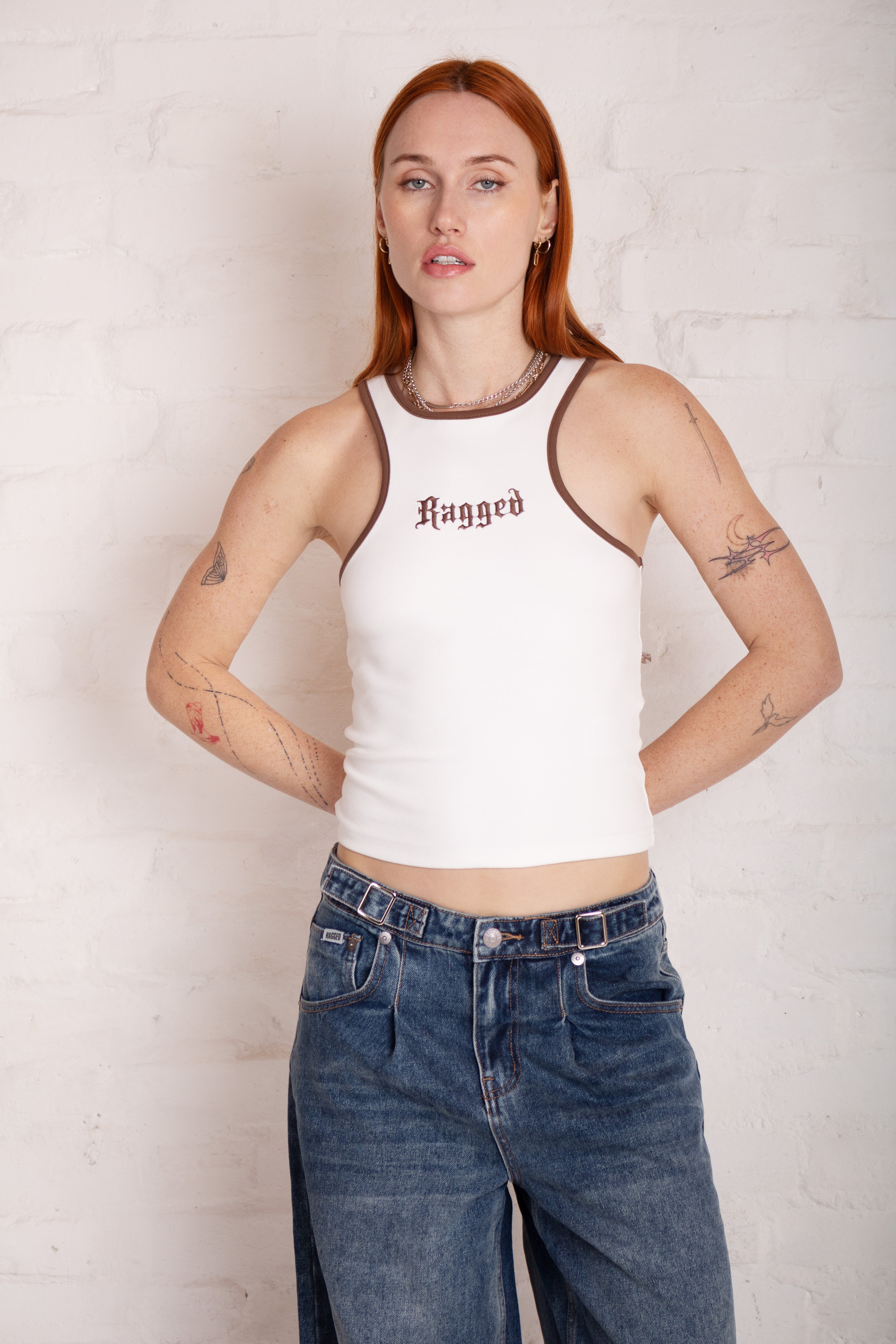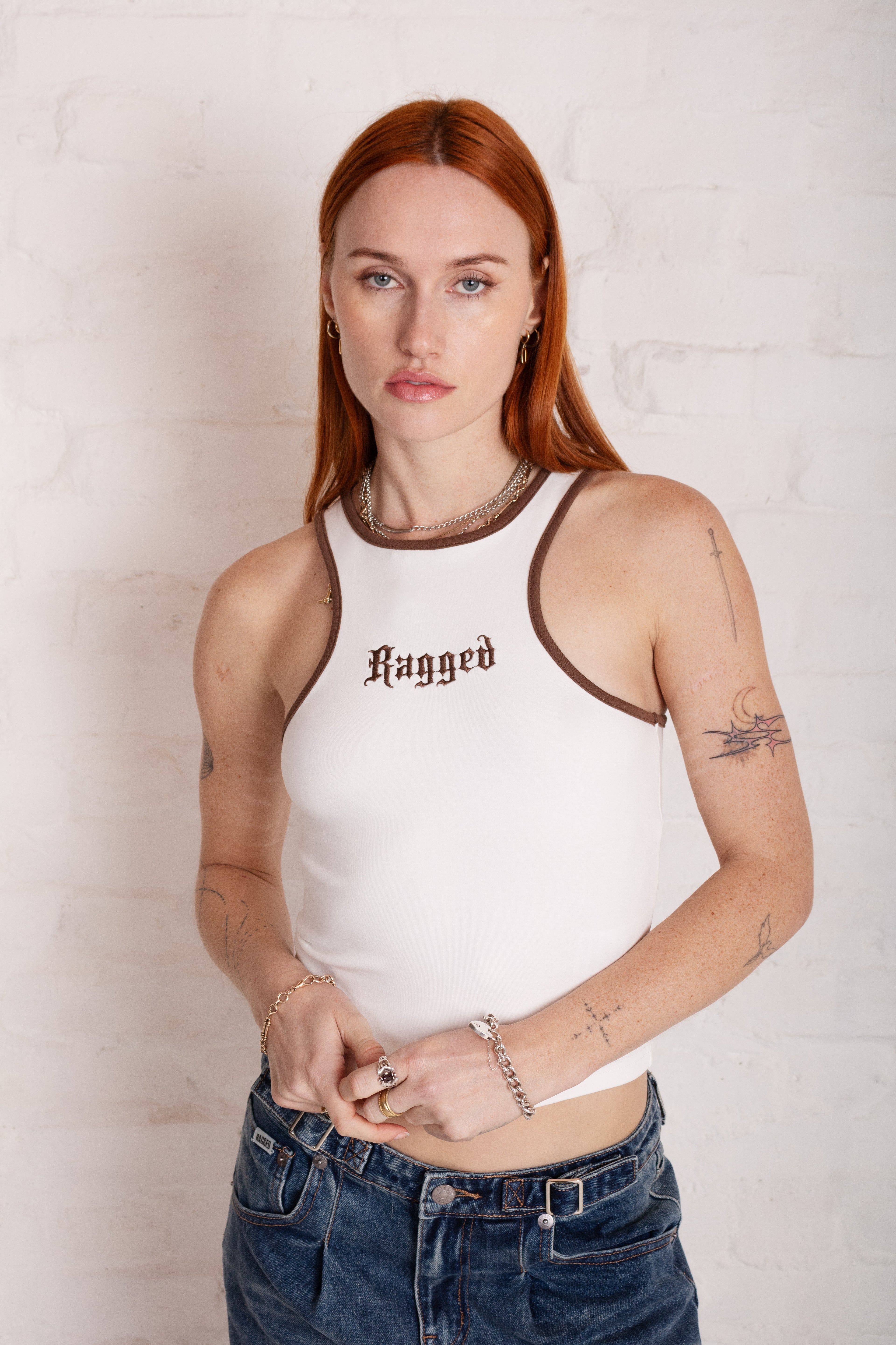 White racer vest top with brown ringer trim and embroidered gothic Ragged logo