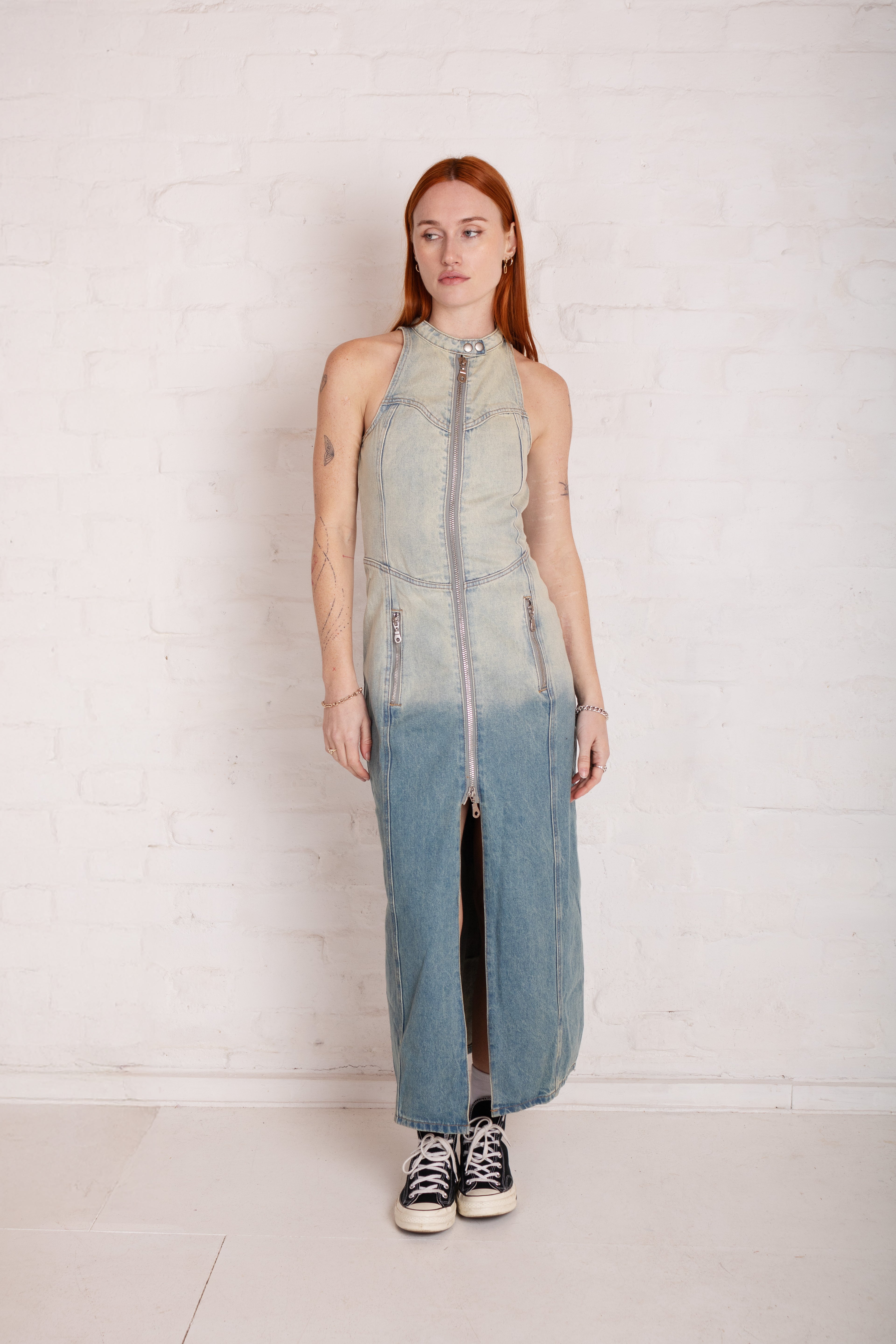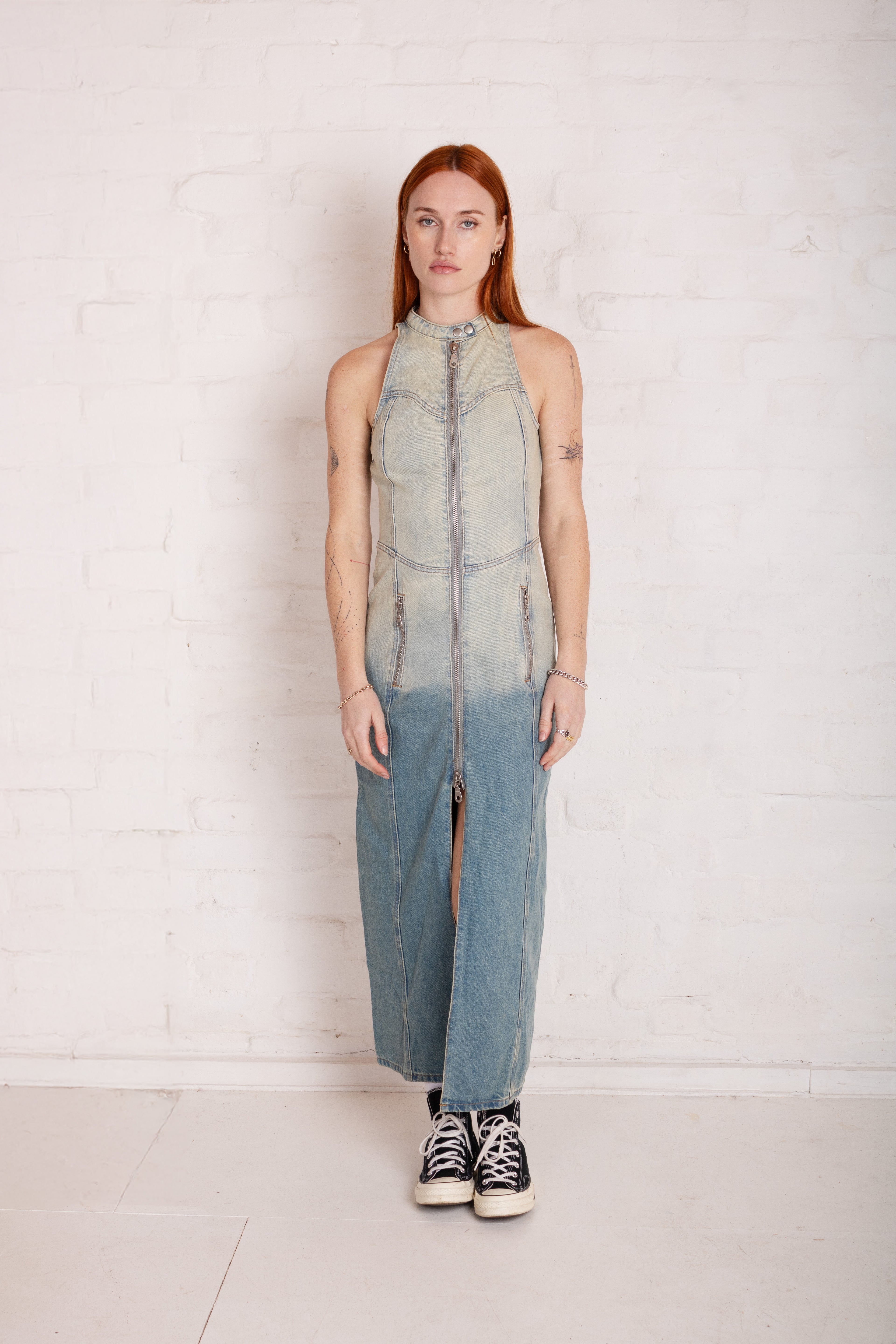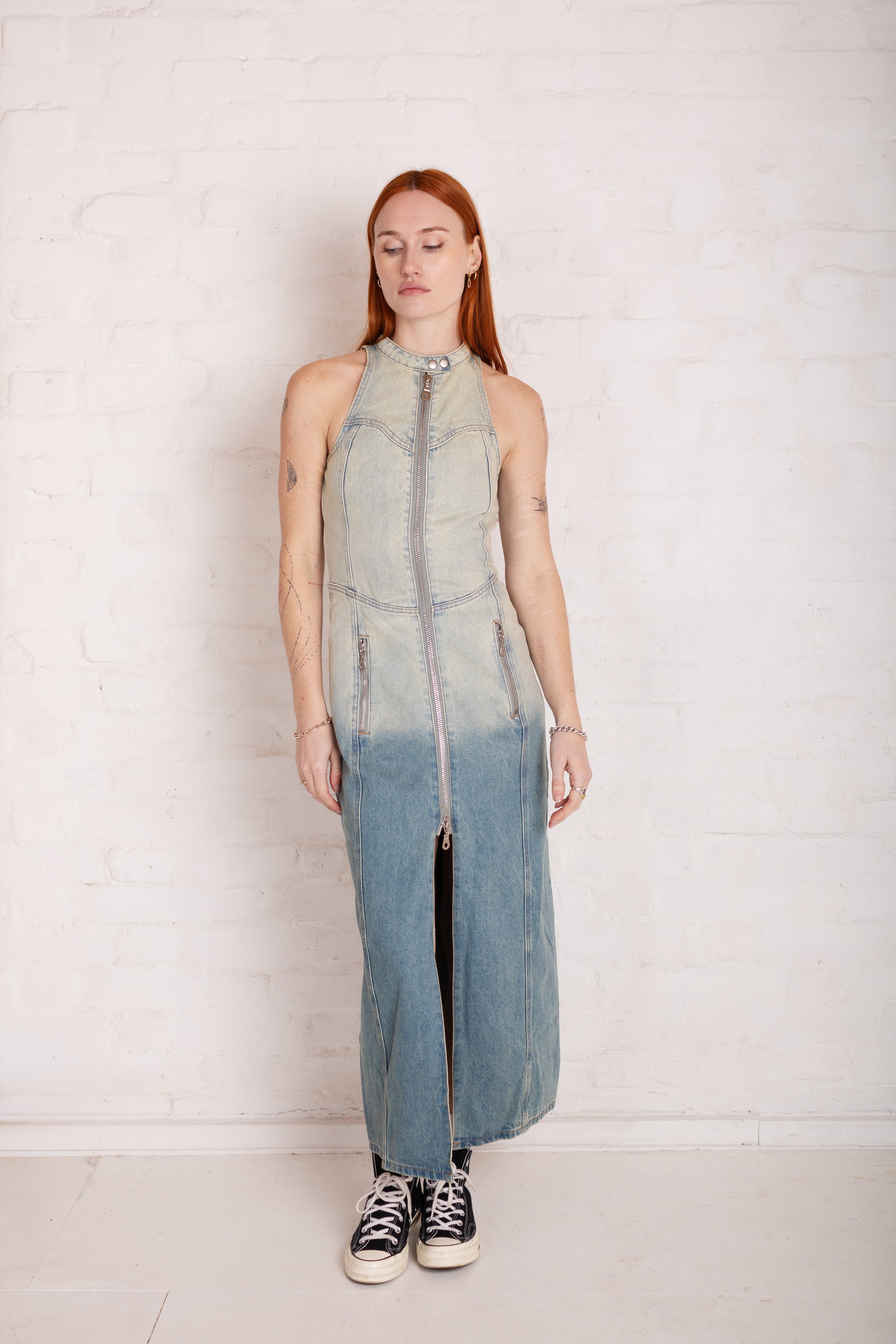 FITTED DENIM MOTOR MAXI DRESS W/SEAM DETAIL & ZIPs