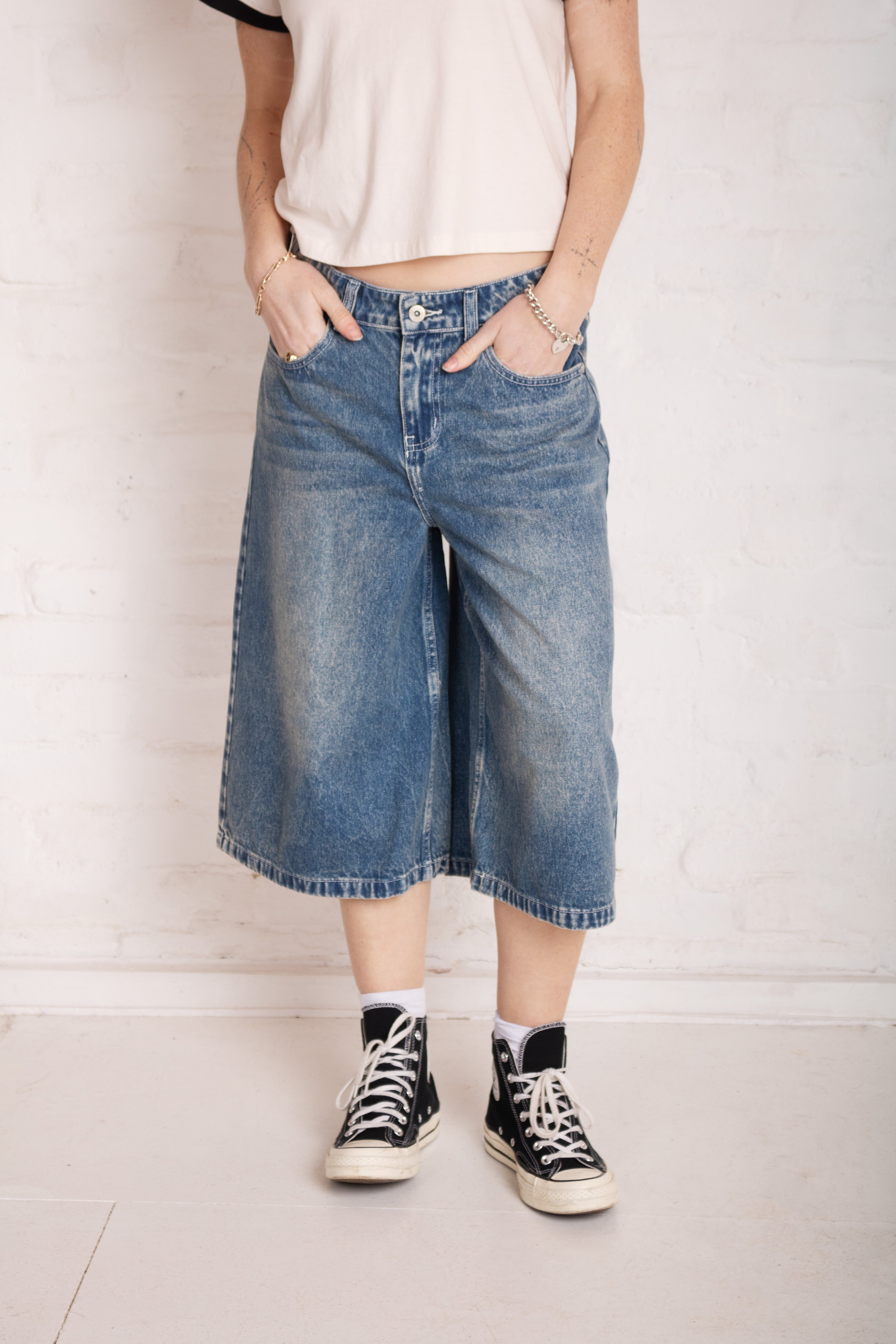 Our iconic Release Jean, in a Jort. Low rise, ultra baggy long line denim shorts in a vintage mid wash blue denim