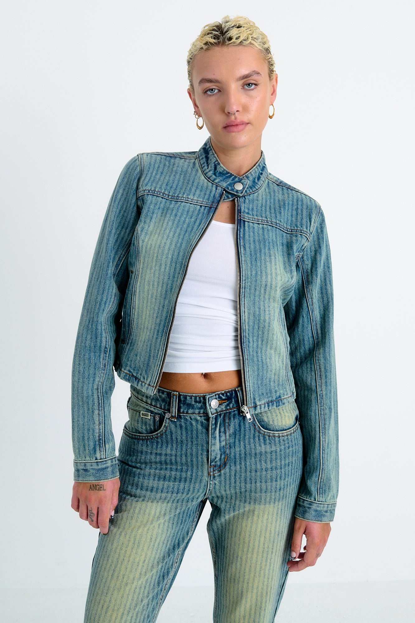 Extreme dirty wash pinstripe slim fitting moto denim jacket