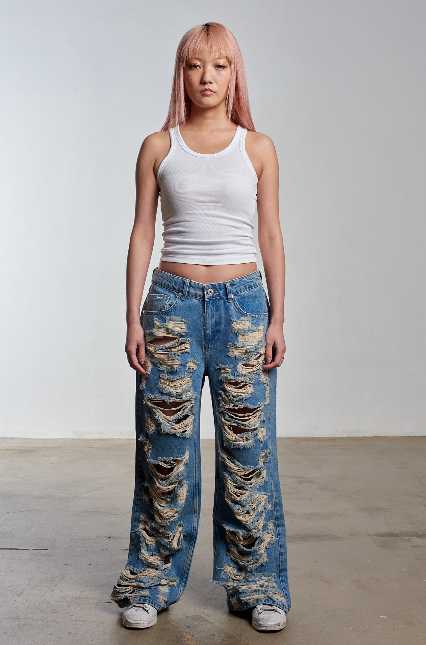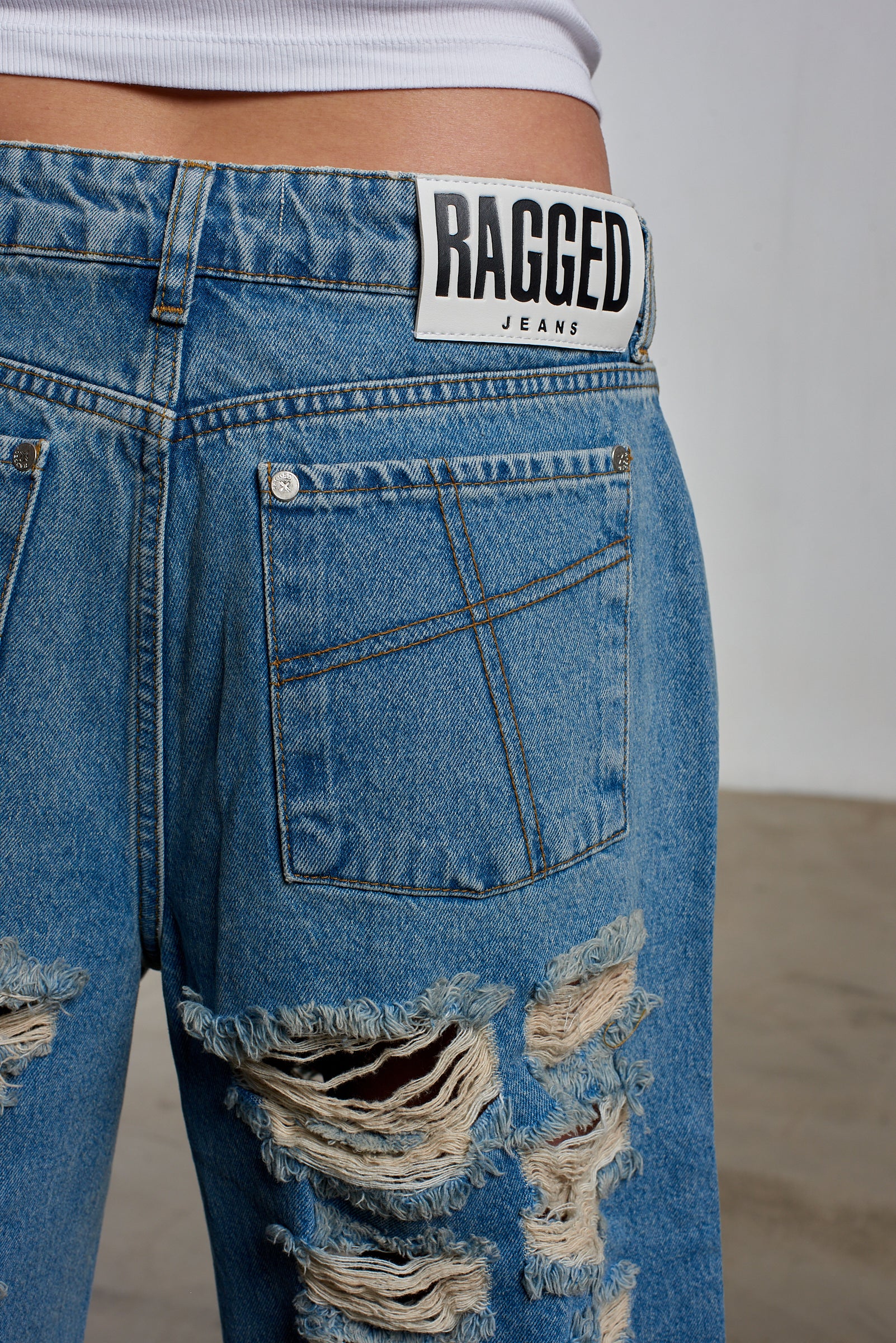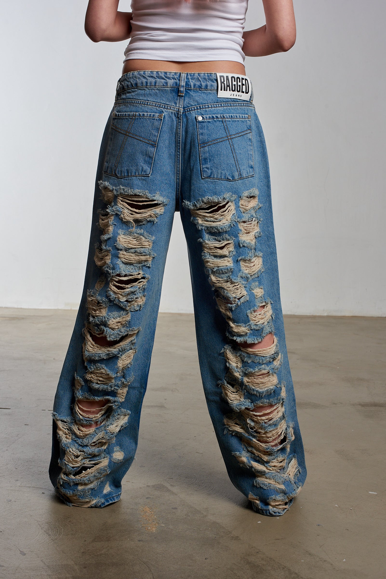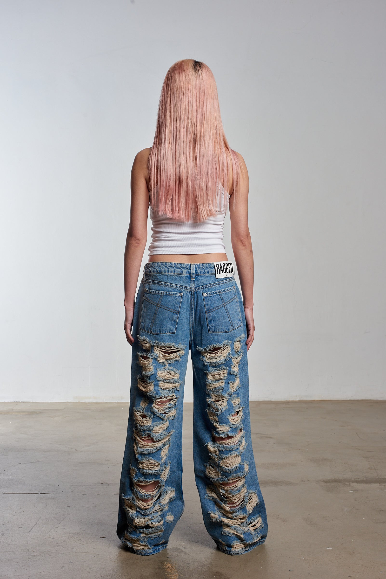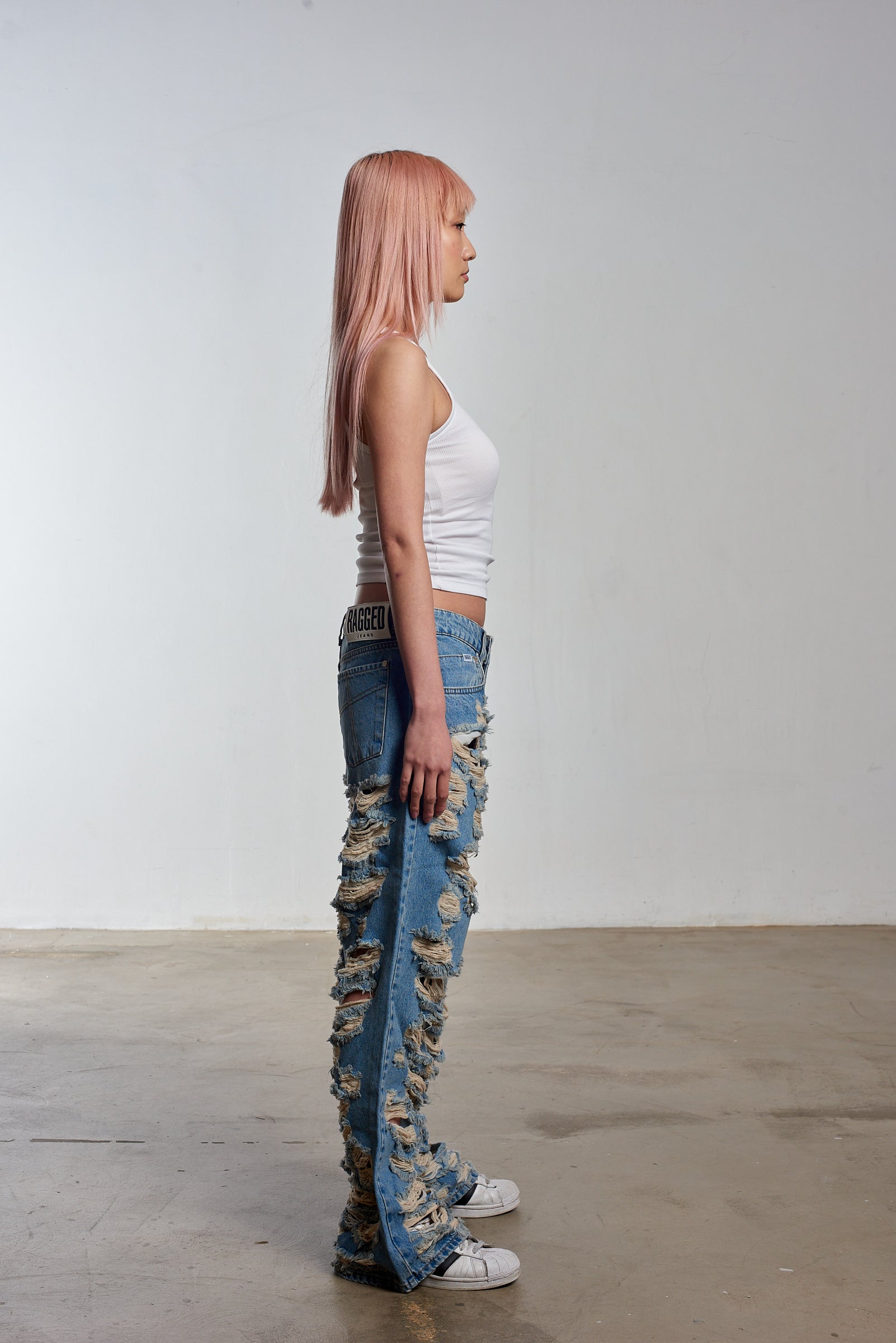The Ragged Priest signature Release Jean fit in our blue wash denim with extreme slashed distressing and our classic "Ragged Jeans" belt loop back tab.