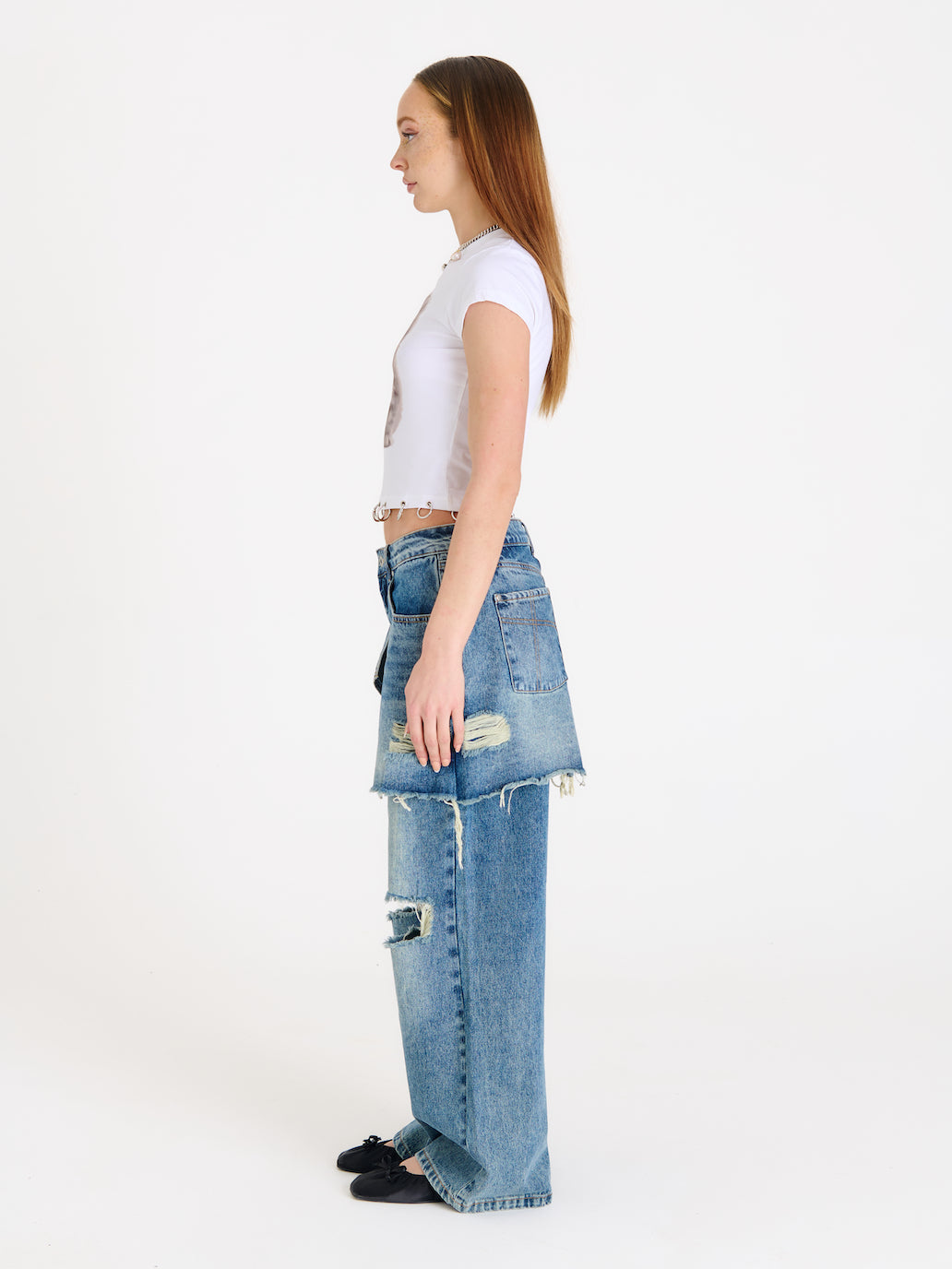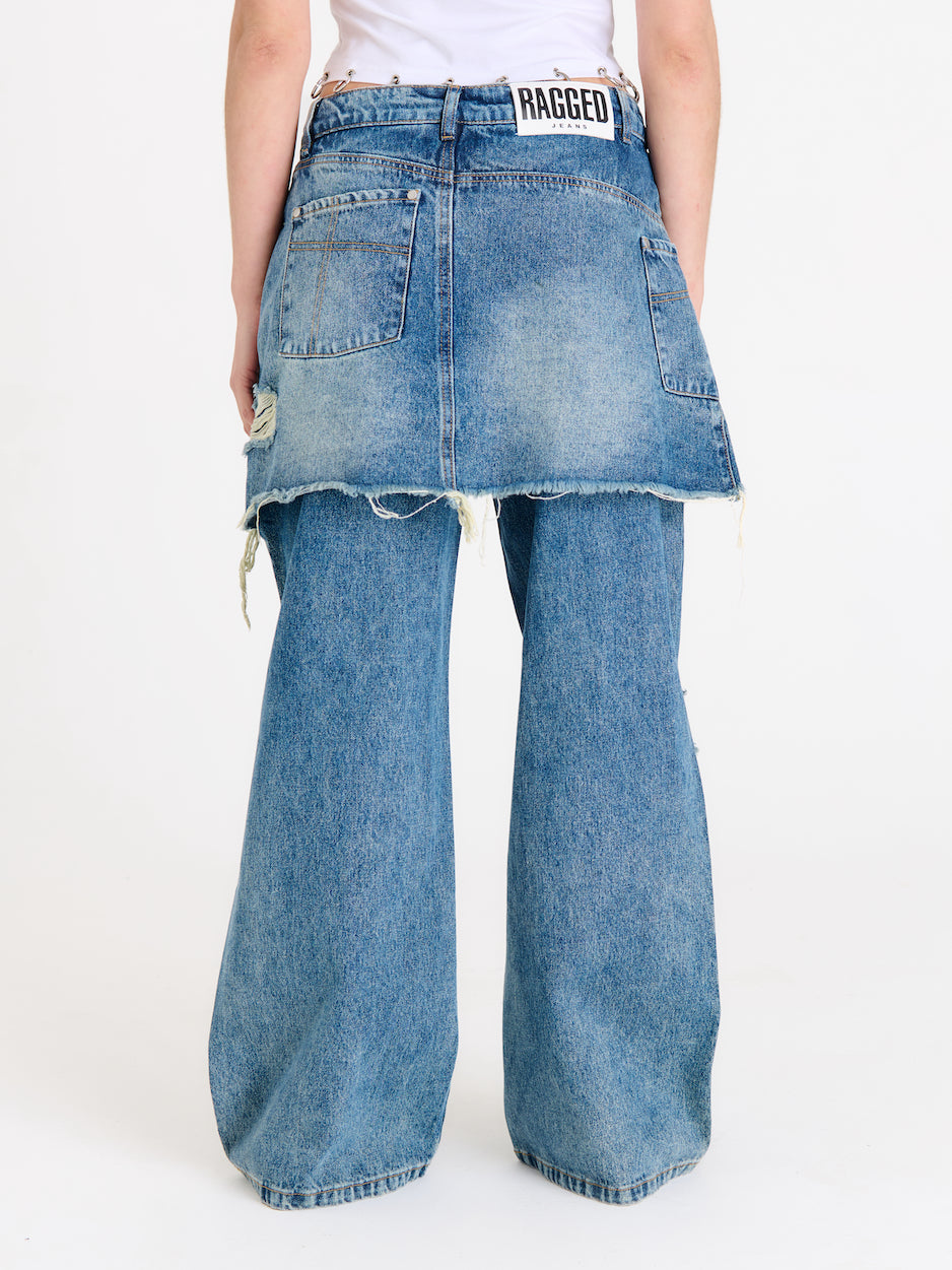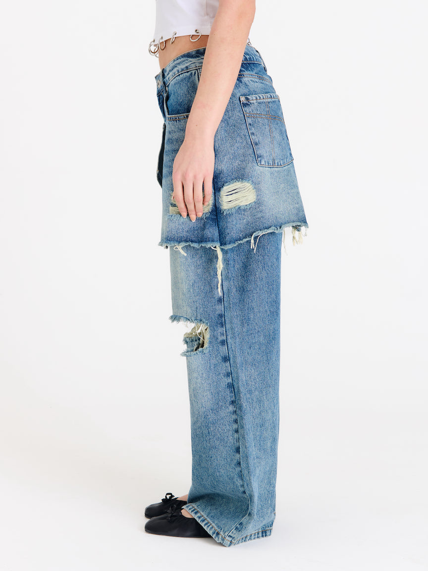 Dreamscape collection: Dirty wash indigo low rise baggy release jean with skirt overlay and distressing