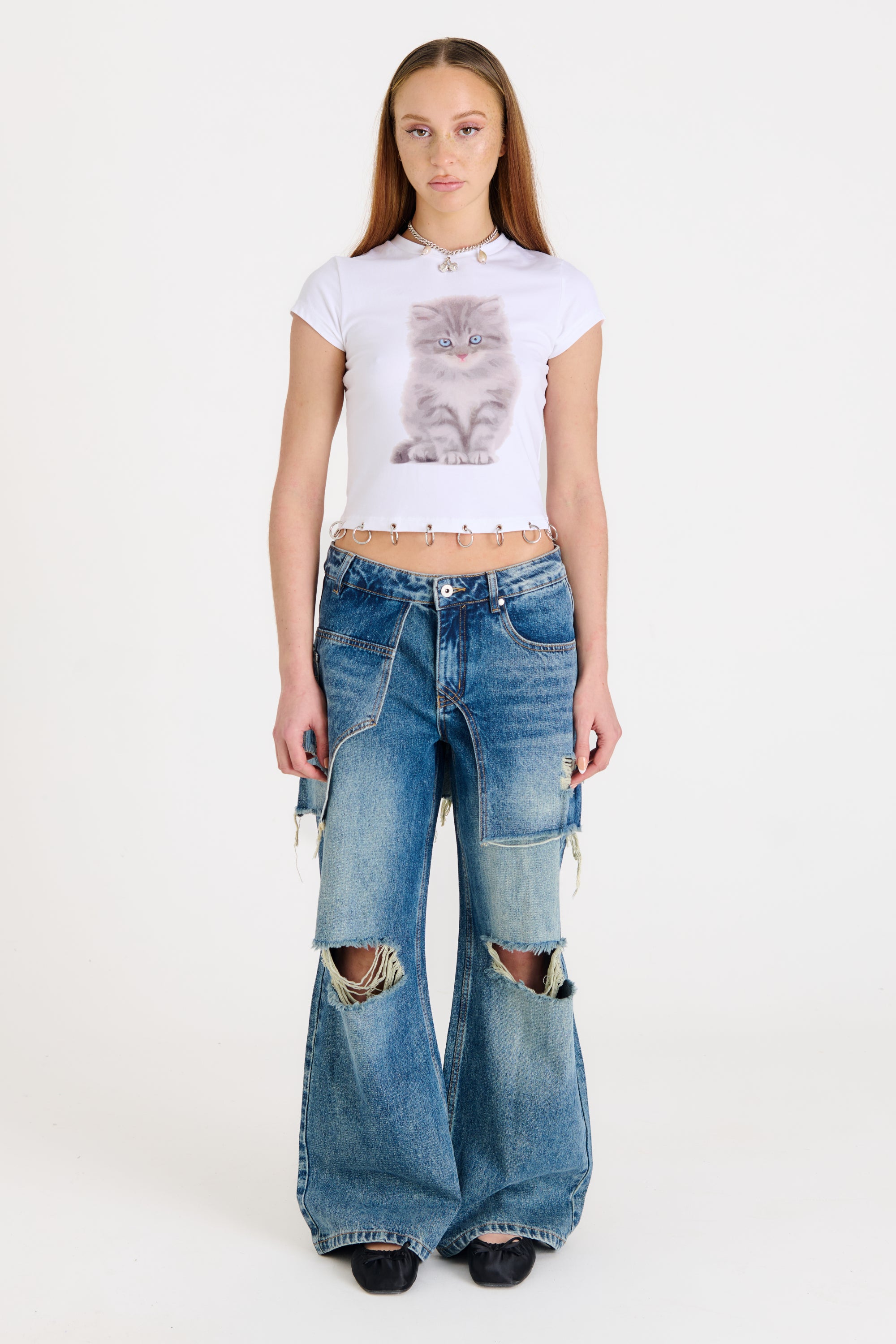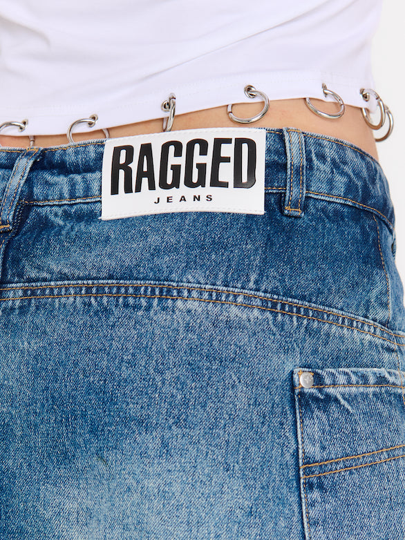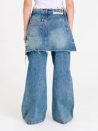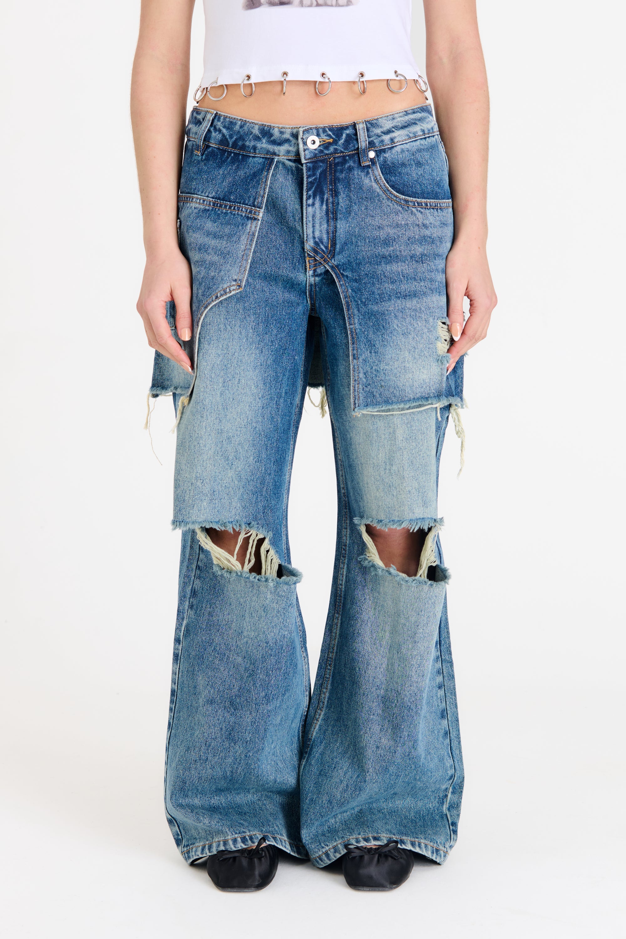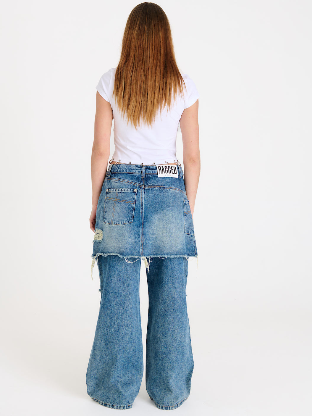 Dreamscape collection: Dirty wash indigo low rise baggy release jean with skirt overlay and distressing