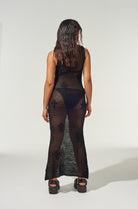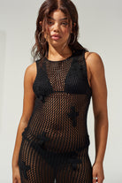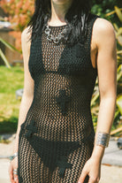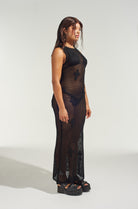 The Ragged Priest black open knit maxi dress beach cover up with all over 3D cross detail and back neck button fastening.
