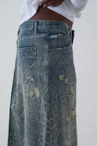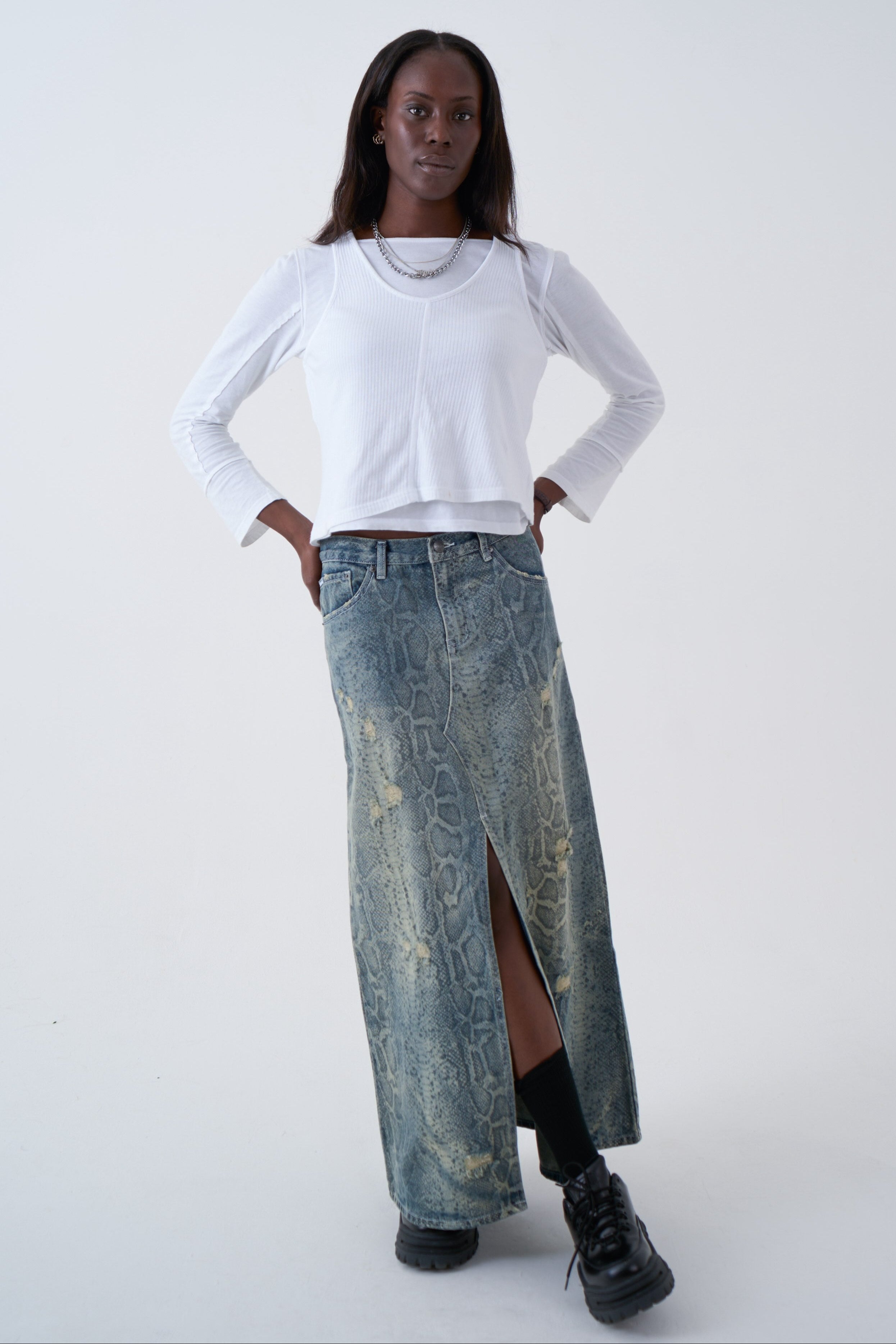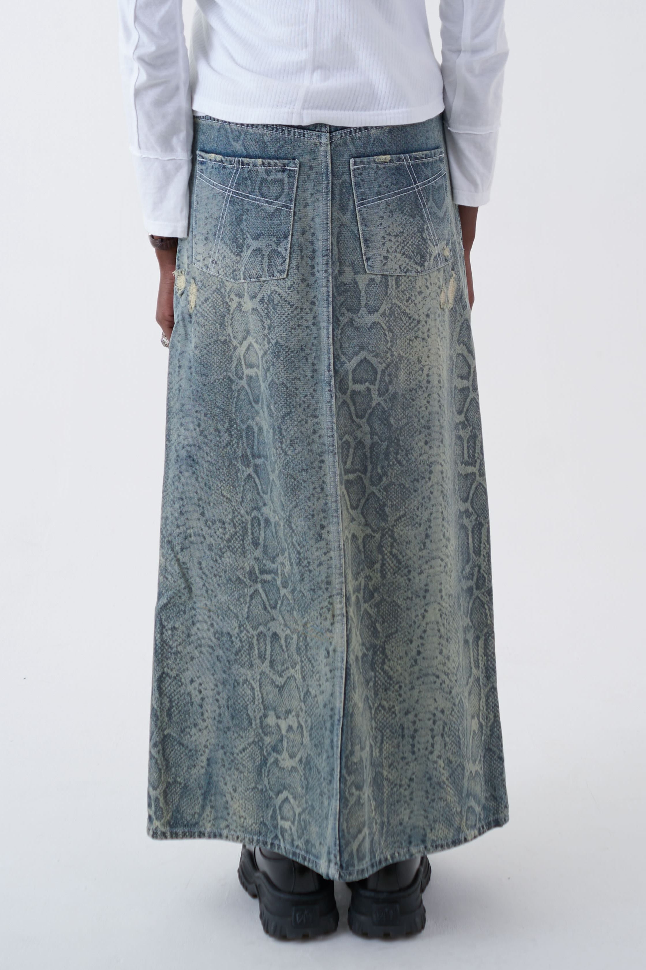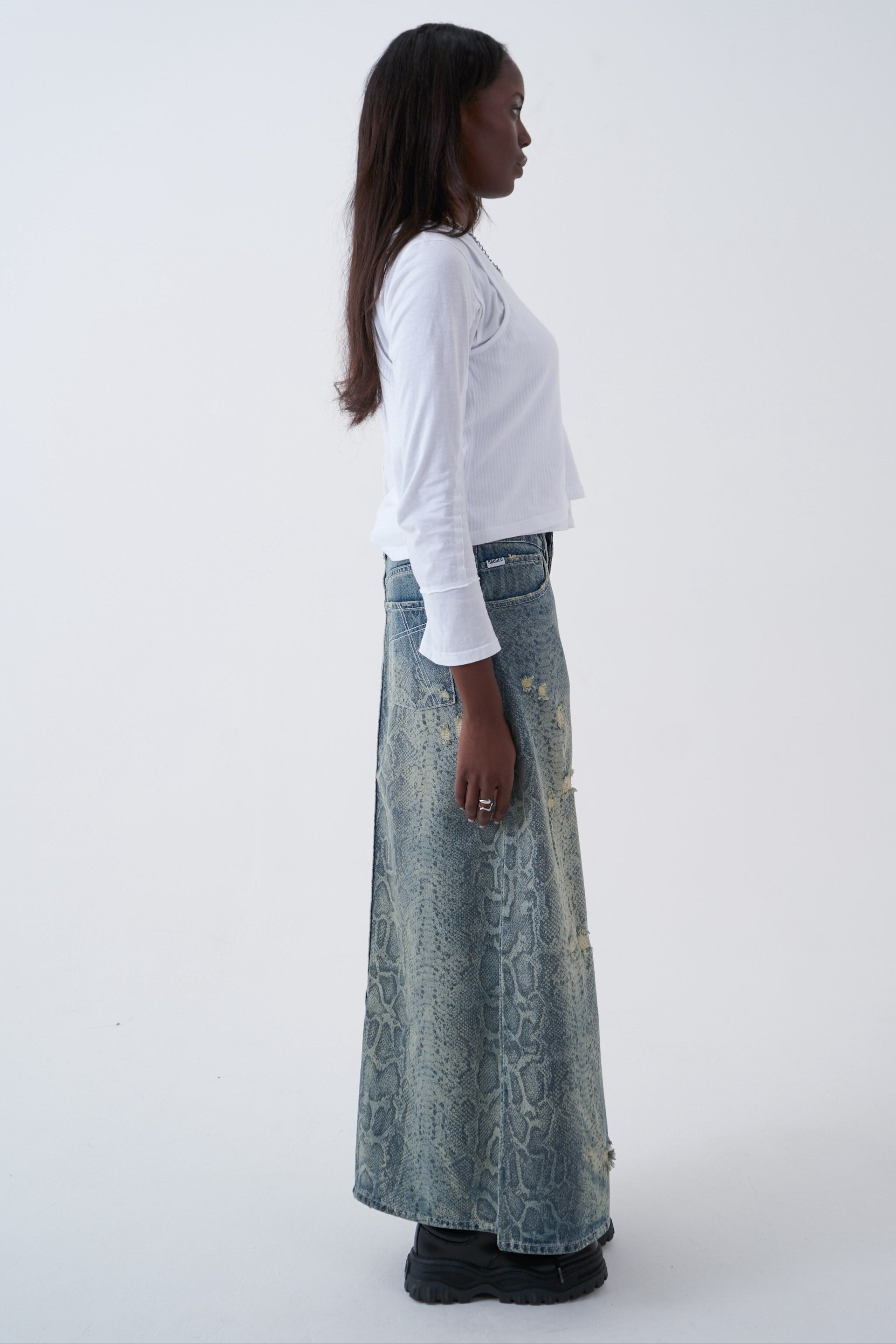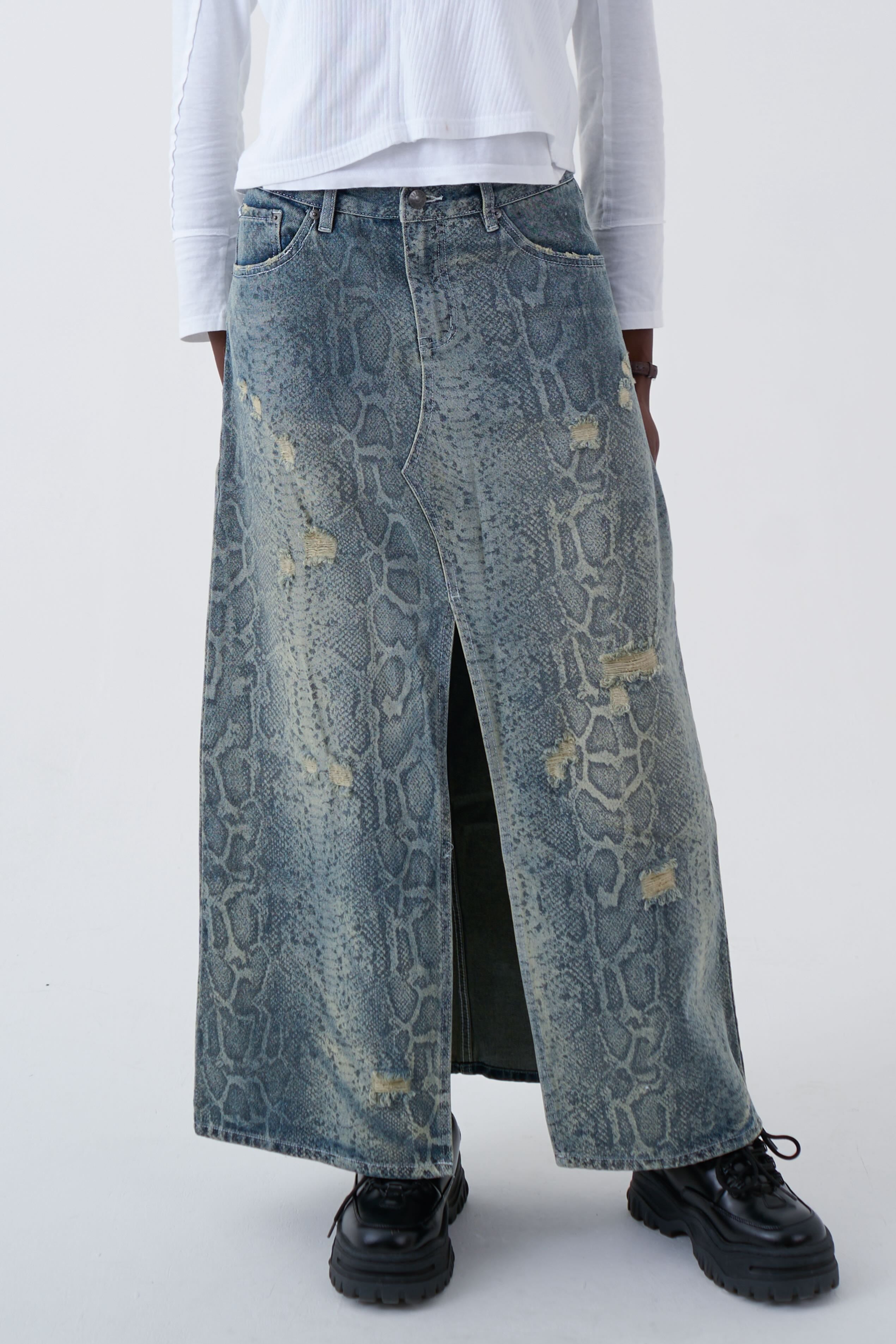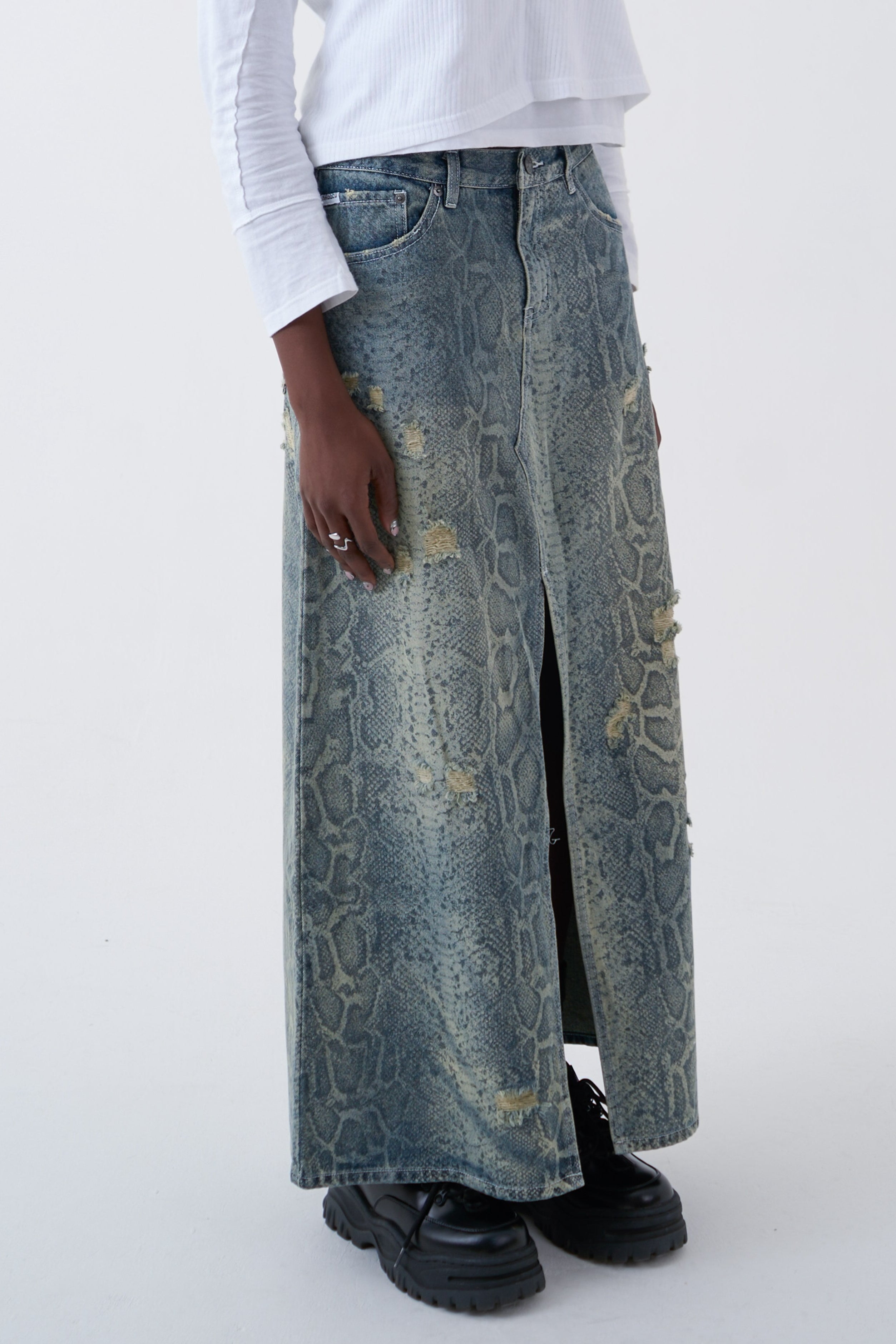 5 pocket denim maxi skirt with front split in snakeskin print, with distressed details for a grunge finish.