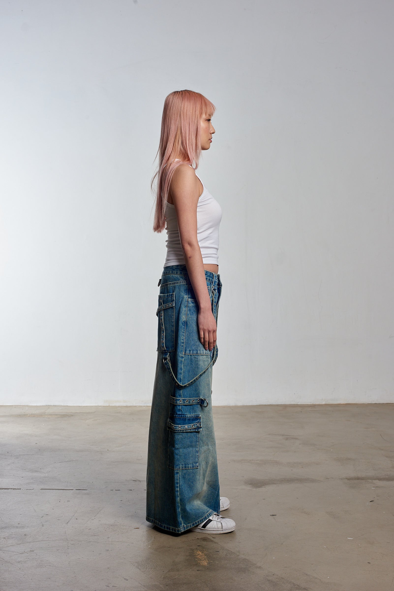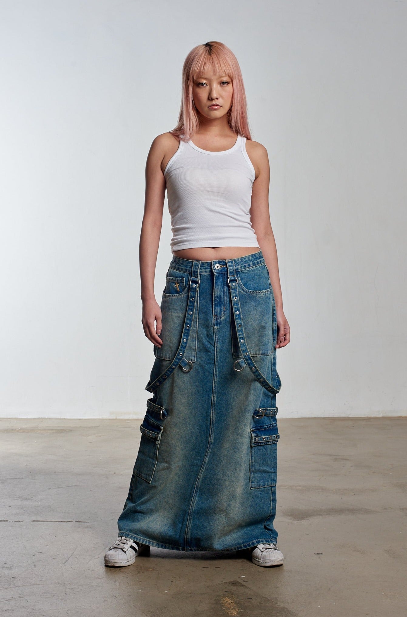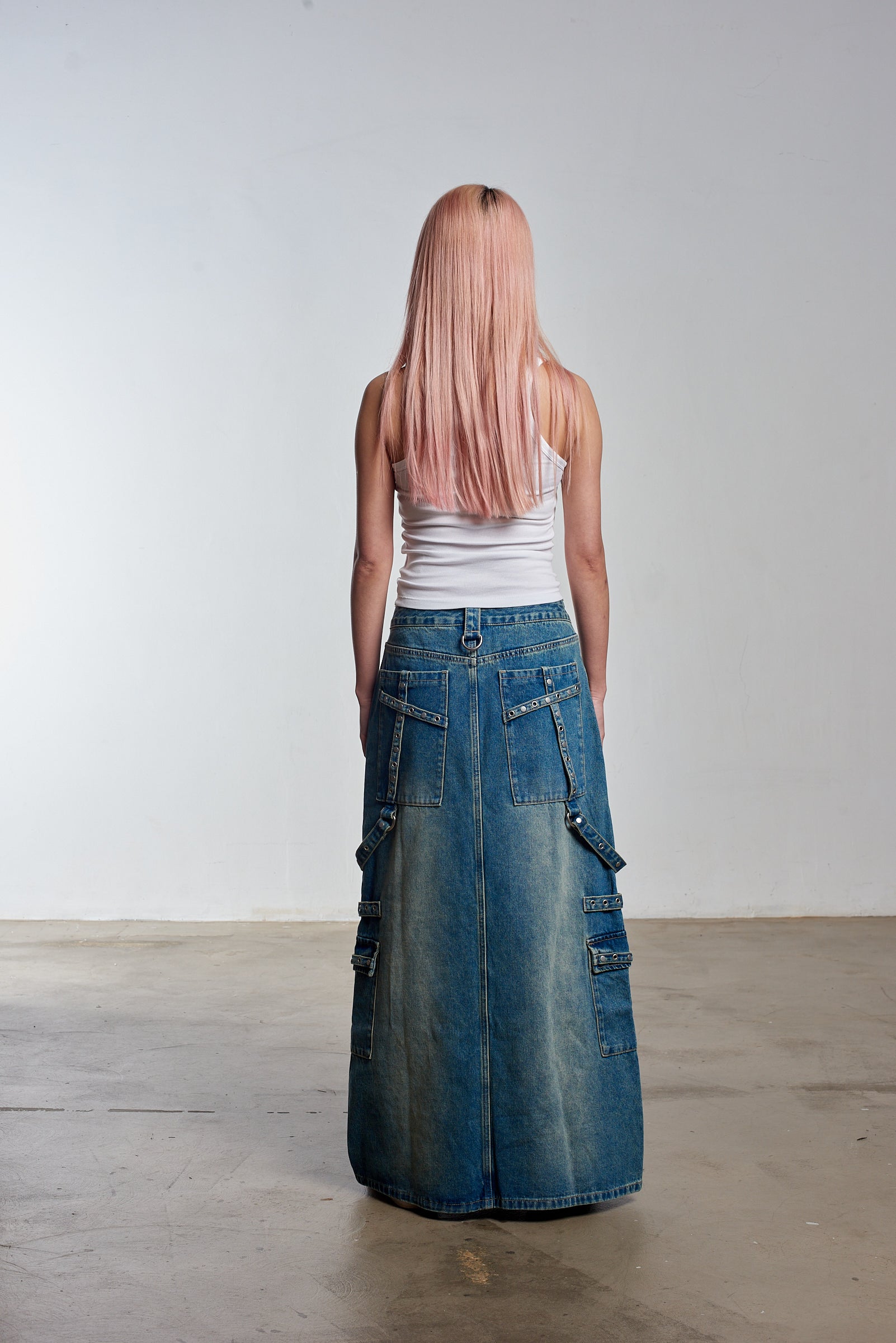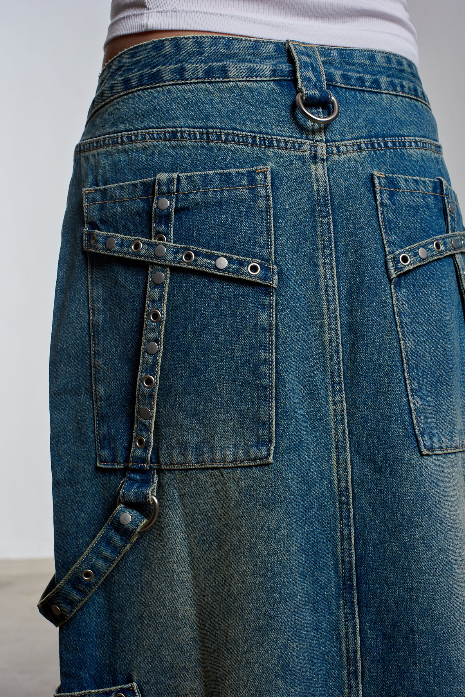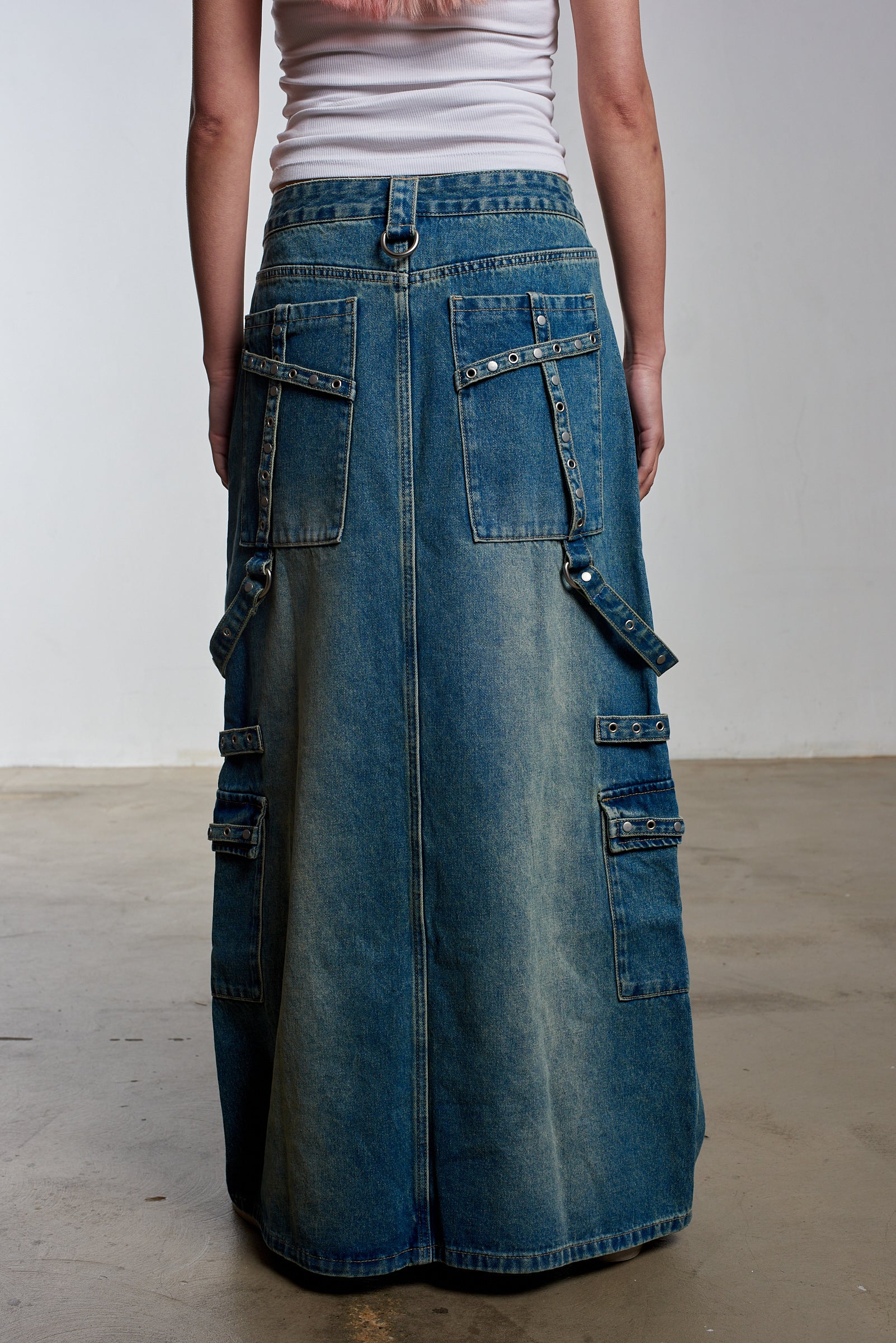 Transcend Collection: Carpenter maxi skirt in a dirty blue wash denim with hardware detail and straps and our classic "Ragged Jeans" vegan belt loop back tab.
