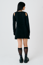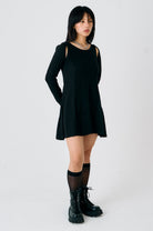 Black long sleeve mini dress with panel seams and shoulder cut out