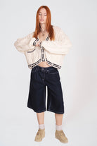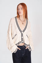 Acid washed distressed cable knit cardigan with black piping trim detail