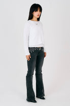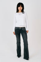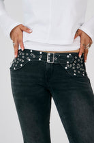 Vintage washed black bootcut flare jeans with studded eyelet detail belt. Designed in a vintage-inspired cut with a worn-in finish.