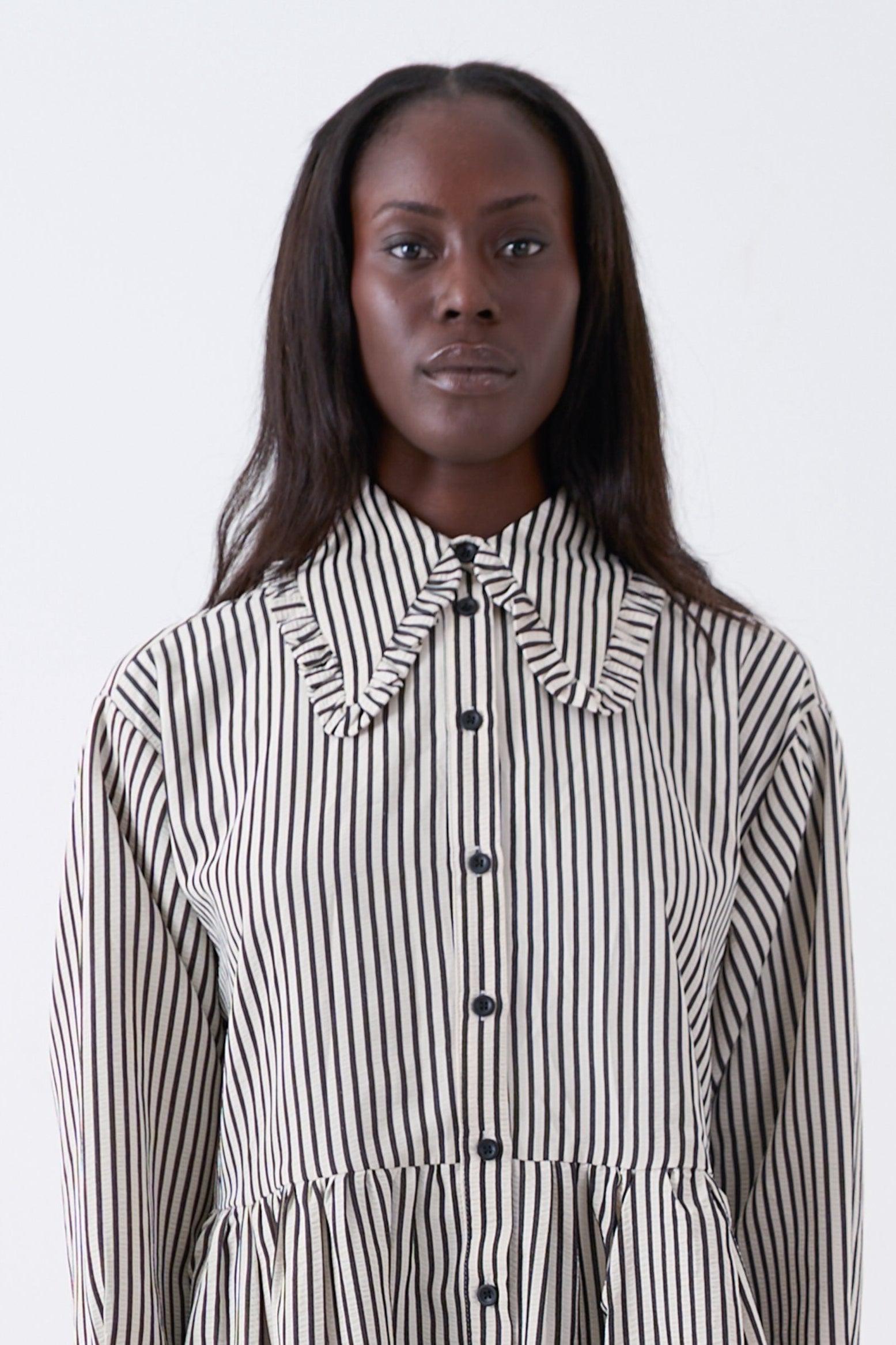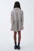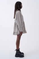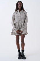 Black and white stripe mini dress, featuring an oversized collar, drop waist and ruffle hem. A grunge take on a relaxed, feminine silhouette.